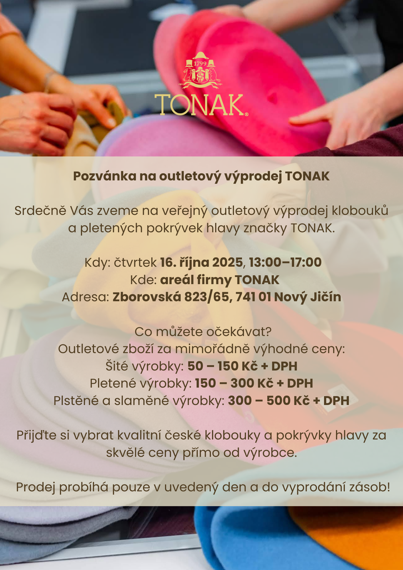 Firma TONAK zve širokou veřejnost na outletový výprodej klobouků a pletených pokrývek hlavy.