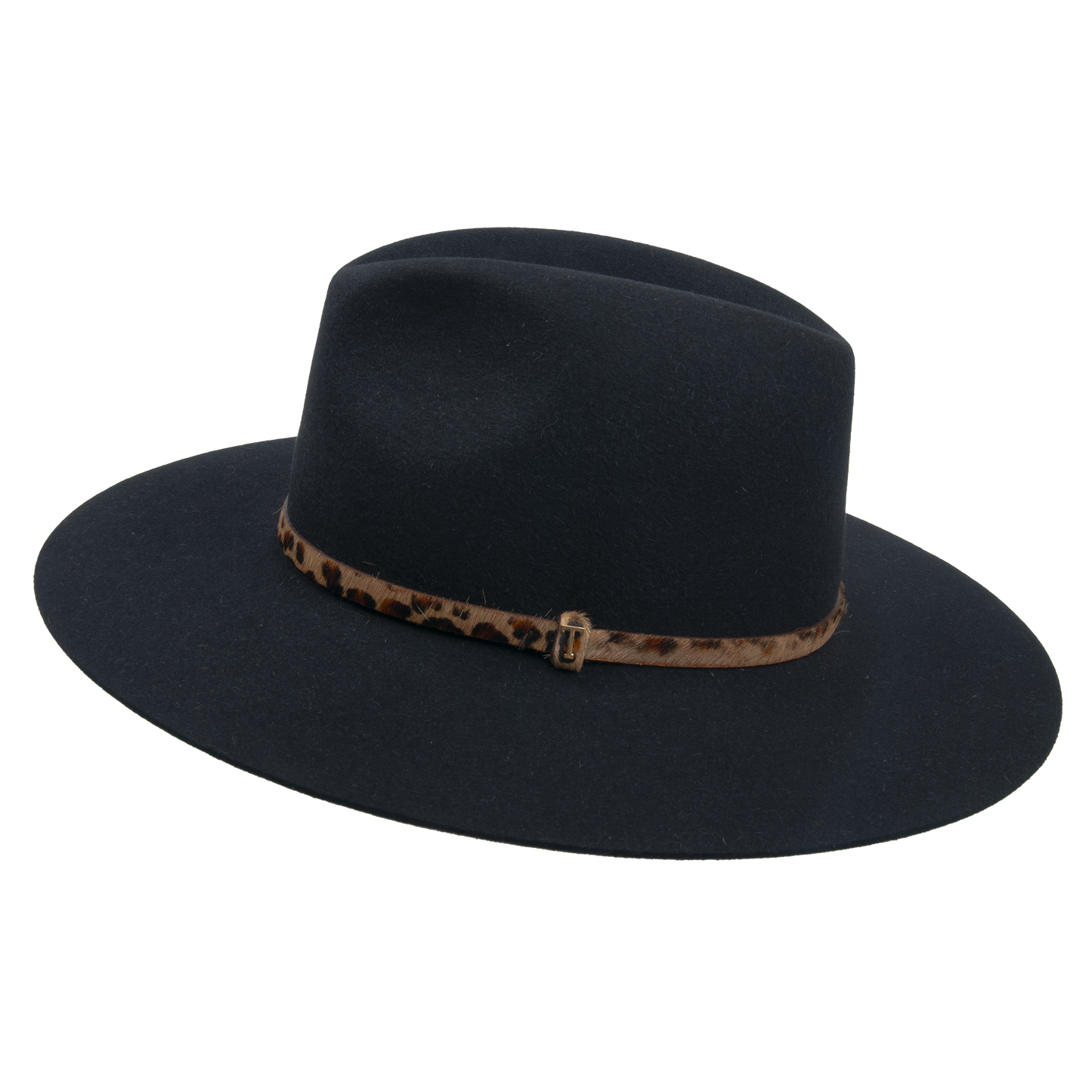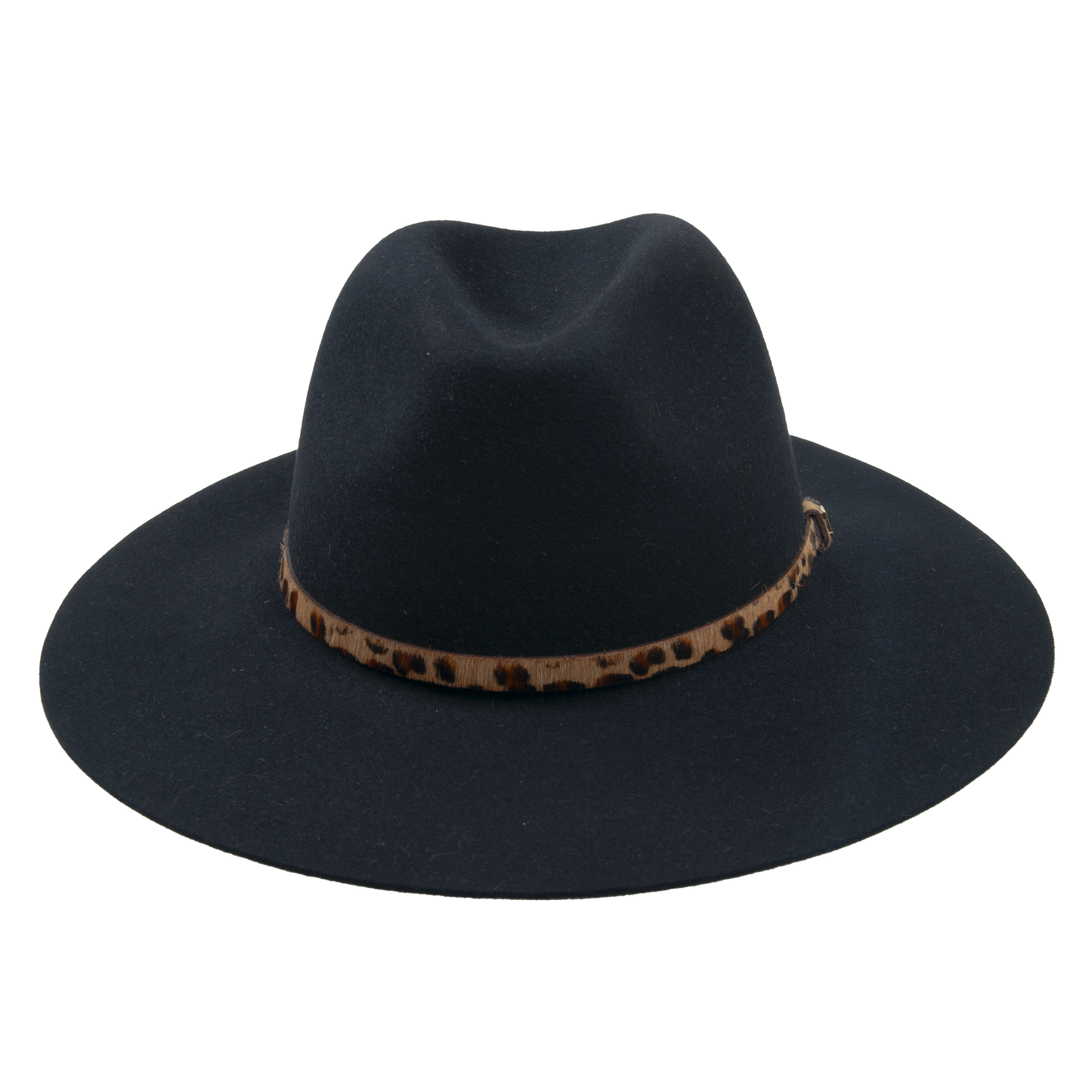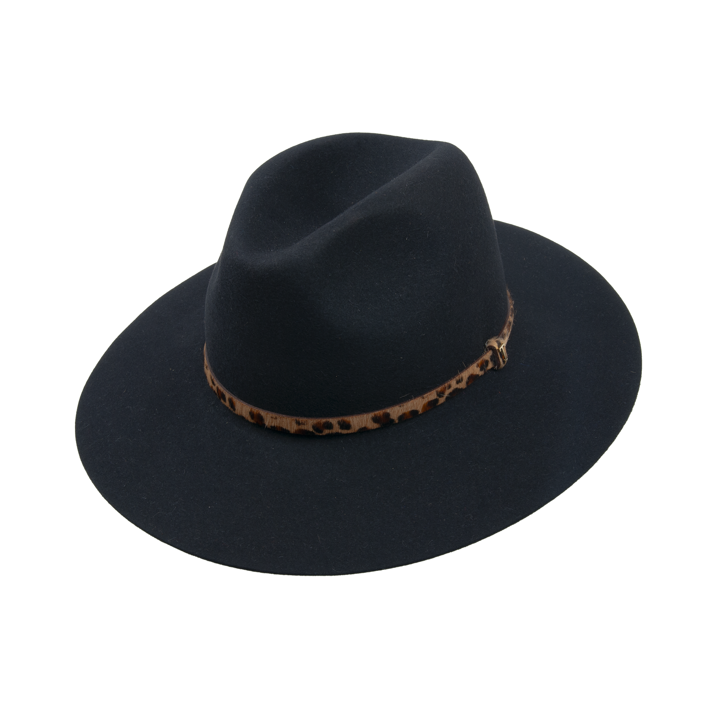 Plstěný klobouk zdobený koženým řemínkem s leopardím vzorem. Klobouk je vybaven strečovým potním páskem, šířka krempy 8-8,5 cm. Výrobek obsahuje netextilní části živočišného původu.