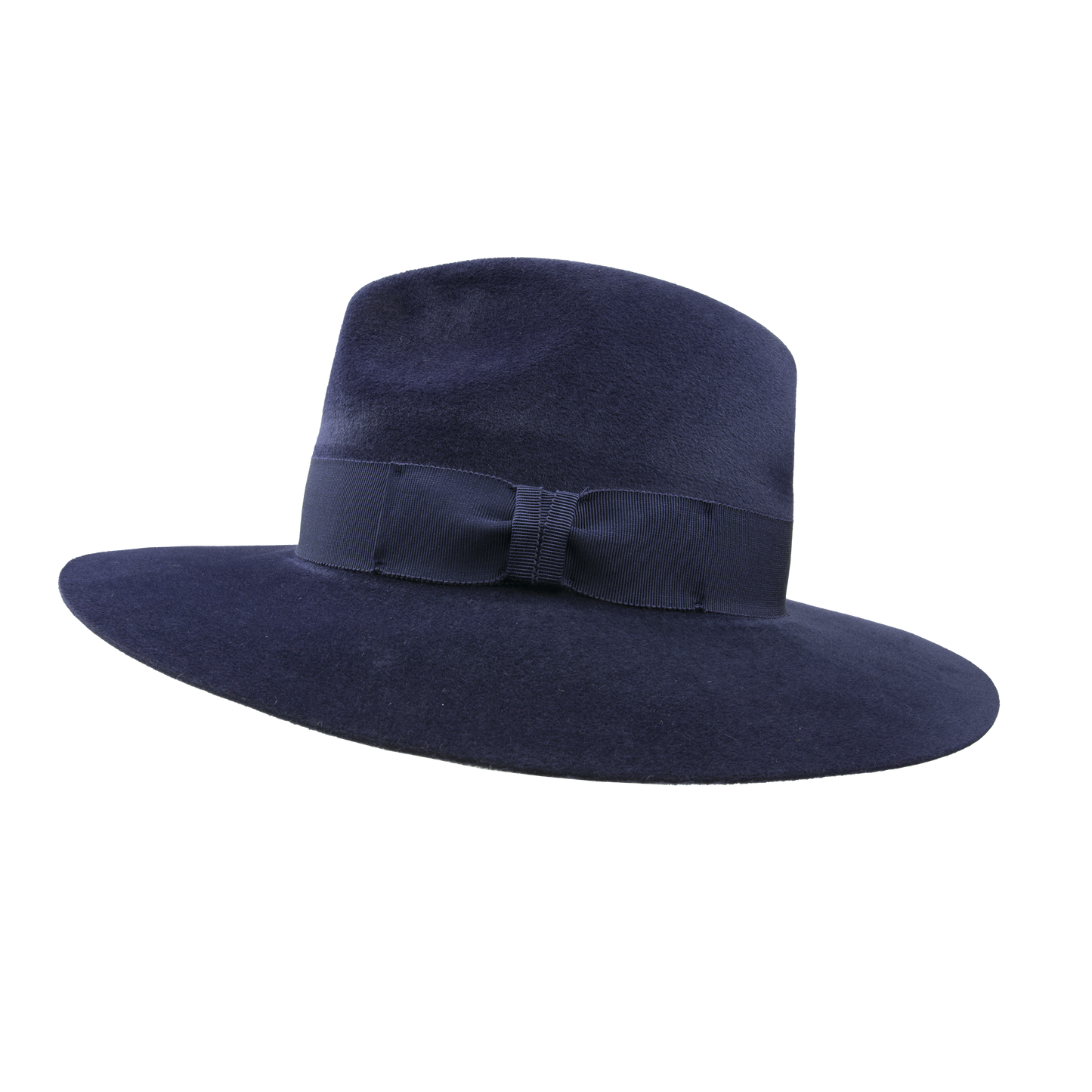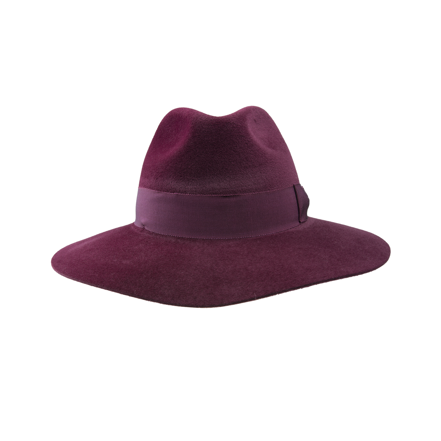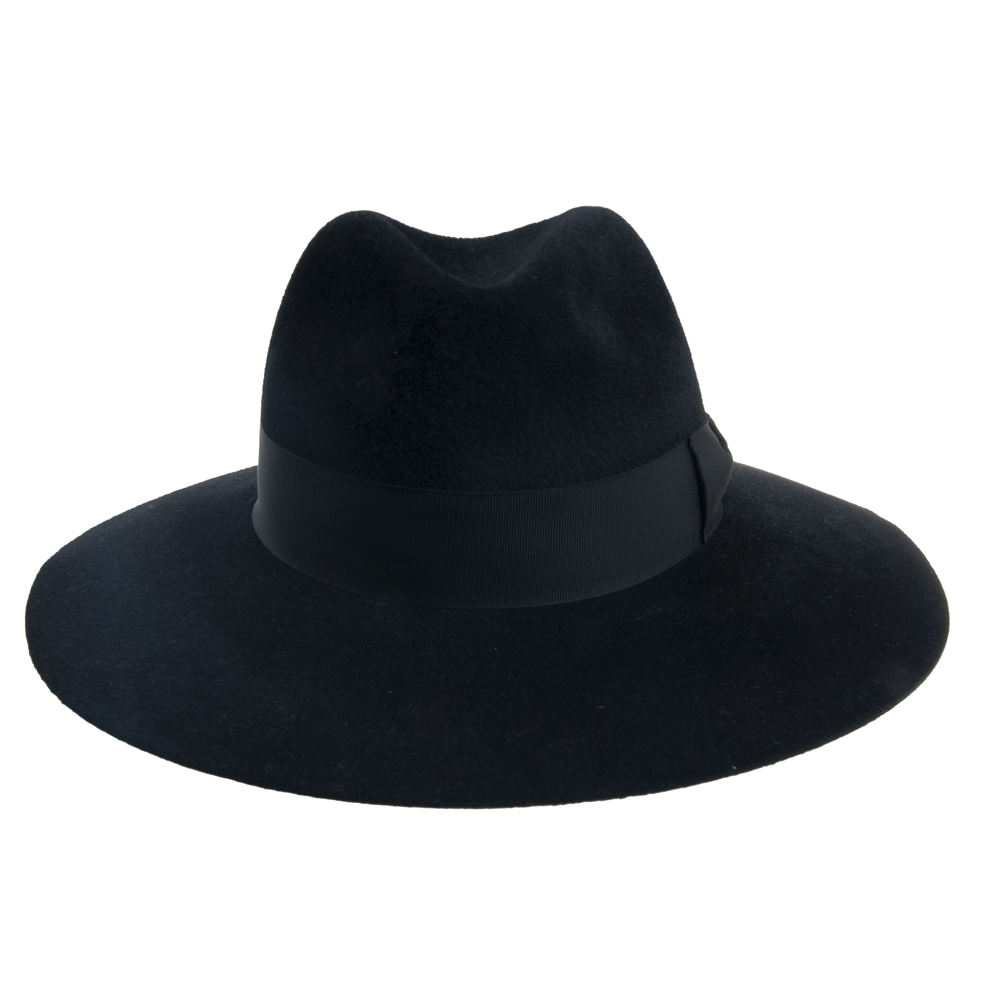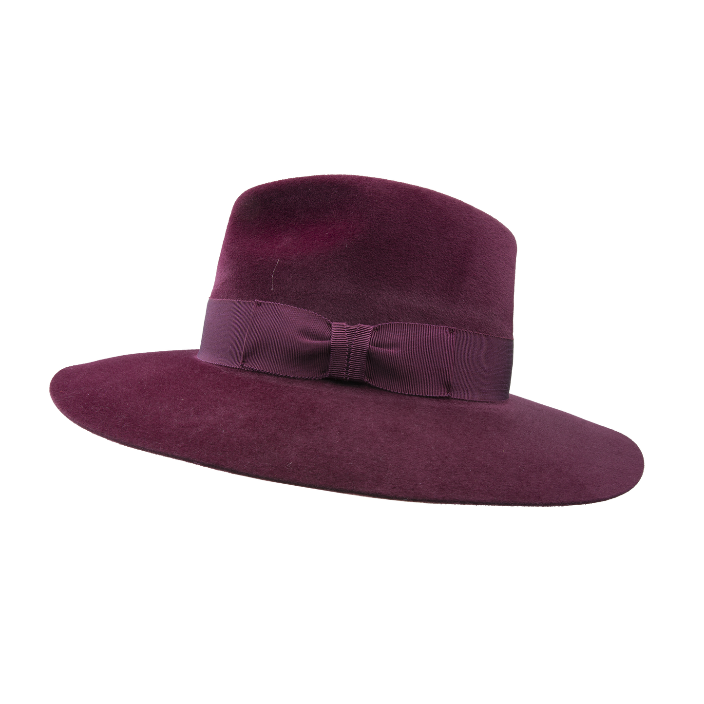 Velurový klobouk z měkčí plsti s látkovým potním páskem zdobený pasentní rypsovou stuhou. Šířka krempy 8,5-9 cm.