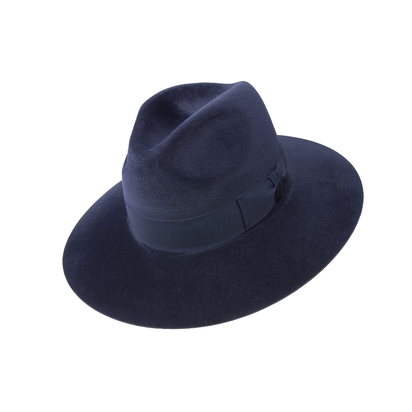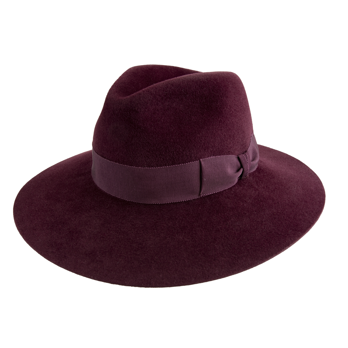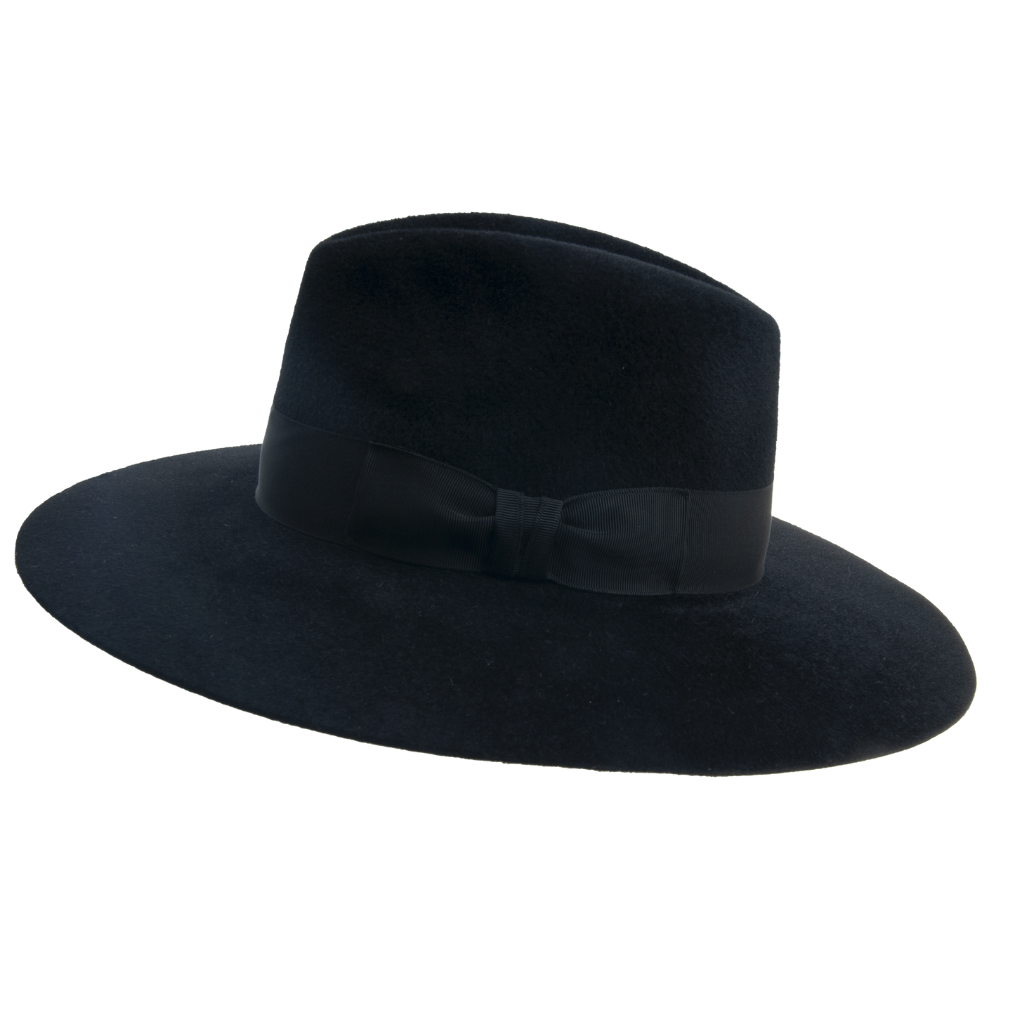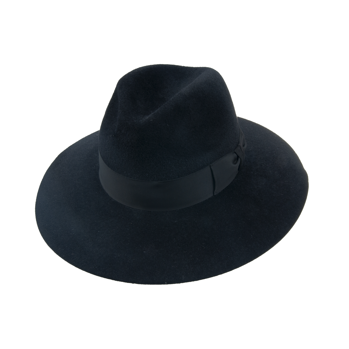 Velurový klobouk z měkčí plsti s látkovým potním páskem zdobený pasentní rypsovou stuhou. Šířka krempy 8,5-9 cm.
