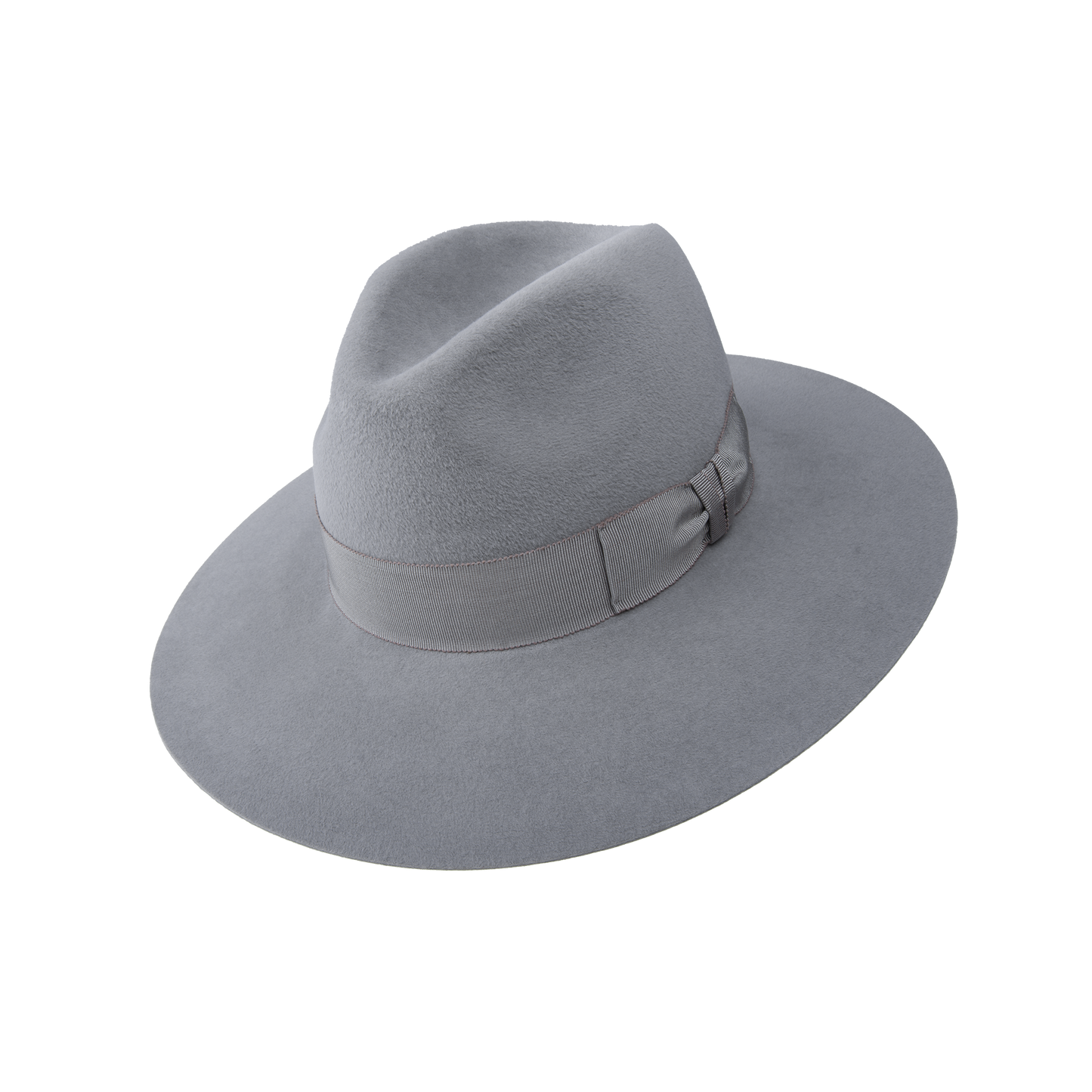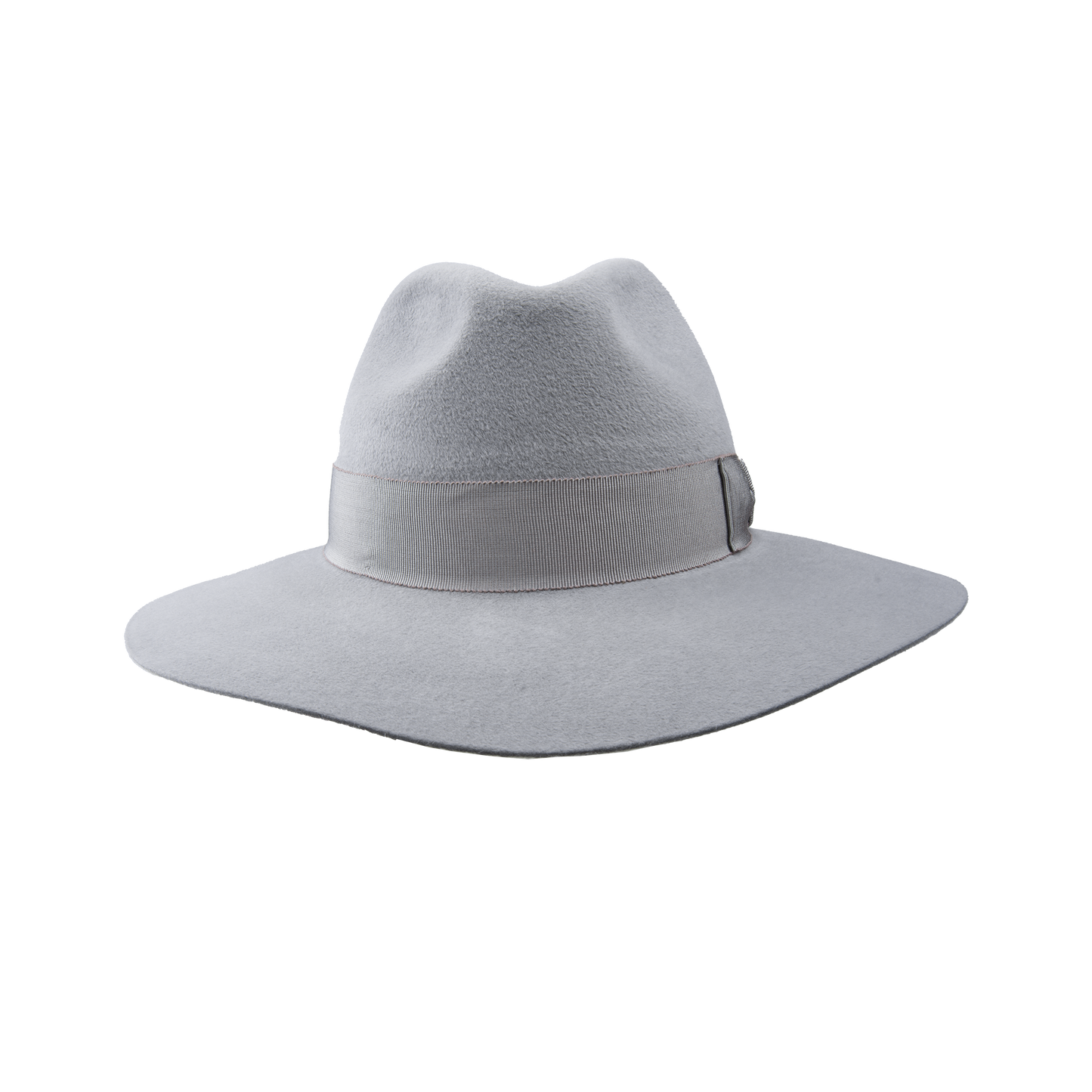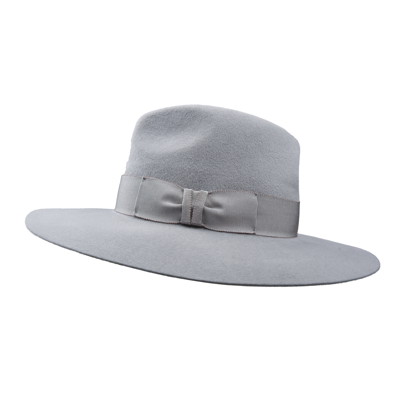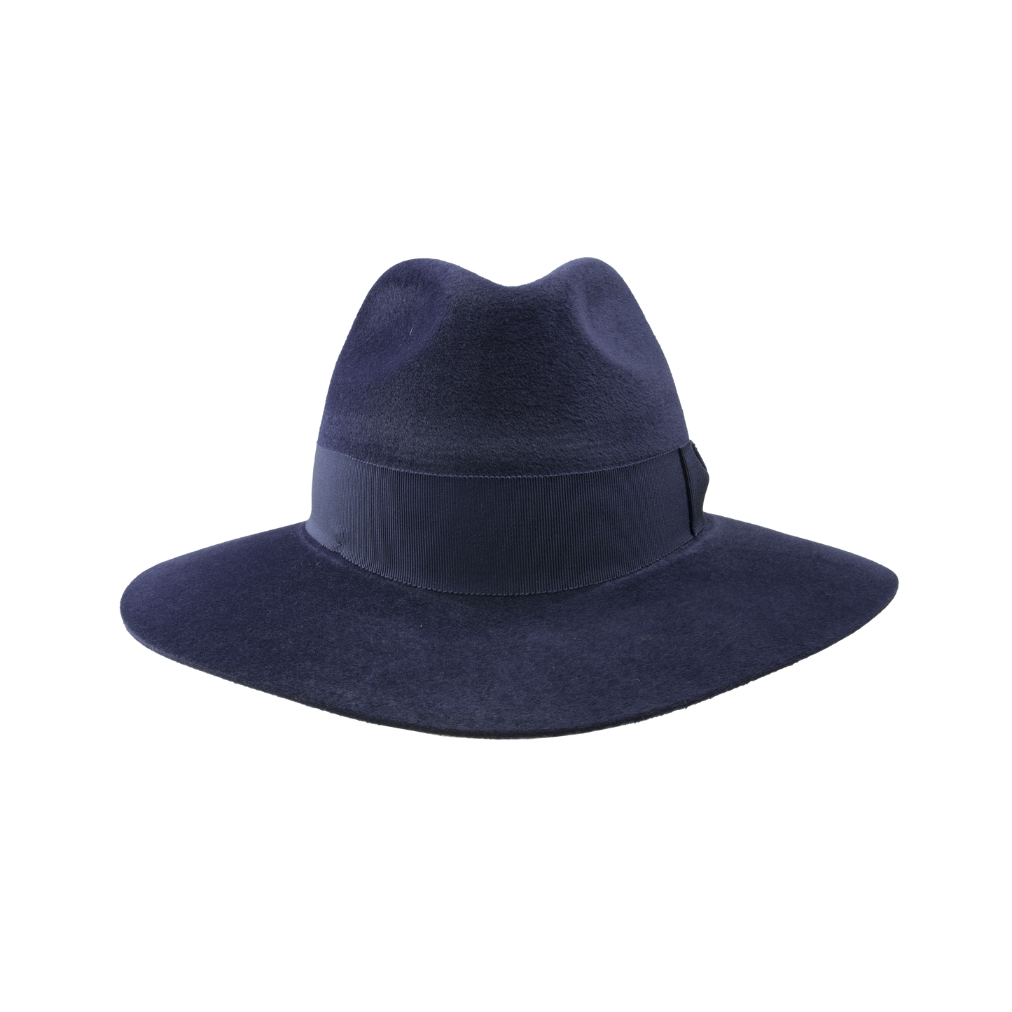 Velurový klobouk z měkčí plsti s látkovým potním páskem zdobený pasentní rypsovou stuhou. Šířka krempy 8,5-9 cm.