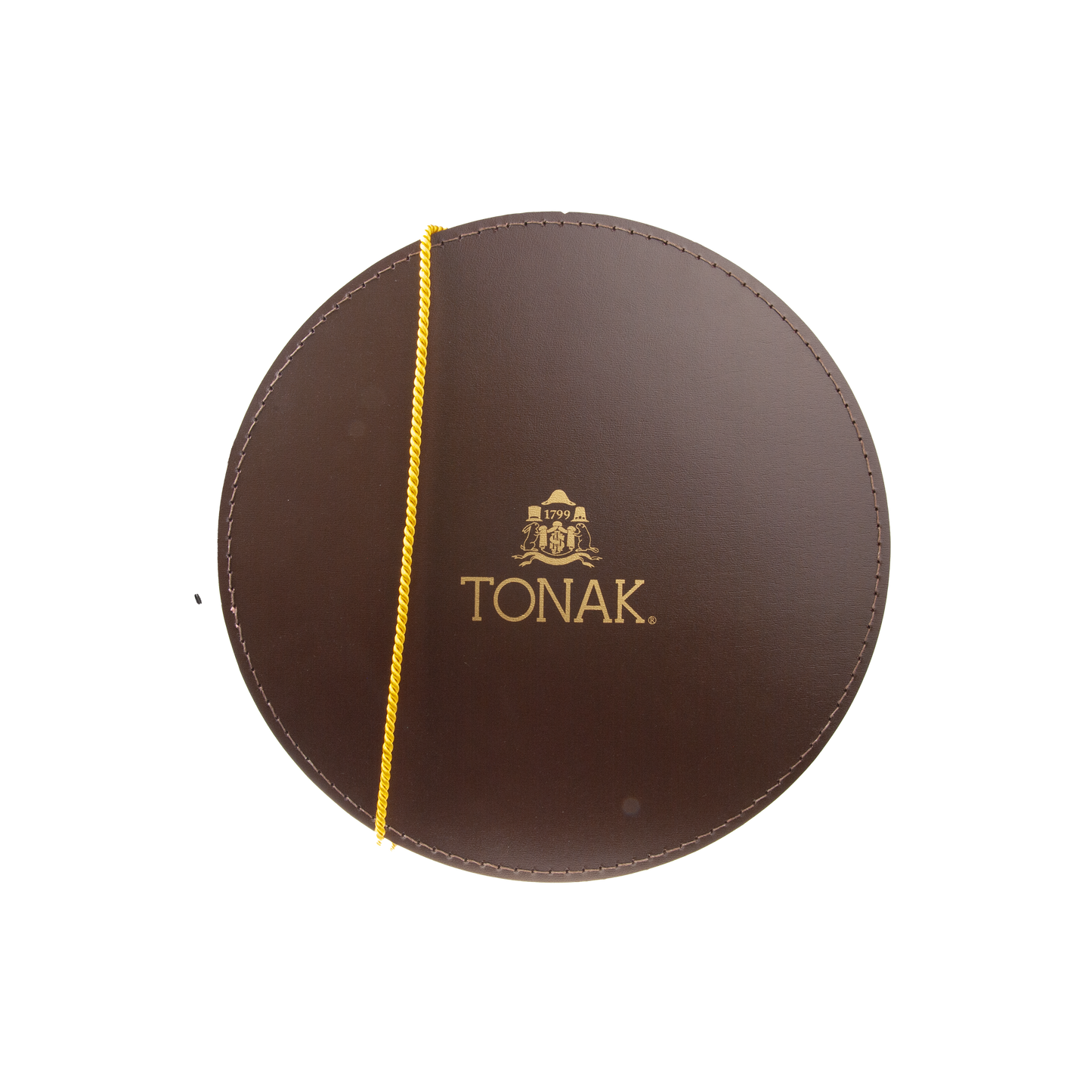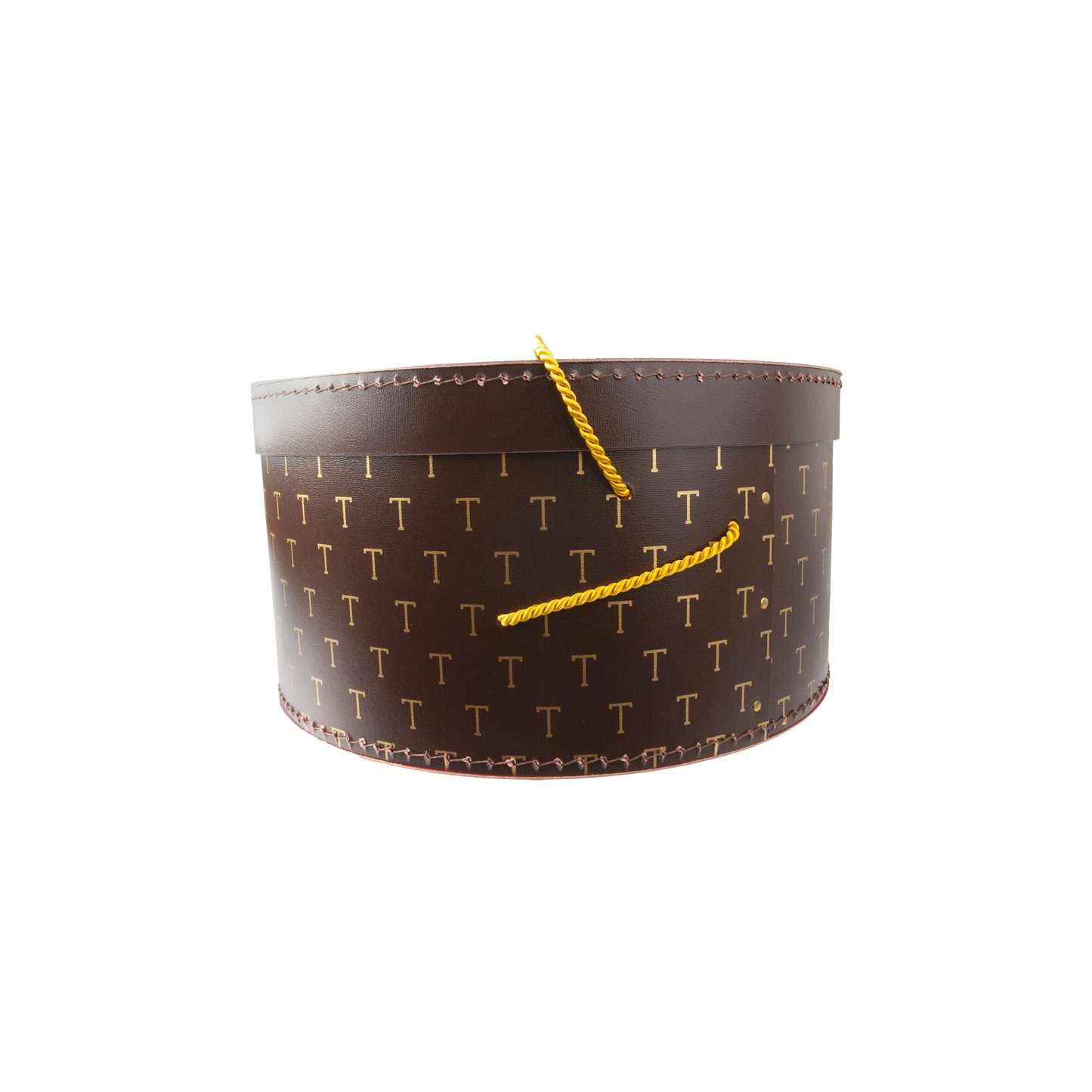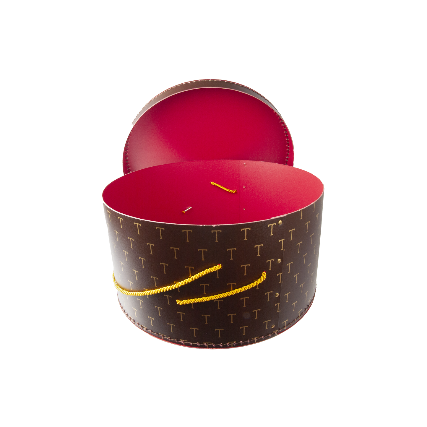 Klobouková krabice z lakované lepenky s víkem, po stranách a na víku atlasové šňůry na uchopení. Průměr krabice 40 cm, výška 20,5 cm.