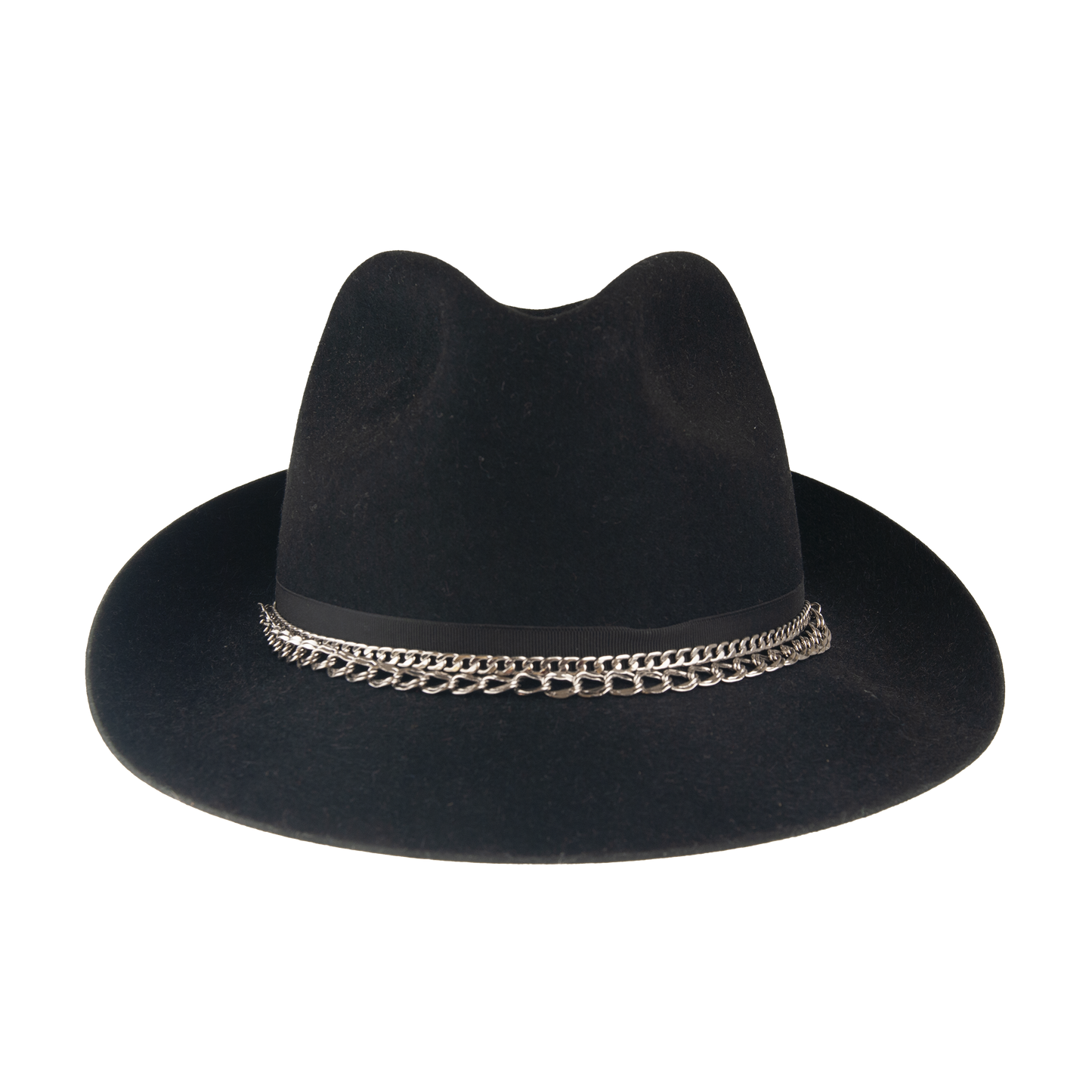 Luxusní plstěný klobouk Gia je nutným kouskem do vašeho šatníku. Tento klobouk má hned několik luxusních a jedinečných prvků, kterými jednoznačně ohromíte. Klobouk je zdobený decentní černou stuhou a stříbrným dvojitým řetízkem. Zároveň je vybaven odepínatelným řetízkem i ve spodní části. Lze si tedy zvolit ze dvou variant, jak klobouk nosit. Vrchní strana okraje má unikátní povrchovou úpravu soleil, která tak ještě podtrhuje zdobení tohoto klobouku. Výrobek obsahuje netextilní části živočišného původu.