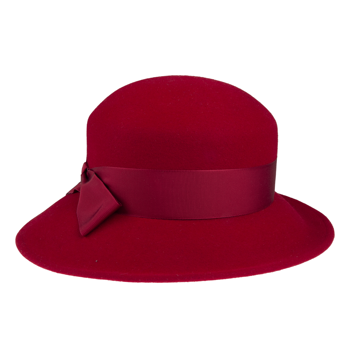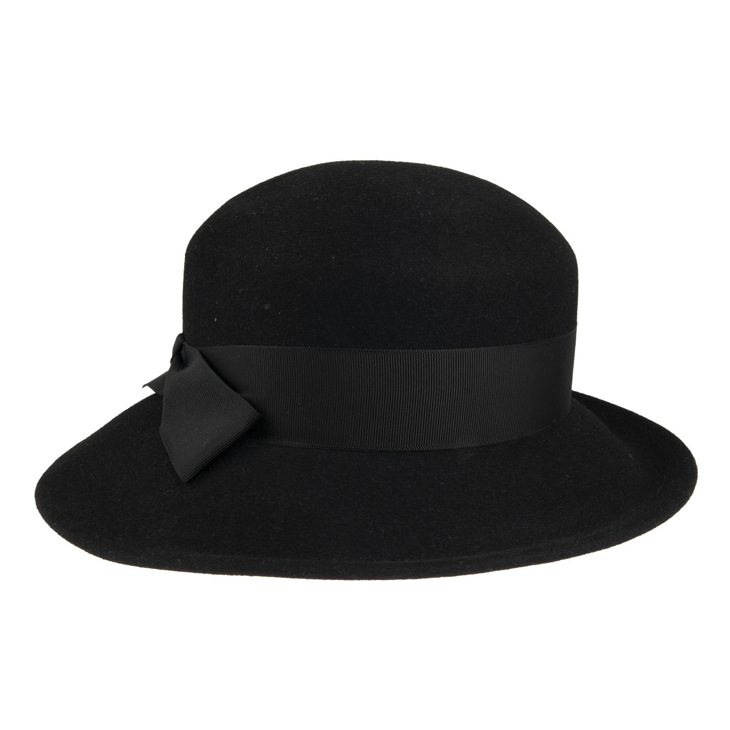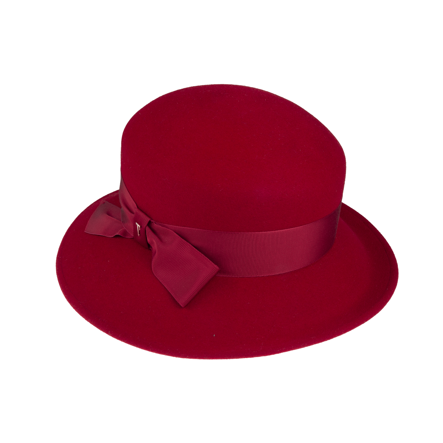 Women's felt hat with slightly asymmetrical brim decorated with hat ribbon and bow. The hat is equipped with an elastic sweat band.