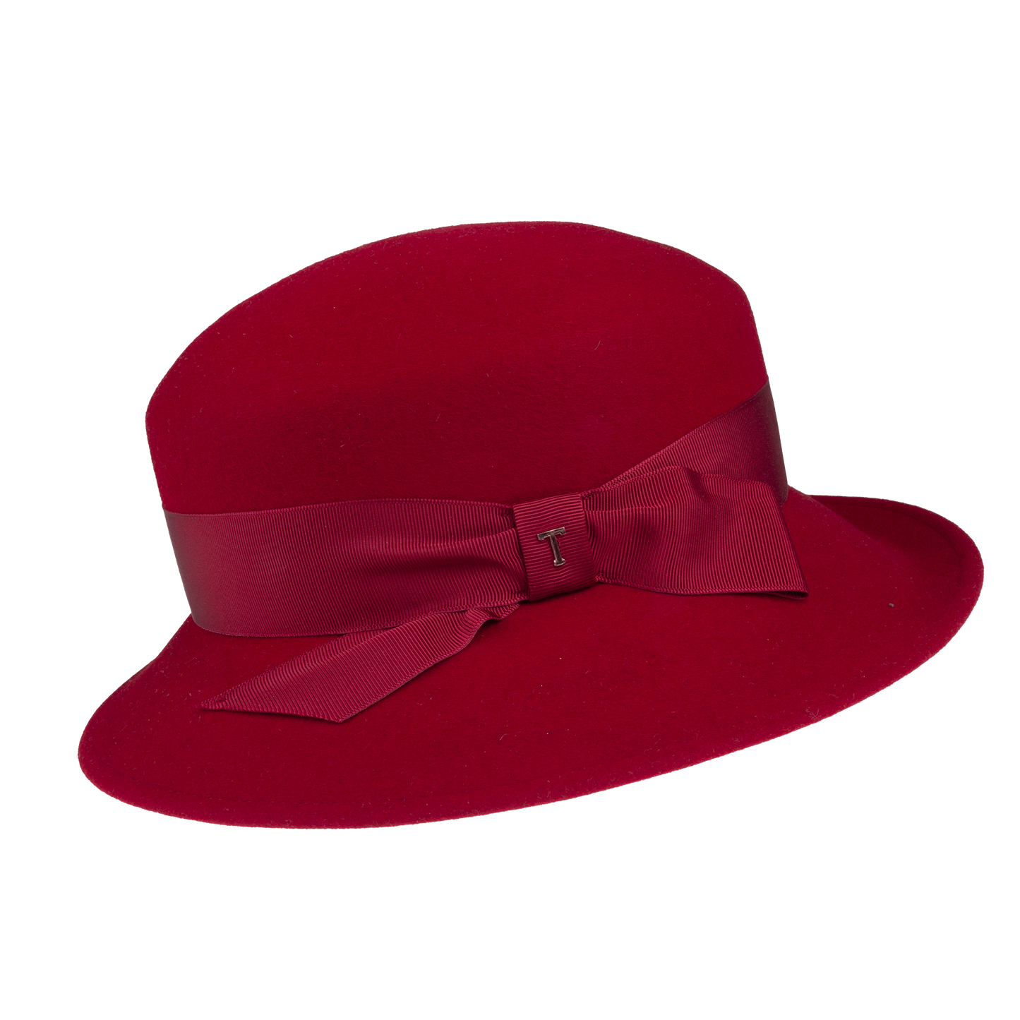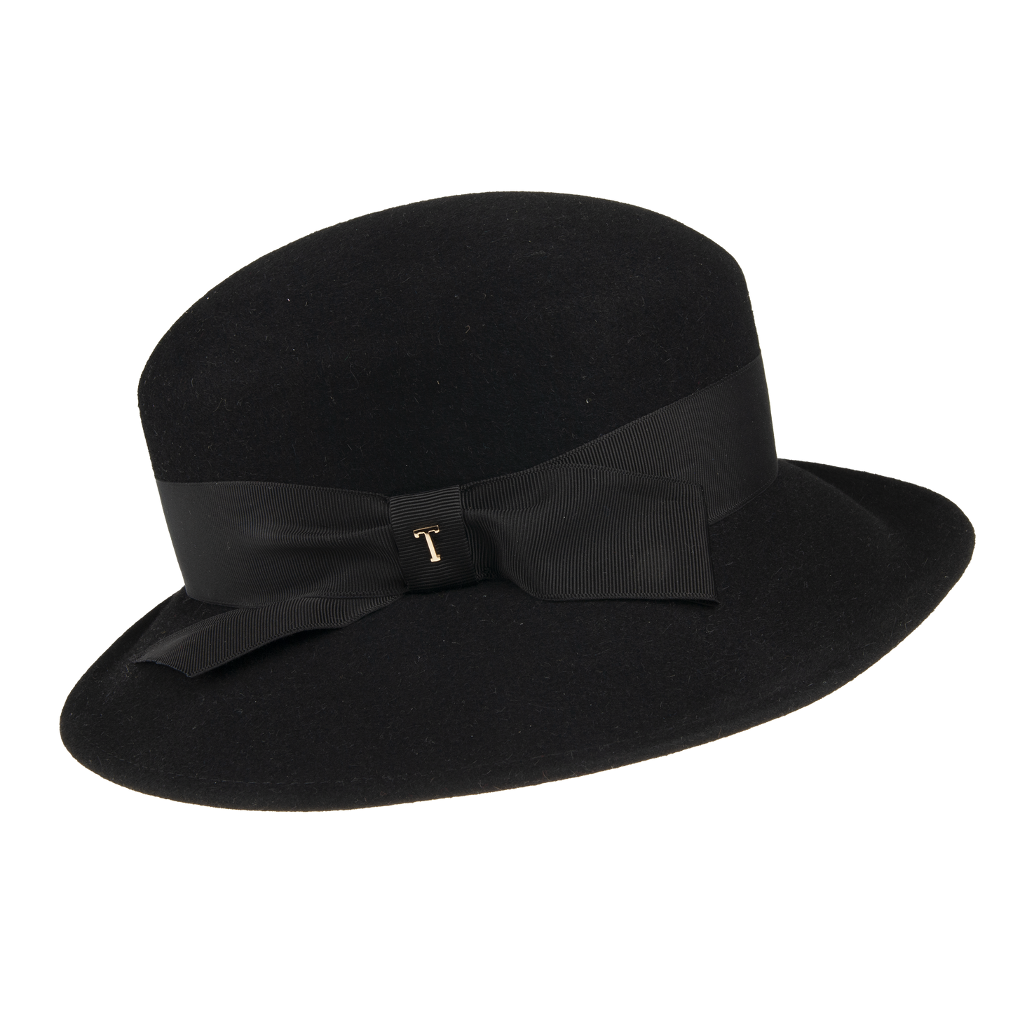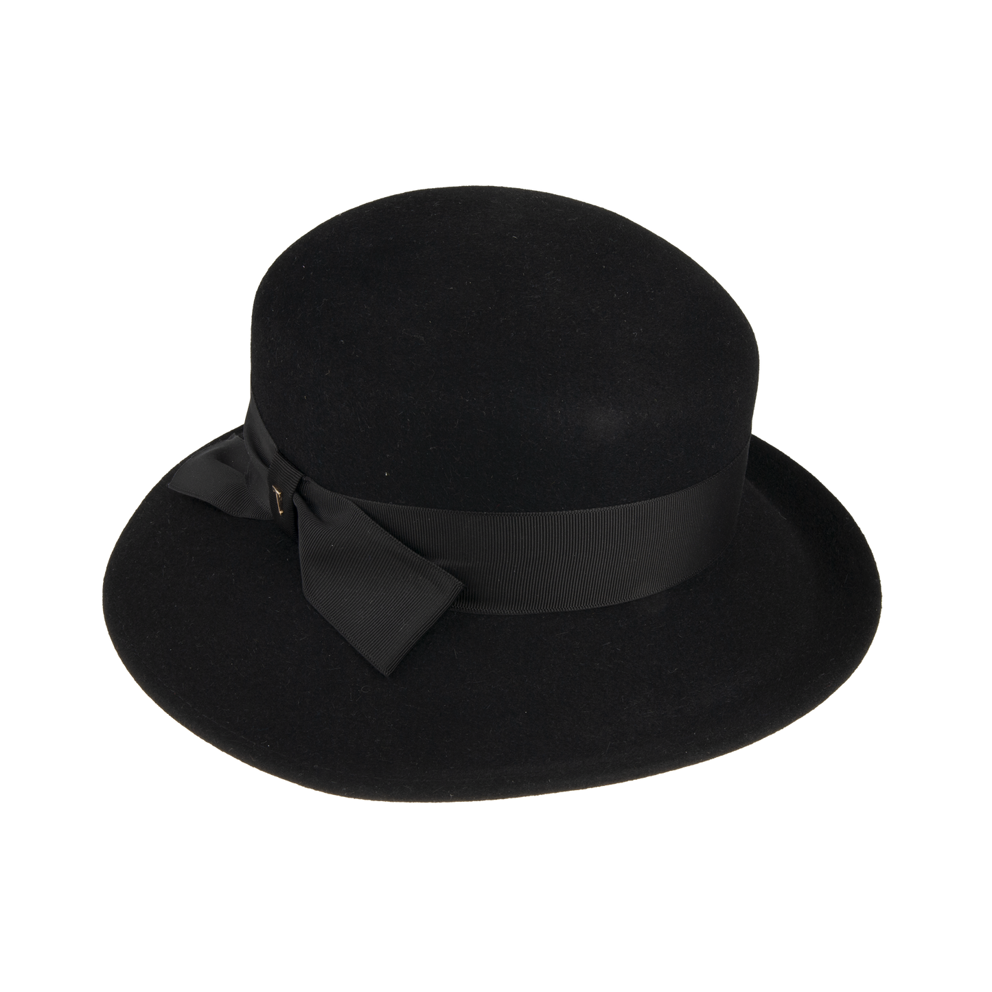 Women's felt hat with slightly asymmetrical brim decorated with hat ribbon and bow. The hat is equipped with an elastic sweat band.
