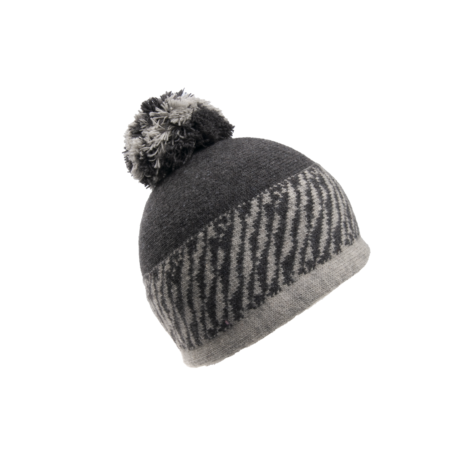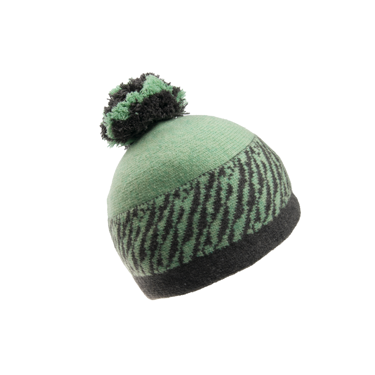Cap with zebra pattern at the bottom edge with fleece sweat band decorated with striped pompon.