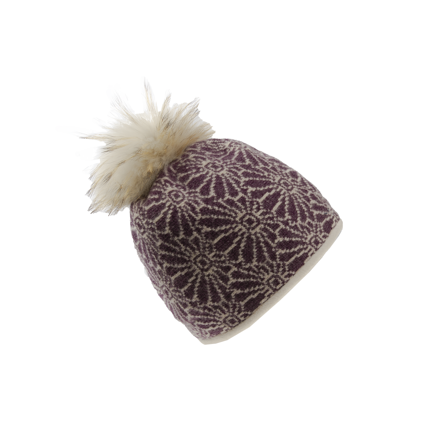 Purple cap in romantic white flower motif for decorating every winter outfit. The fashionable white pompom adds elegance and originality. It has fleece lining. It contains non-textile parts of animal origin.