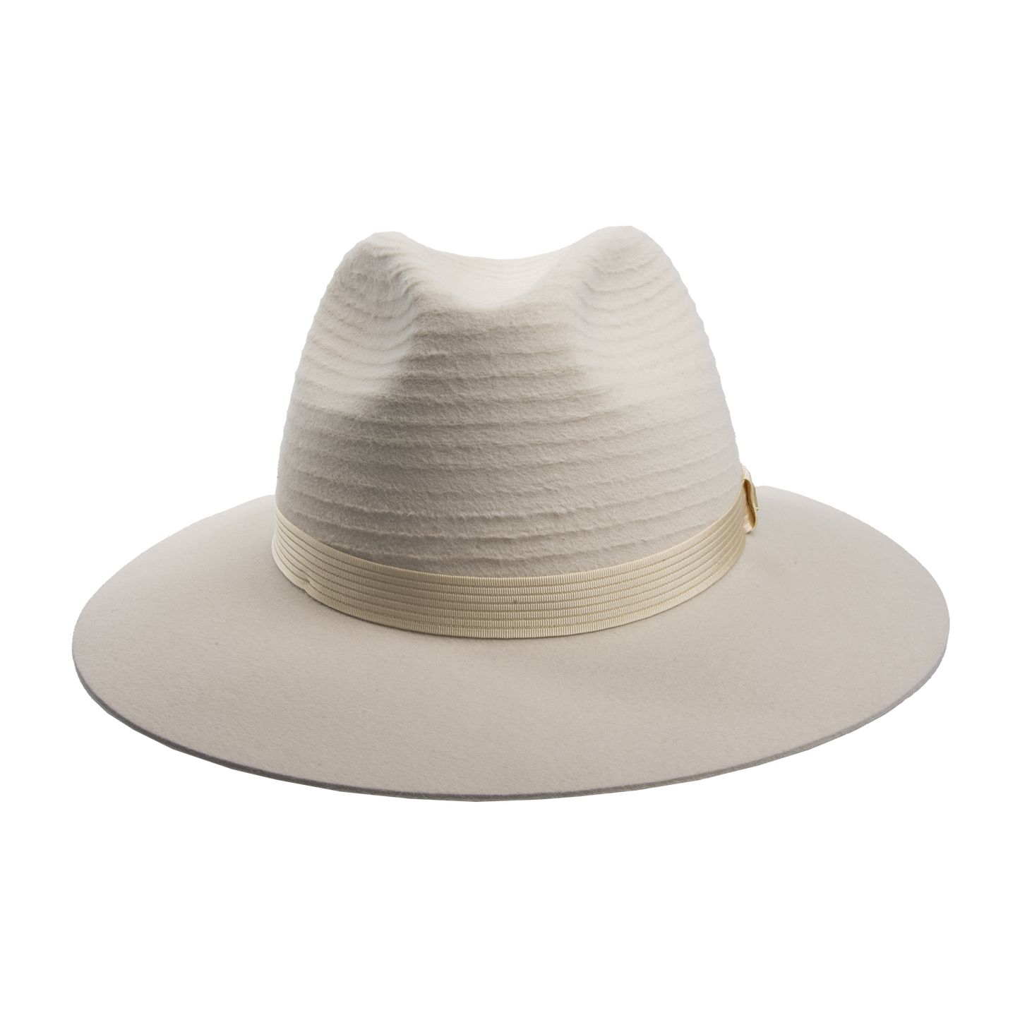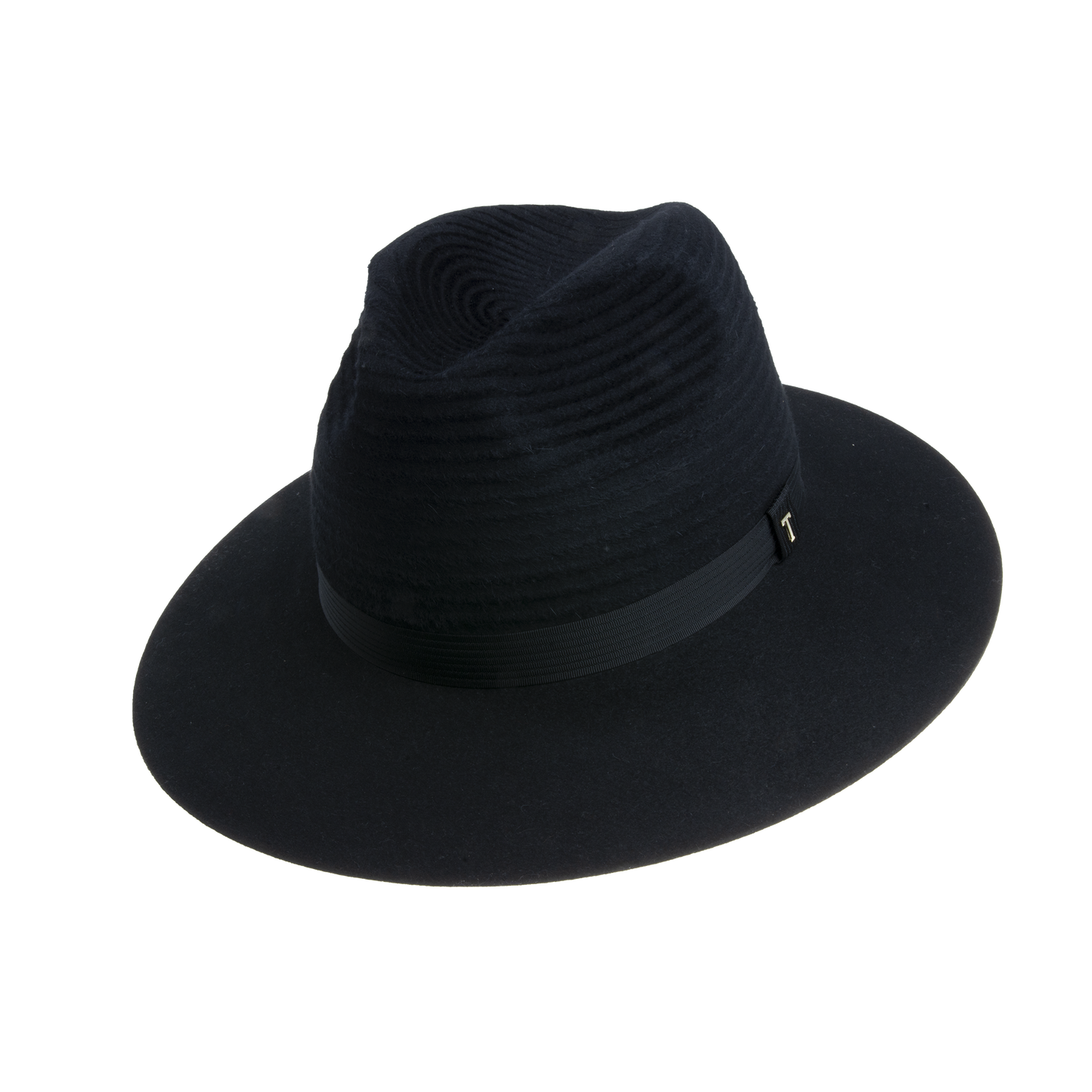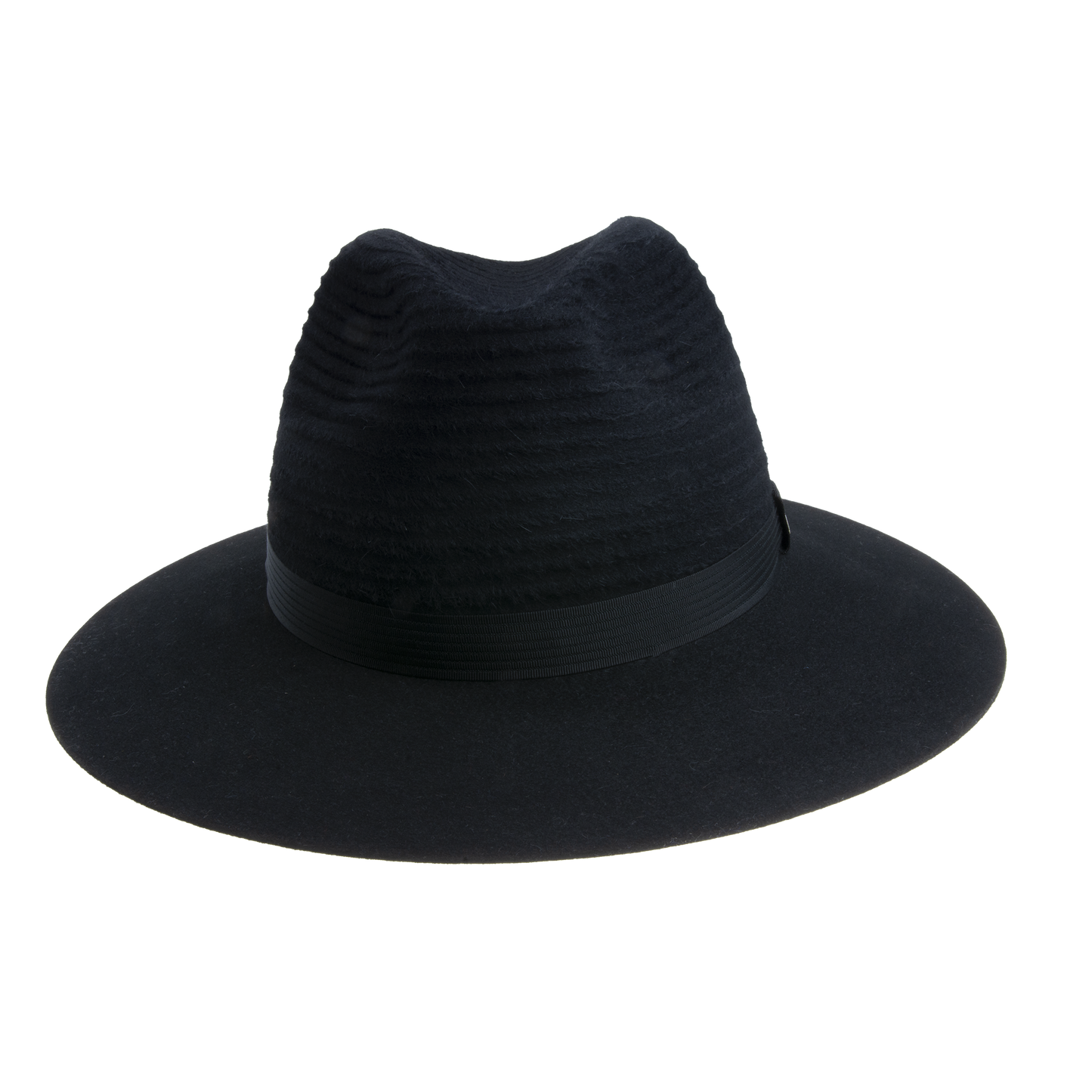 Textured indentation of the hat's head and the two soft beige or black shades are the hallmarks of Fedora Esprite Plan. The in-tone decorative ribbon and a T pin simply underline the elegance of this hat. The width of the brim 7,5 - 8 cm.