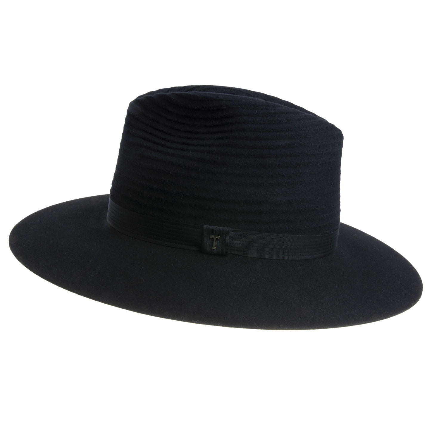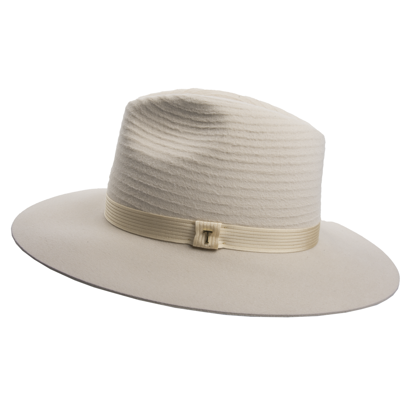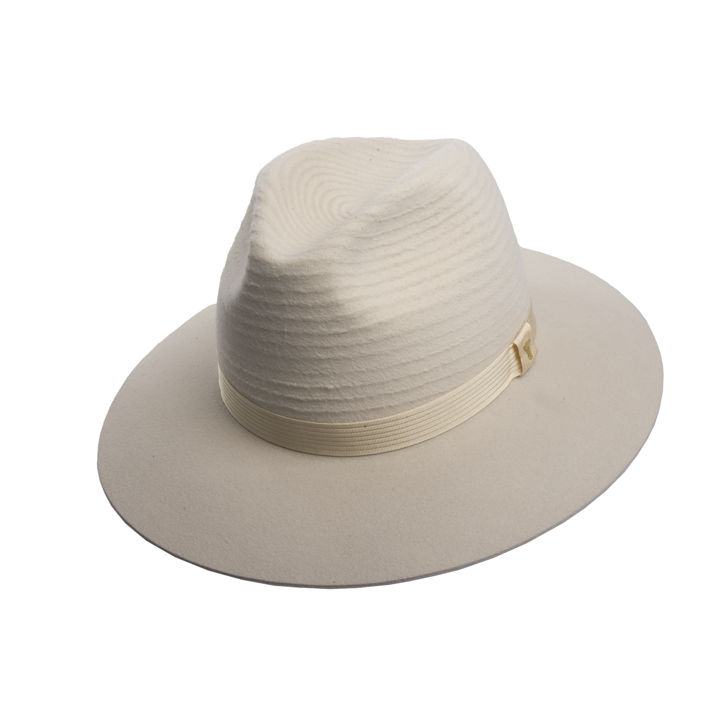 Textured indentation of the hat's head and the two soft beige or black shades are the hallmarks of Fedora Esprite Plan. The in-tone decorative ribbon and a T pin simply underline the elegance of this hat. The width of the brim 7,5 - 8 cm.