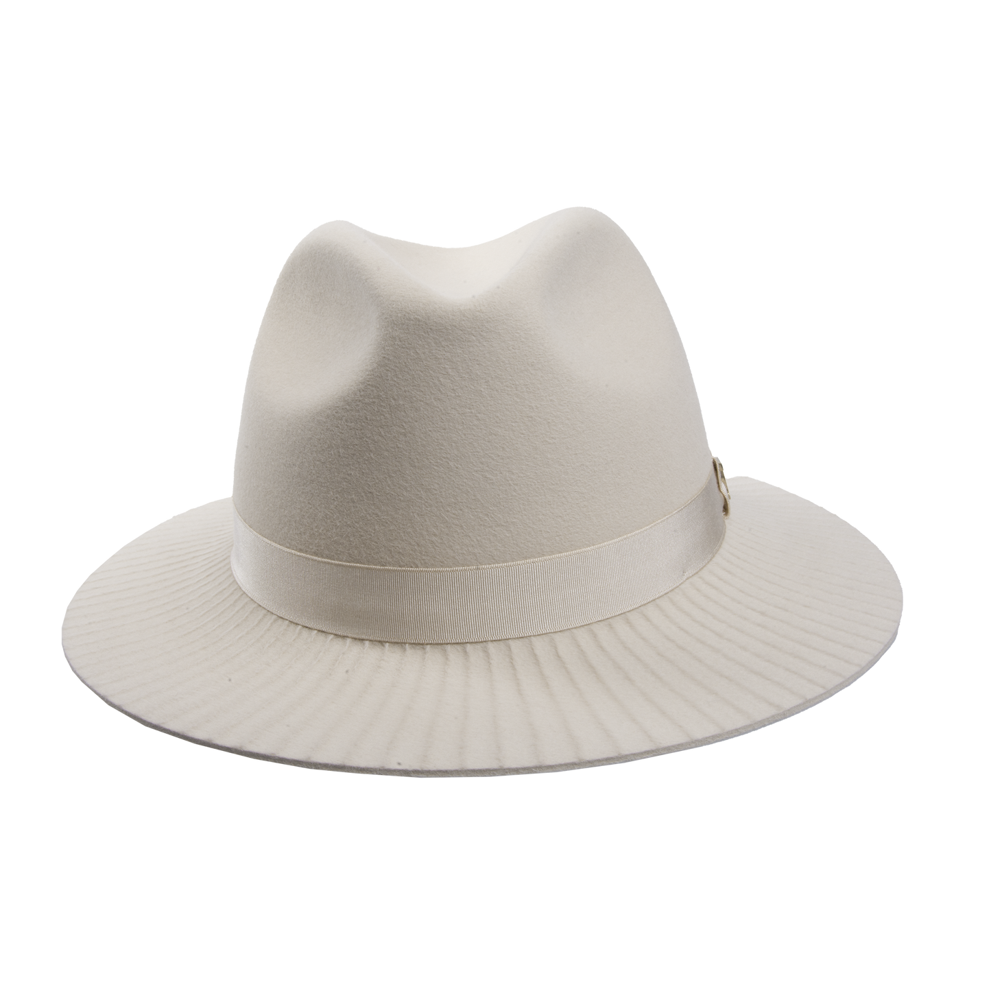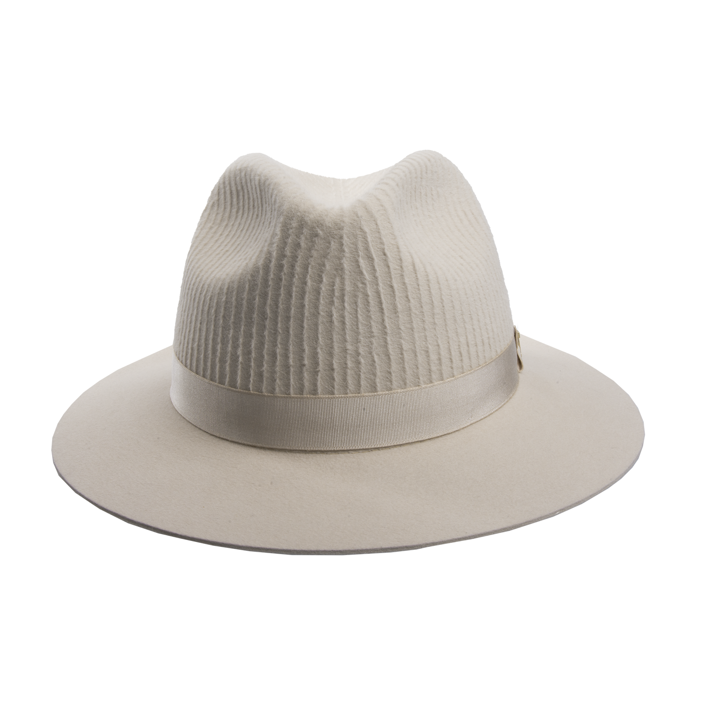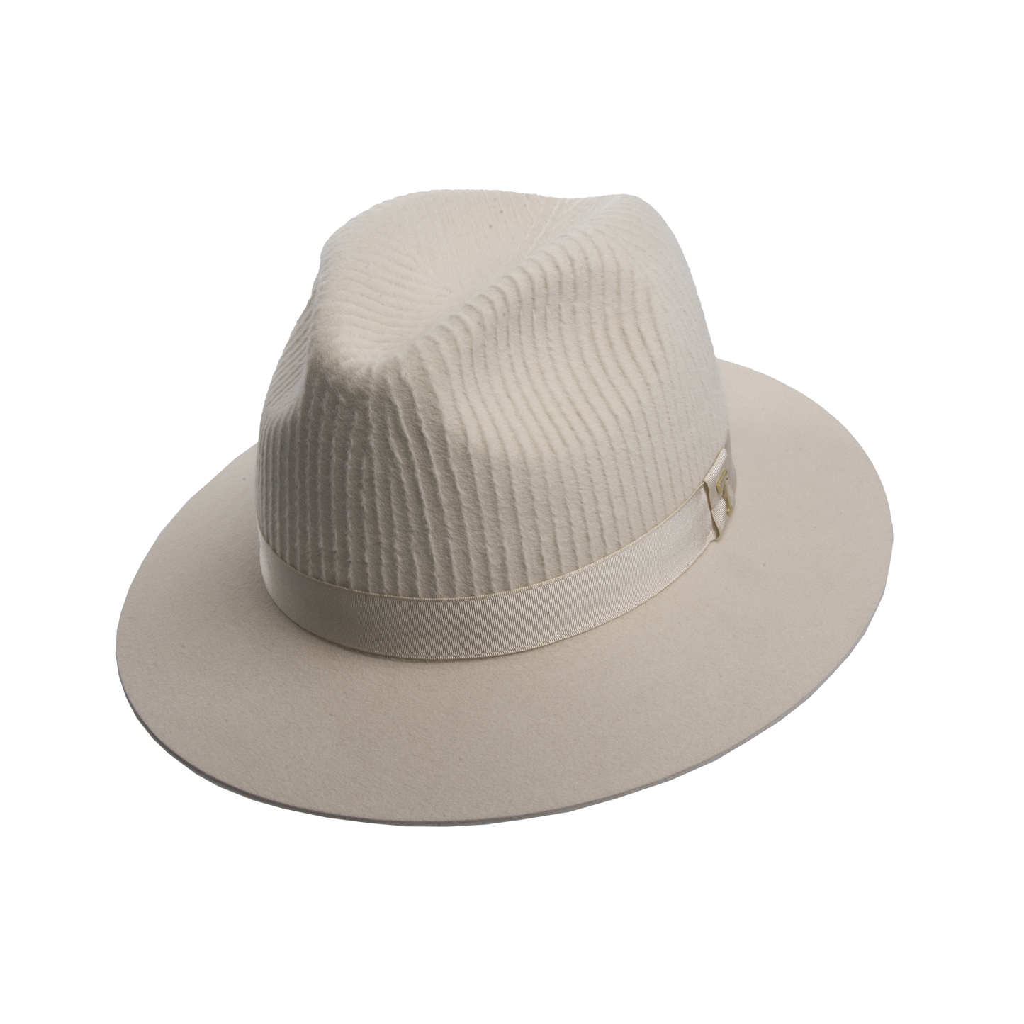 This classic Fedora with a medium wide brim (6,5 cm) is original thanks to the textured indentation. This finish makes the Fedora Esprite Vertical a unique model and slightly different from the black or cream hat.