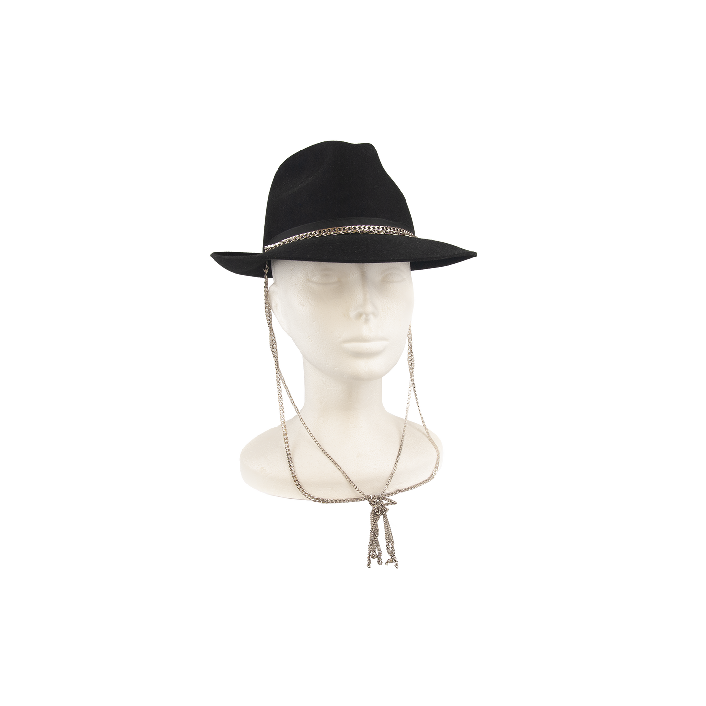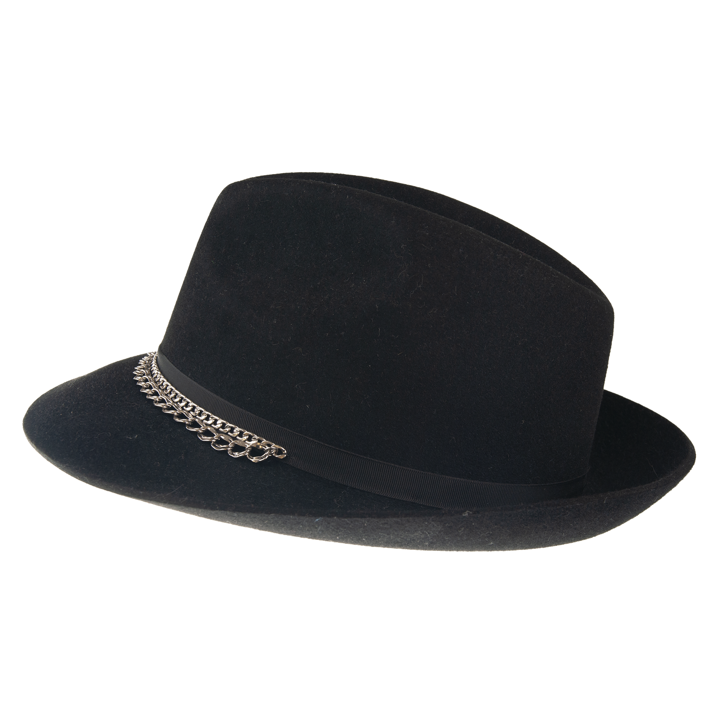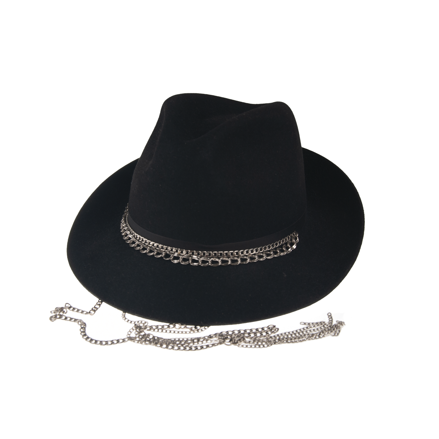 This luxurious felt hat Gia is a must-have piece for your wardrobe. This hat has several luxurious and unique elements that will undoubtedly impress. The hat is adorned with a subtle black ribbon and a silver double chain. Furthermore, it is equipped with a detachable chain at the bottom, allowing you to choose from two ways to wear the hat. The top edge has an unique soleil finish, which further enhances the decoration of this hat. It contains non-textile parts of animal origin.