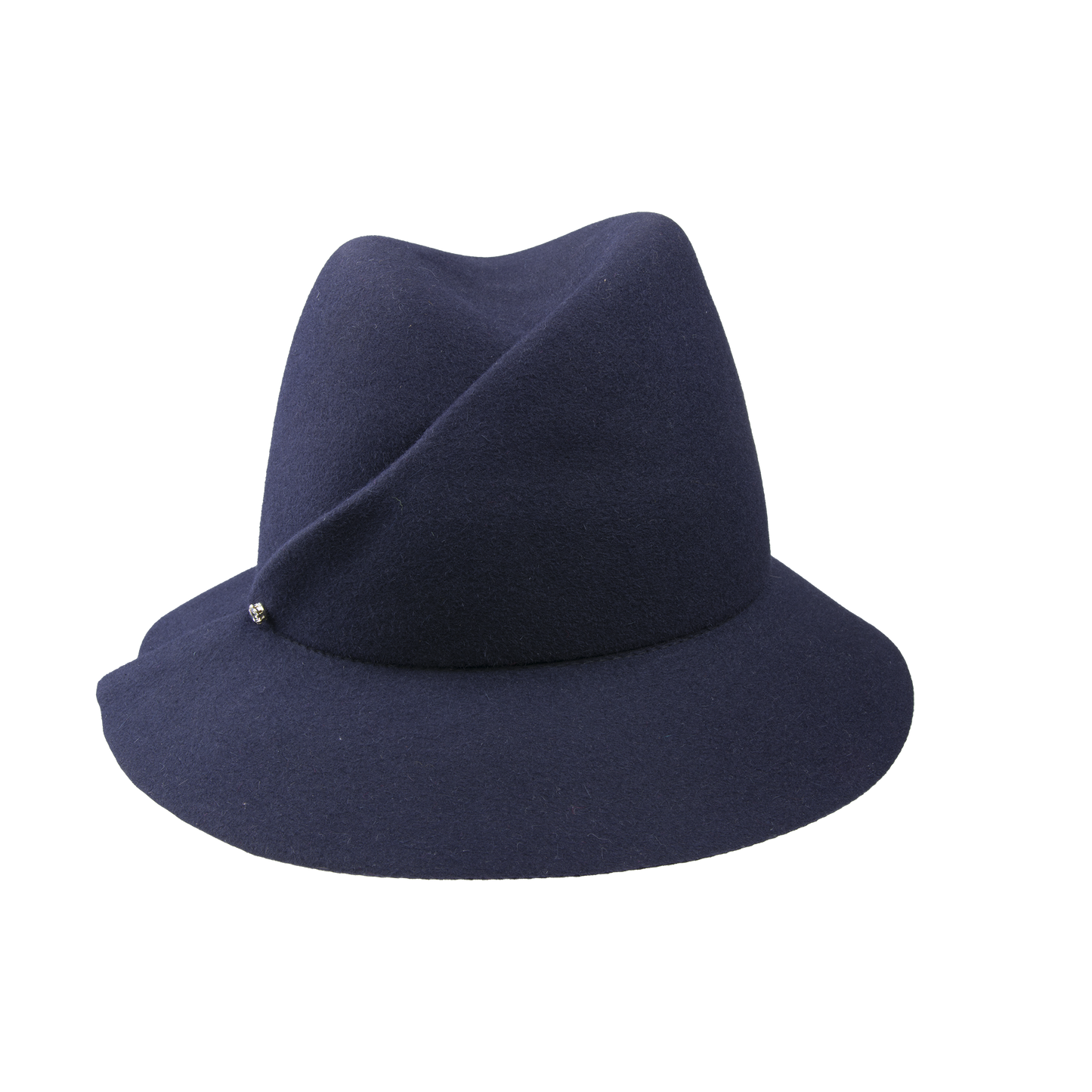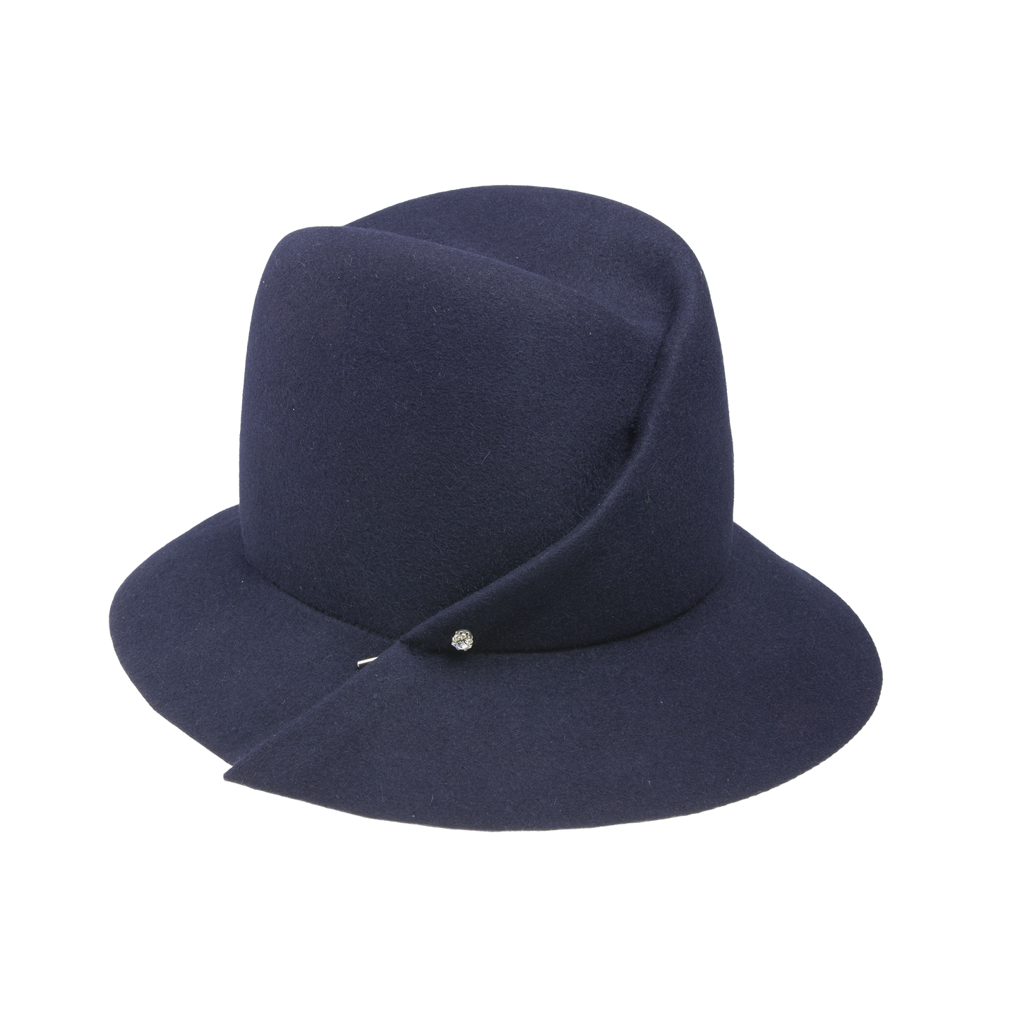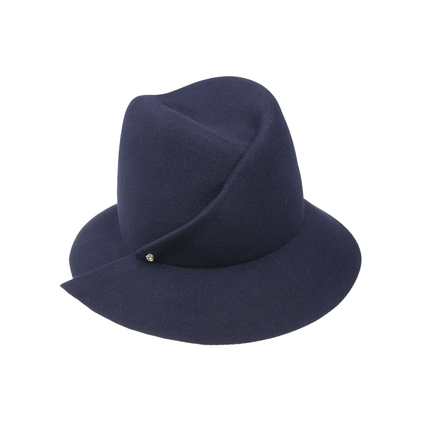 Felt hat with a fabric sweatband decorated with a pin and a rhinestone. Brim width 5.5-6.5 cm.
