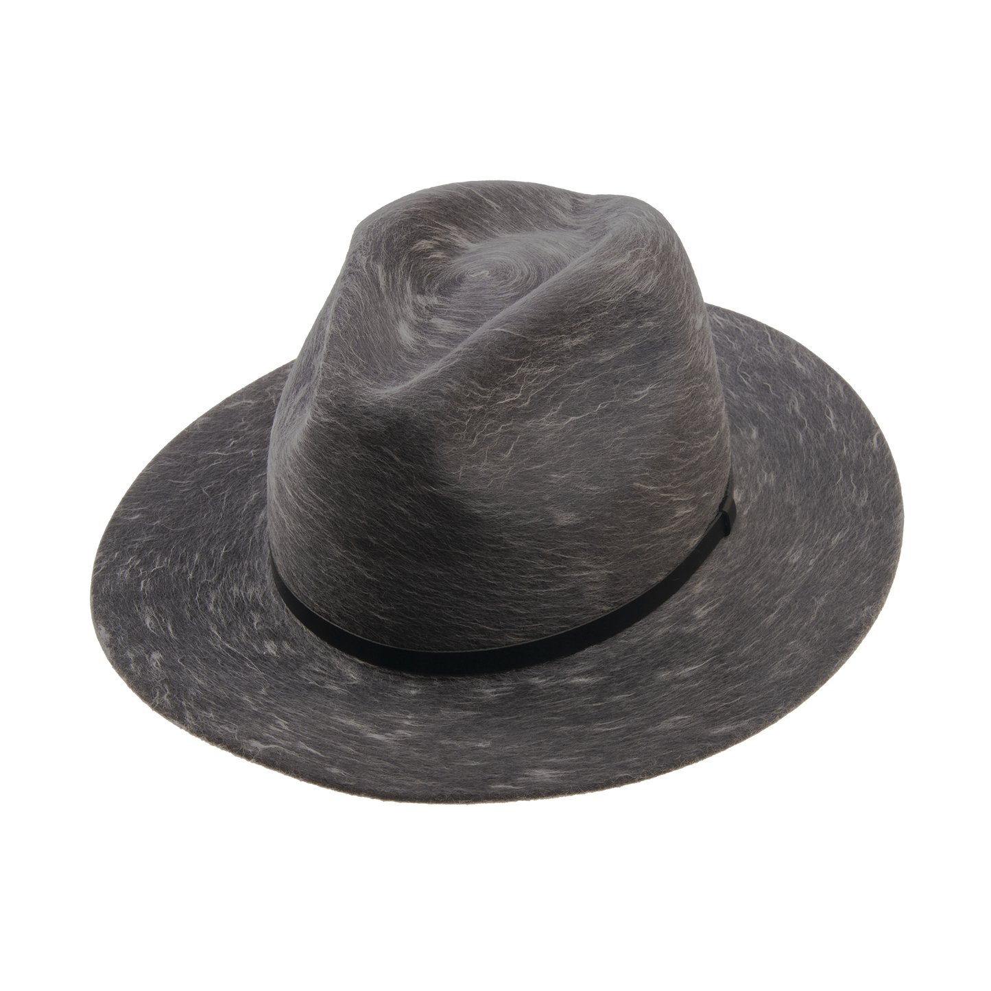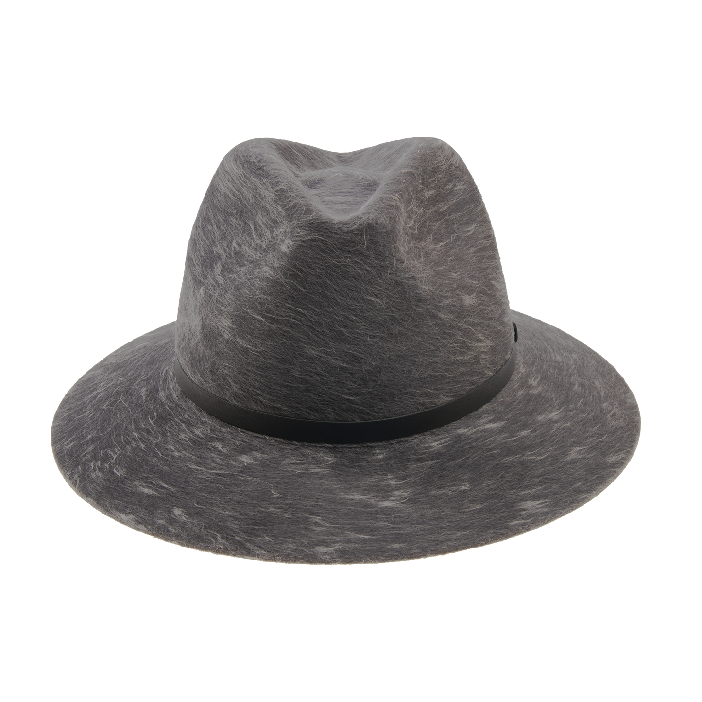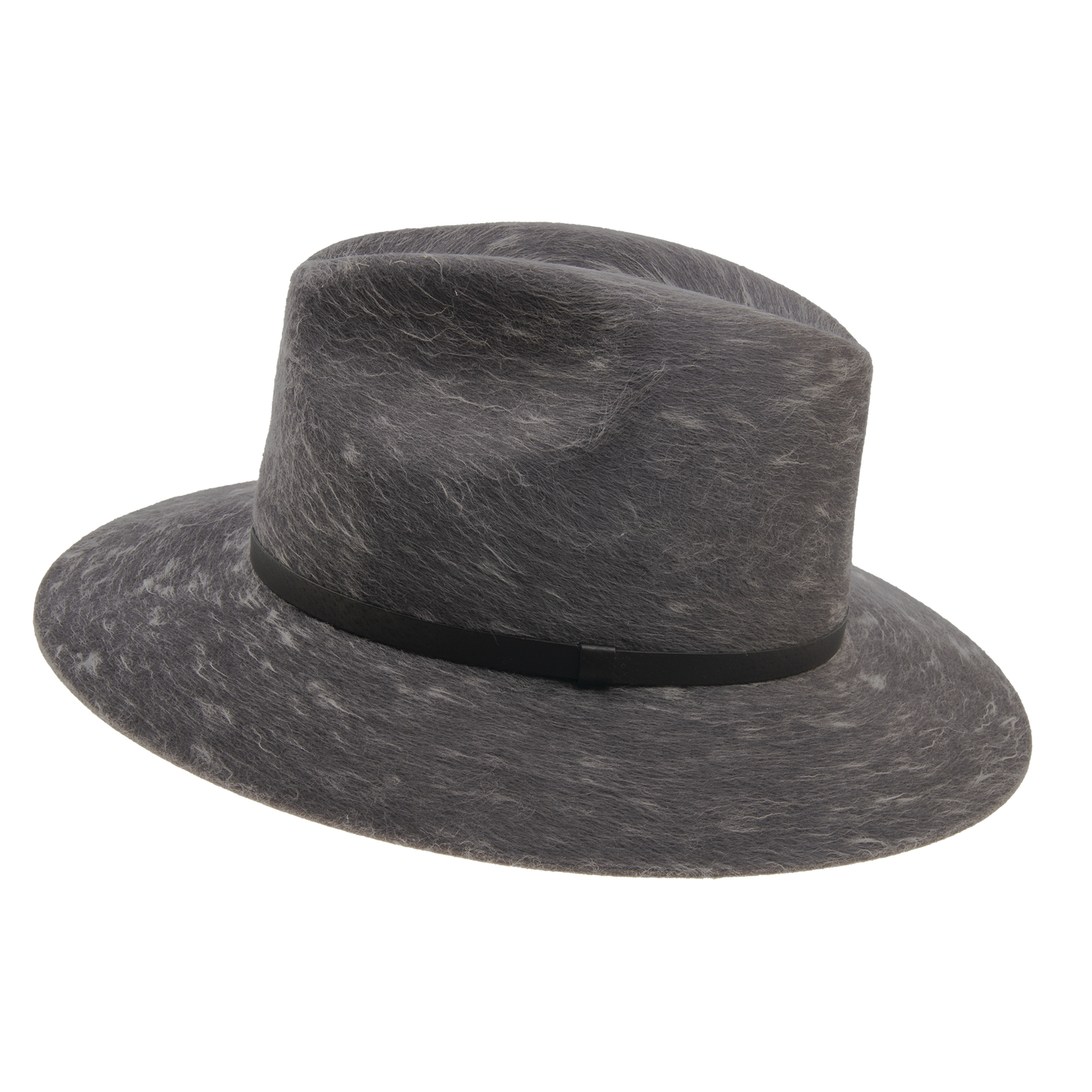 Felt hat trimmed with the leather strap. It has fabric sweat band the width of the brim 7 cm. It contains non-textile parts of animal origin.