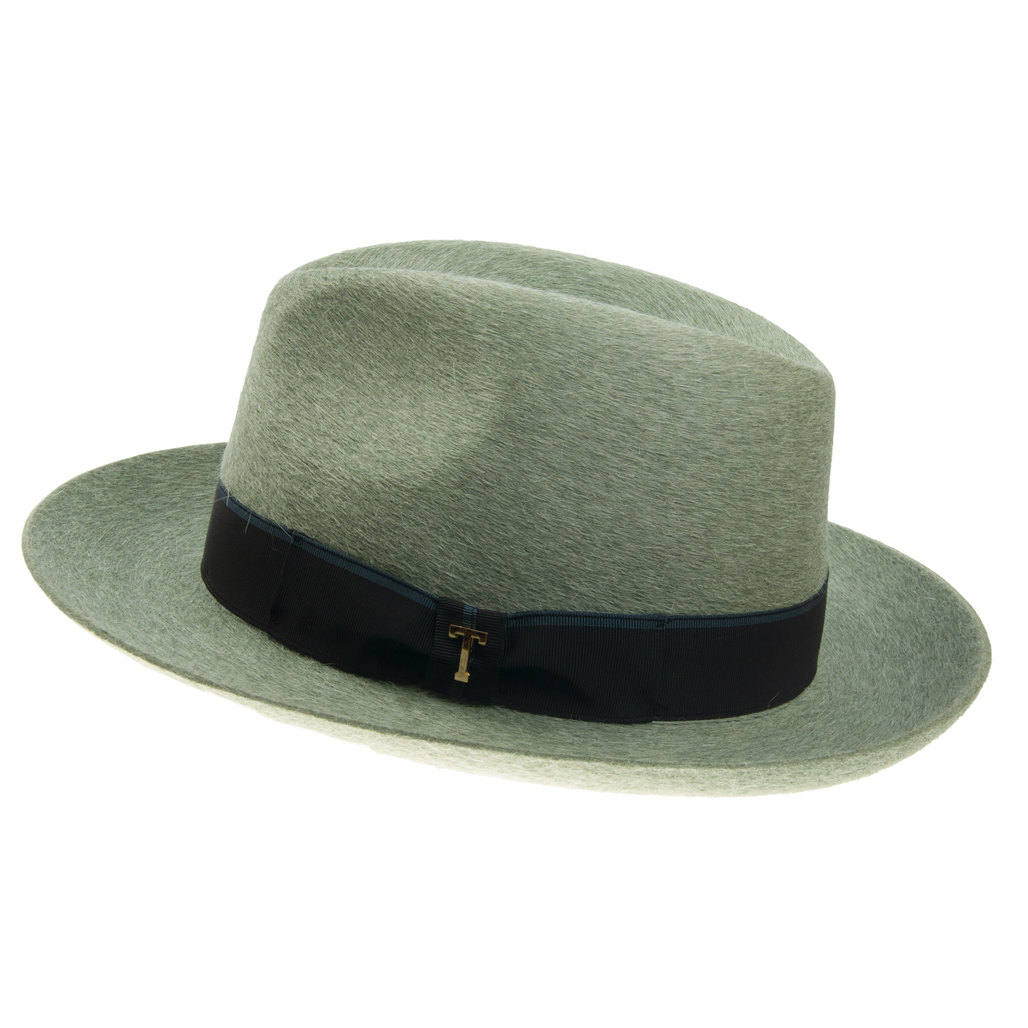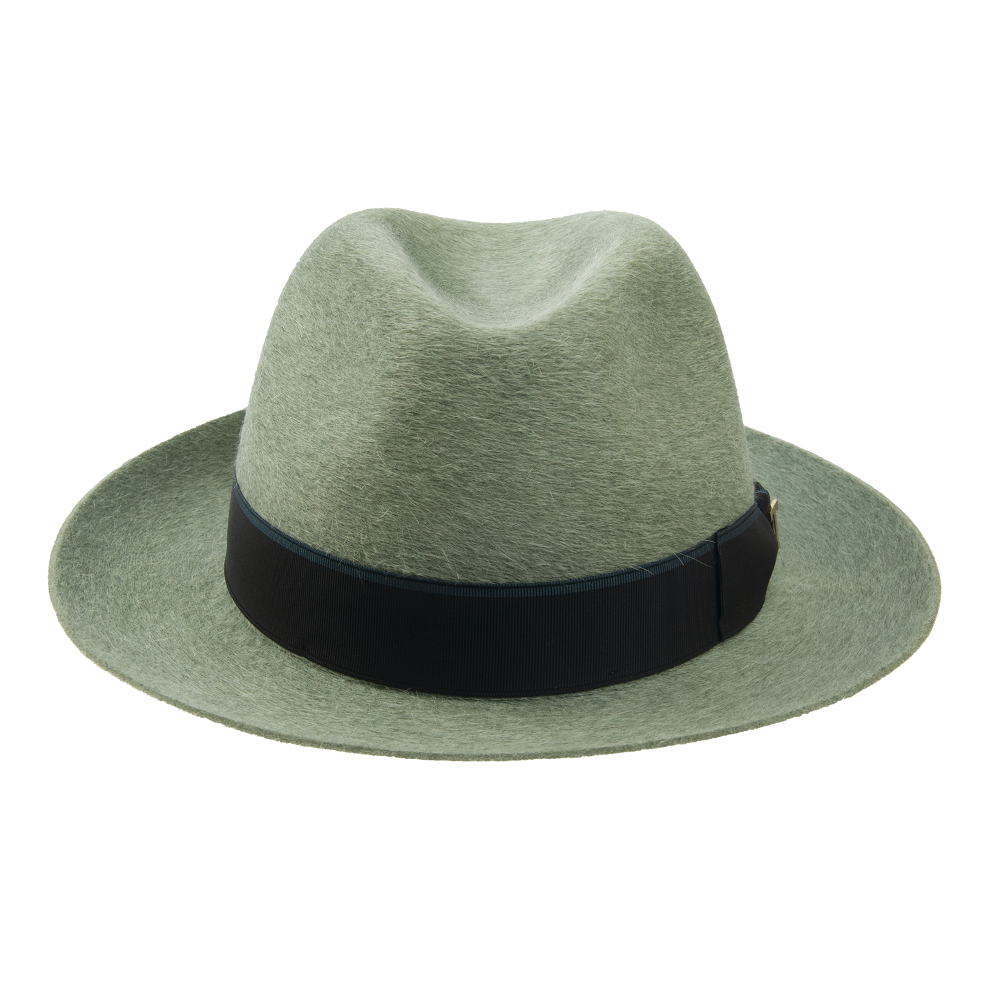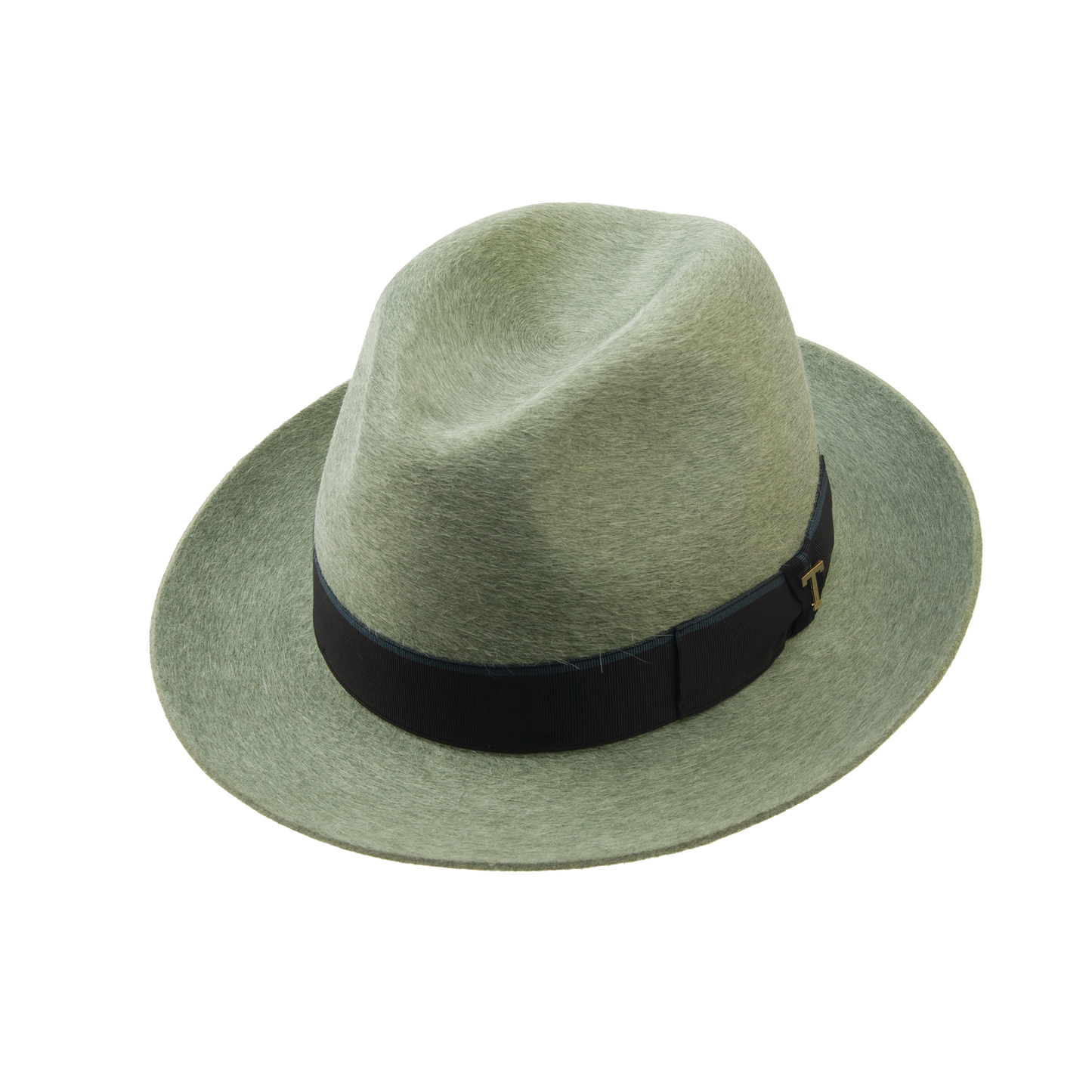 Melange hat with the hair trimmed with the hat ribbon. It has fabric sweat band the width of the brim 6 cm.