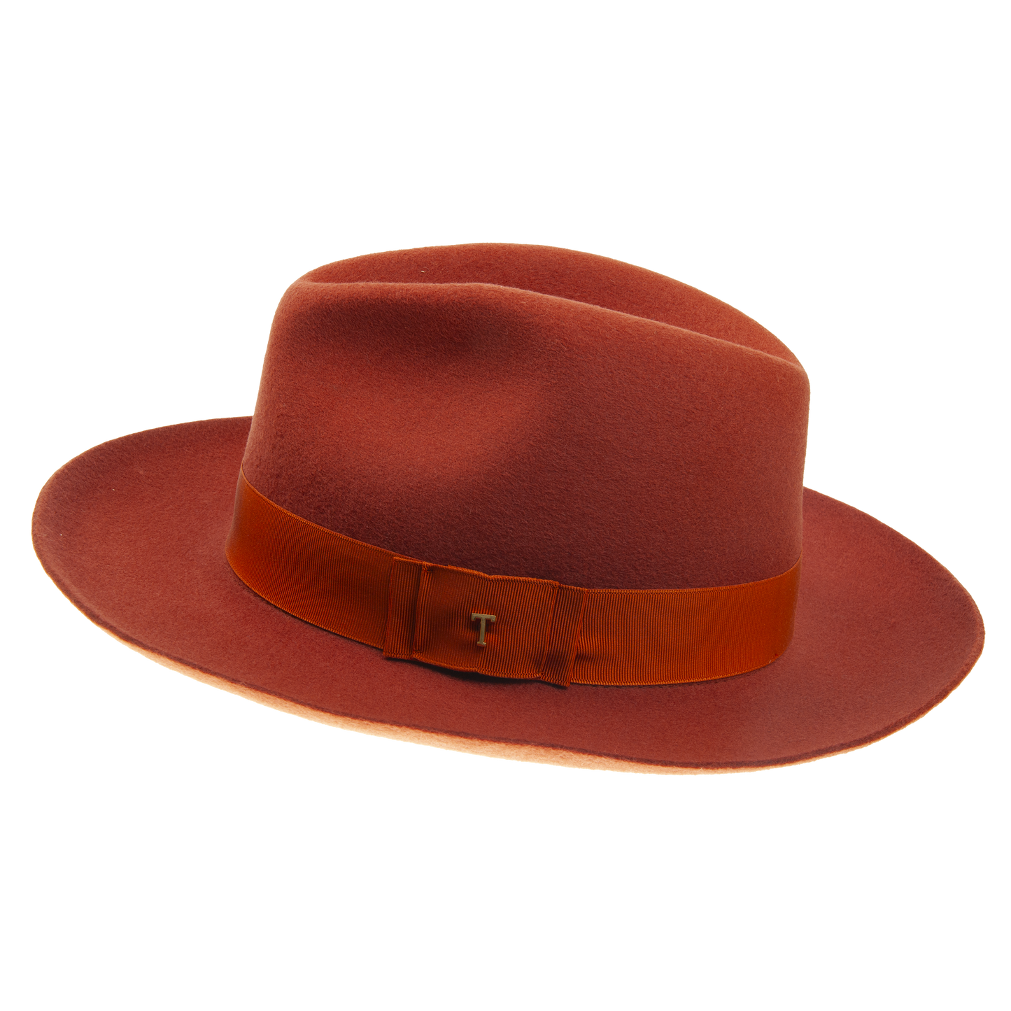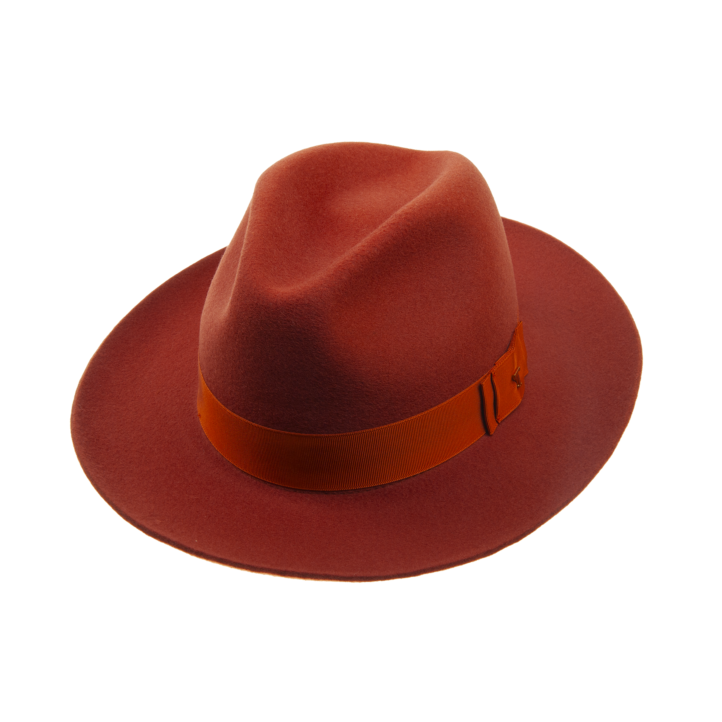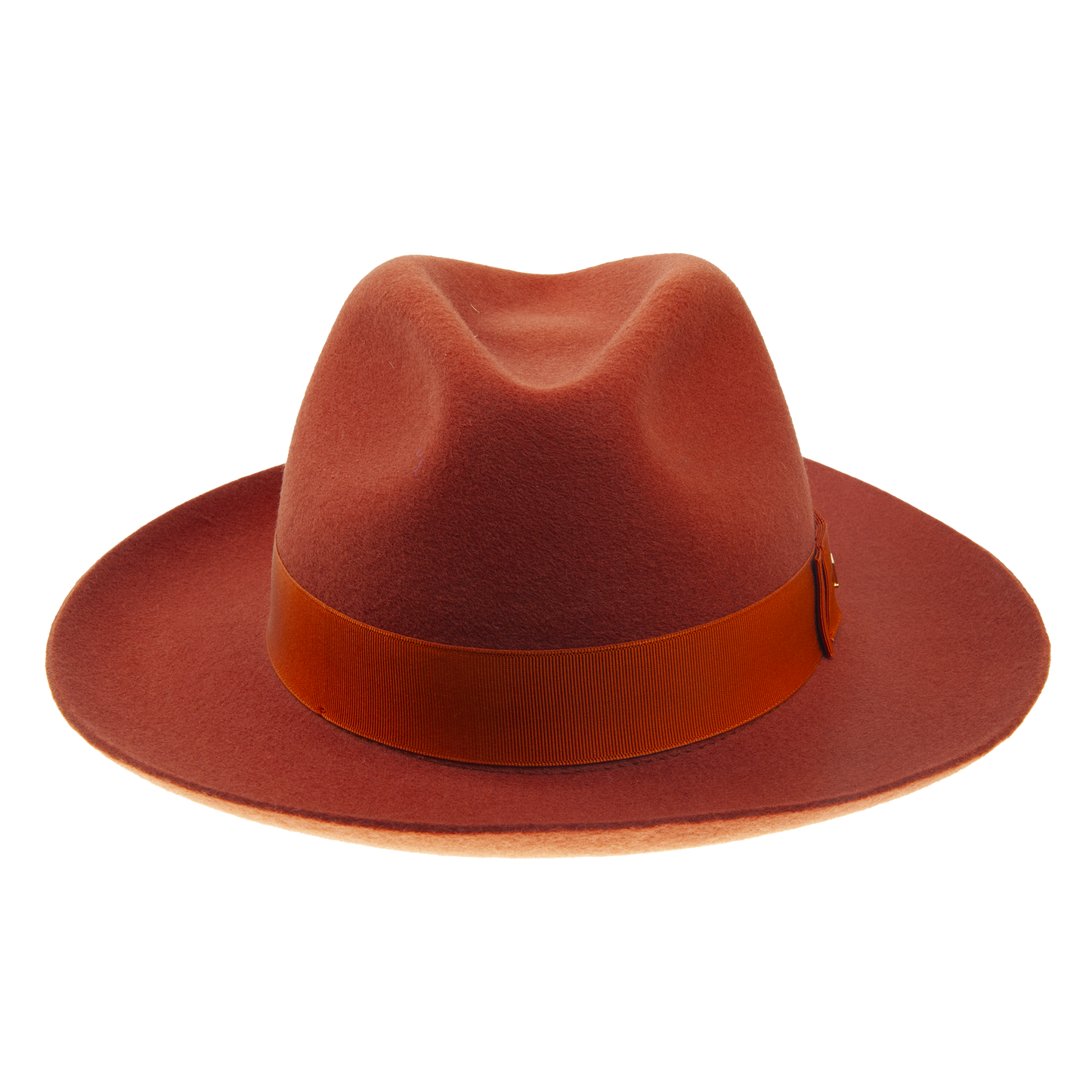 Wool hat trimmed with the hat ribbon. It has fabric sweat band.