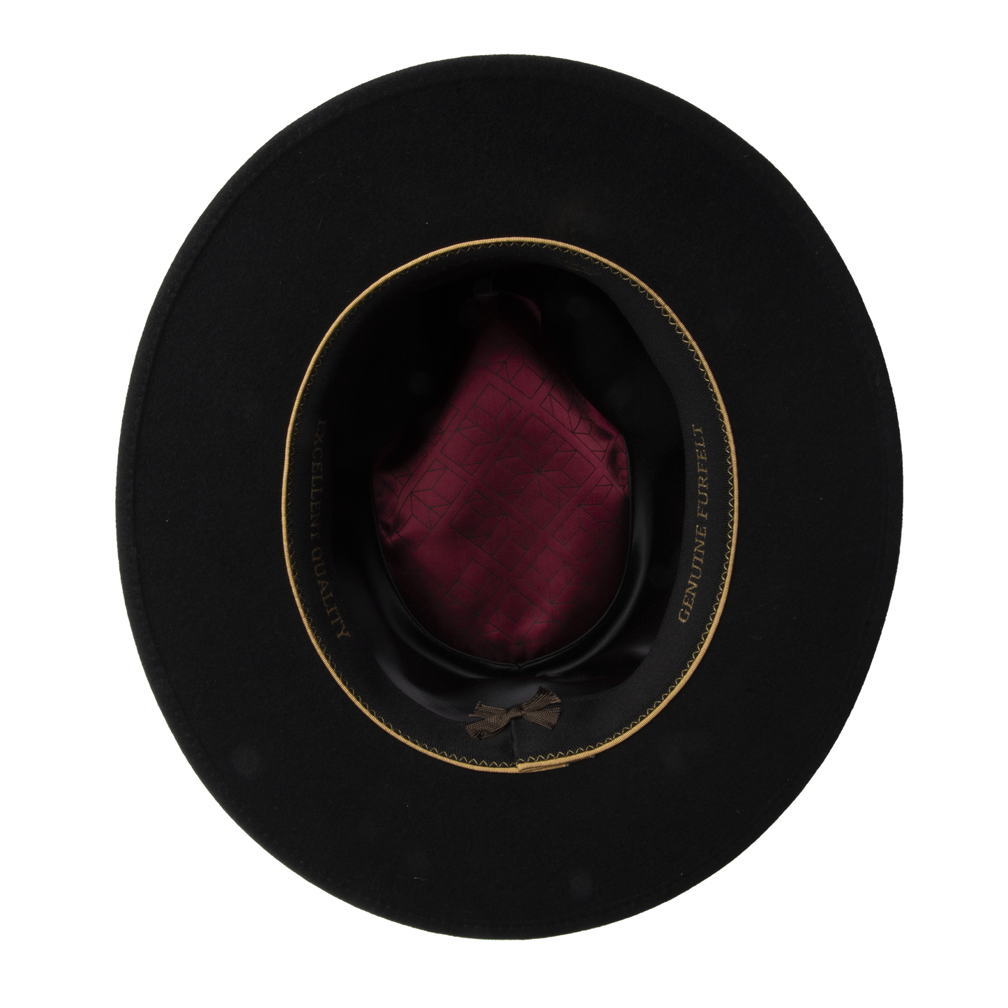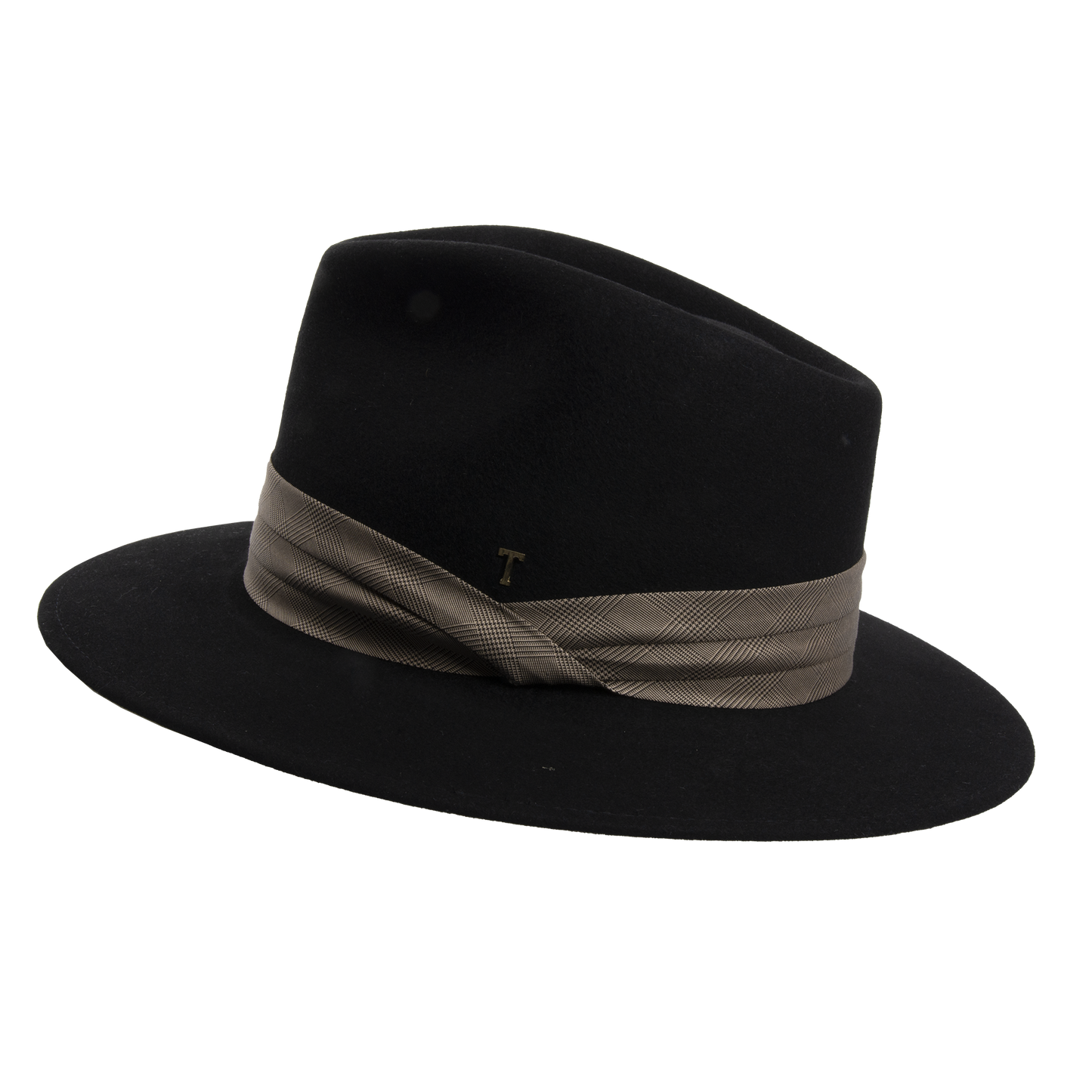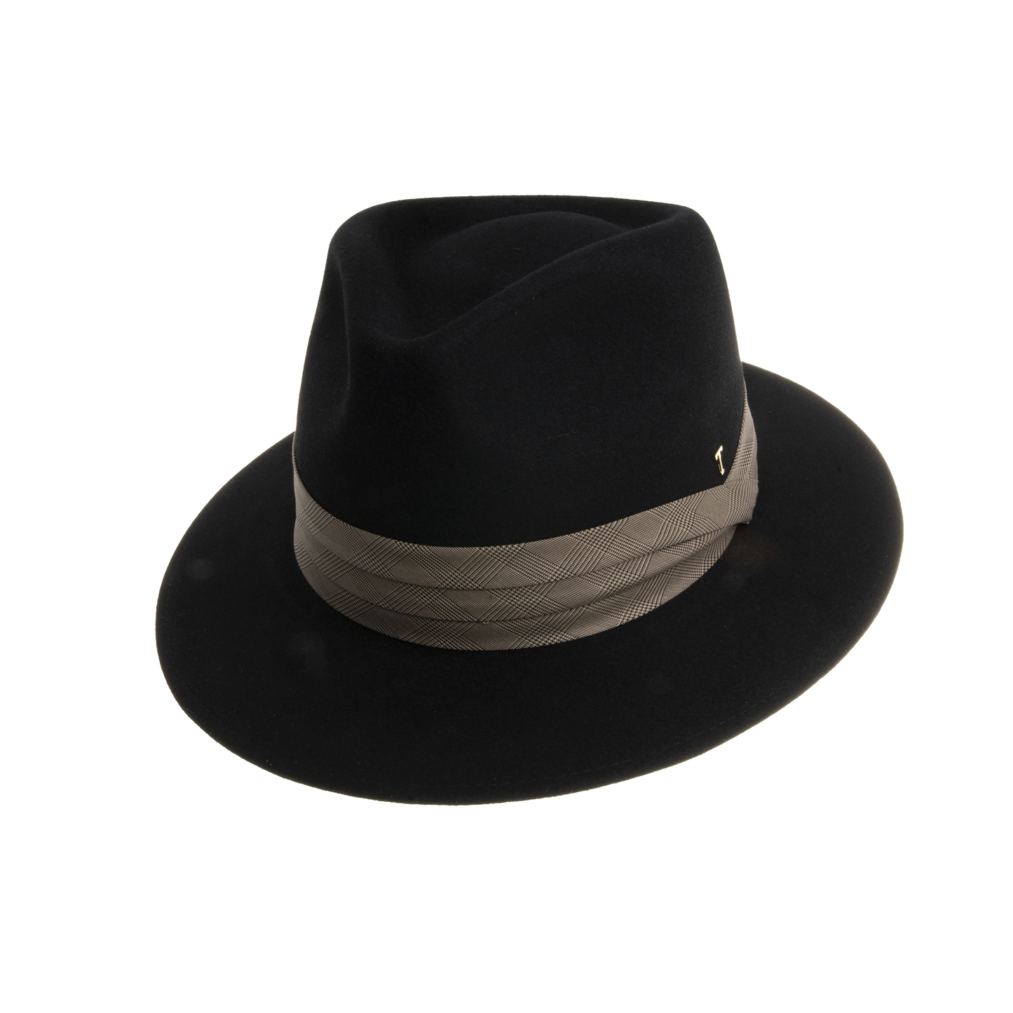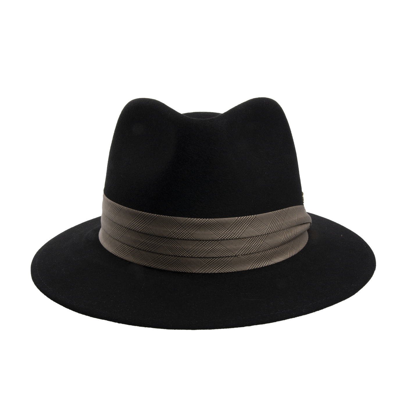 The classic black Fedora Uomo with a firm straight brim (6 - 6,5 cm) is decorated with a distinctive folded ribbon. As a result, this simple black hat becomes an original fashion accessory. Fedora Uomo can complement elegant outfits or casual style clothing.