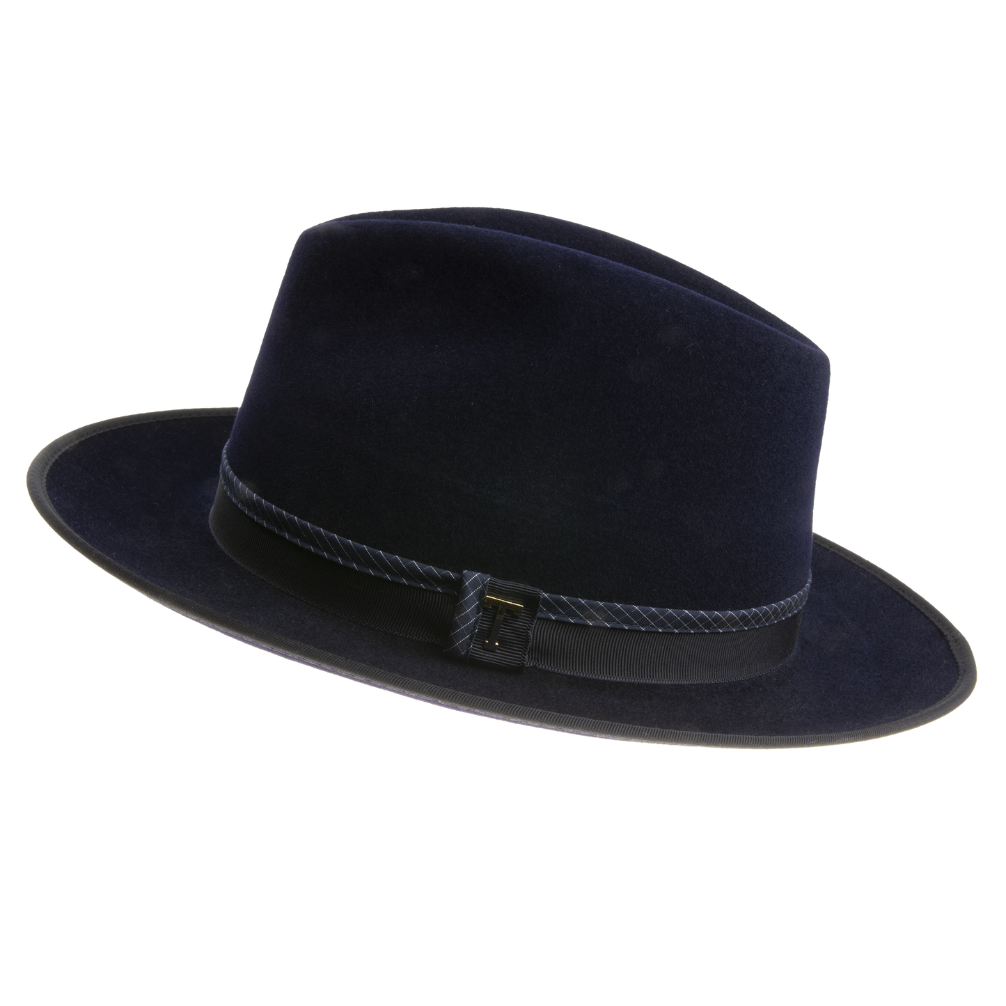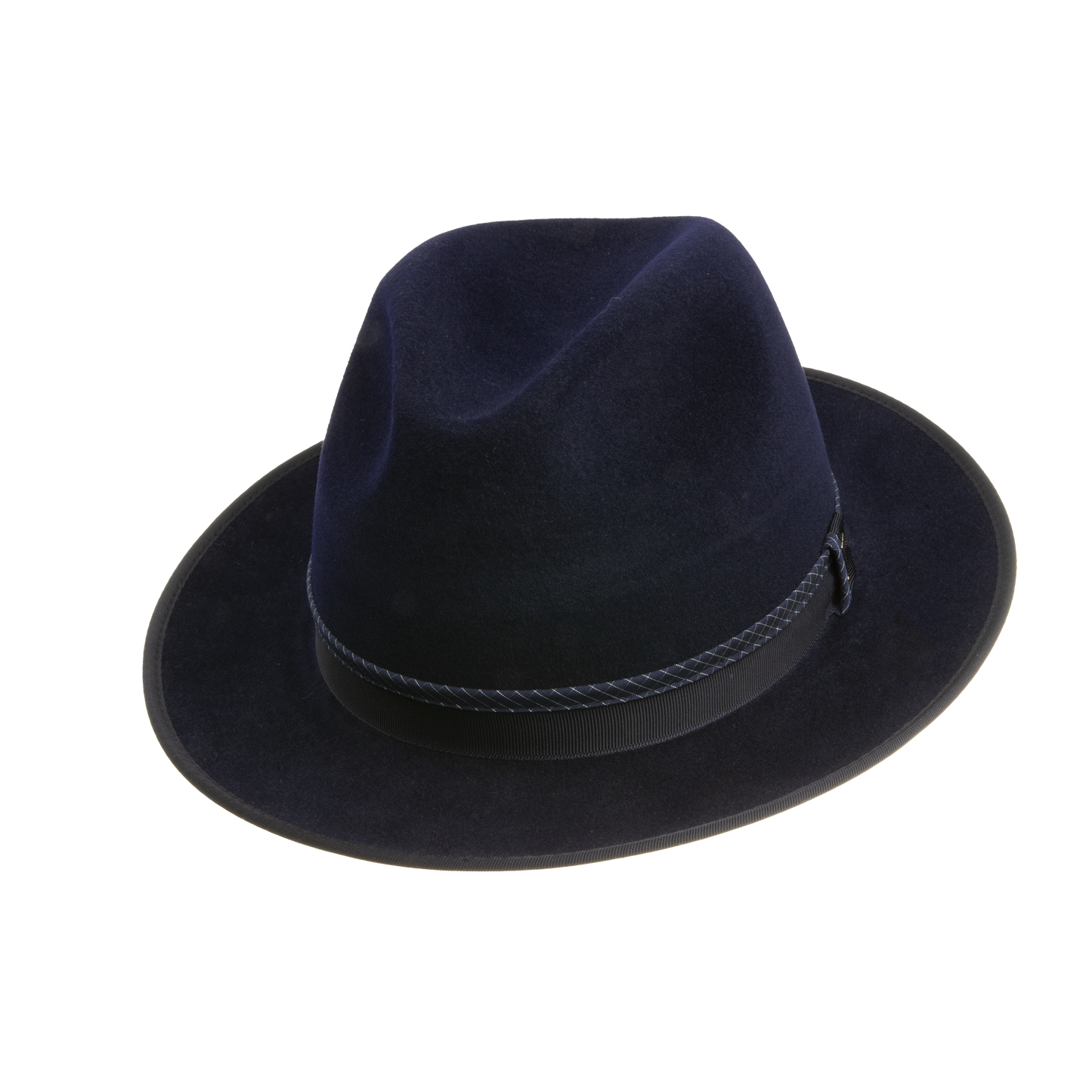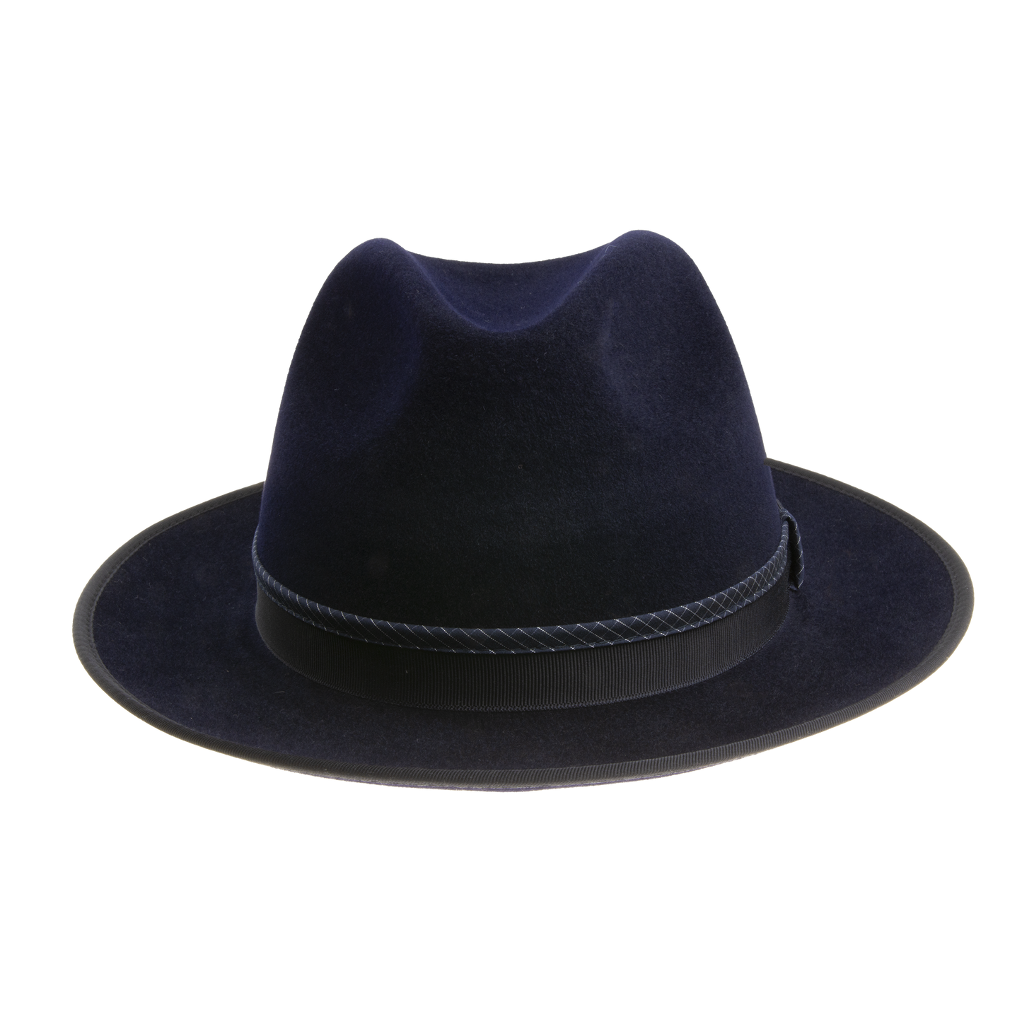 If you do not particularly like black colour, this dark blue shade is the perfect choice for you. Fedora Uomo Profilo combines well; it has a simple decoration and an elegantly finished slightly raised brim. The width of them brim 6 - 6,5 cm.