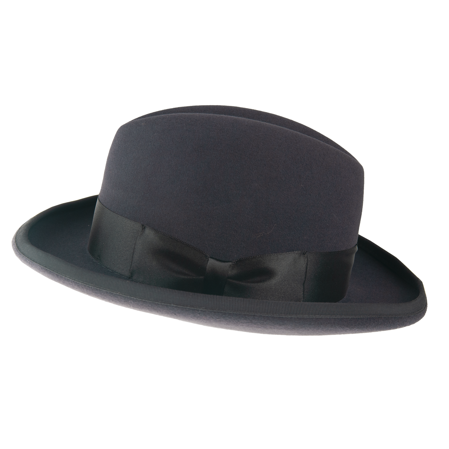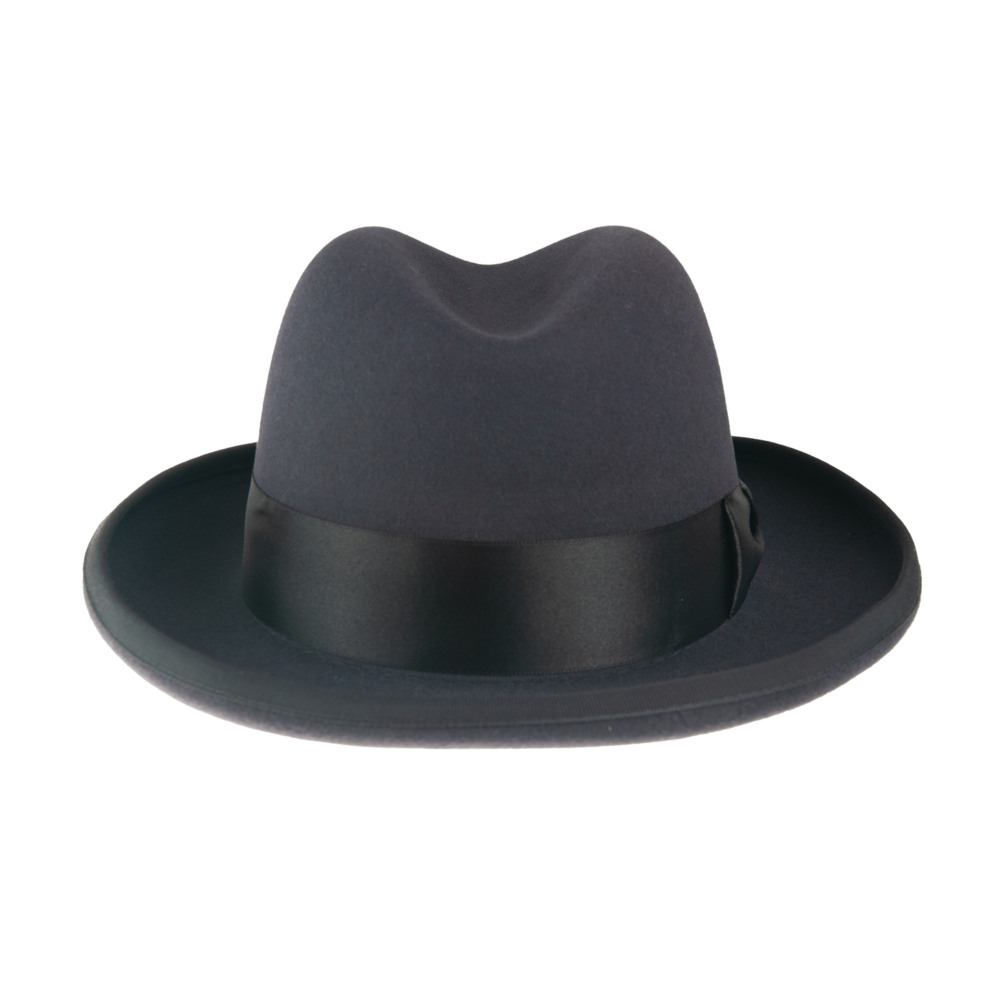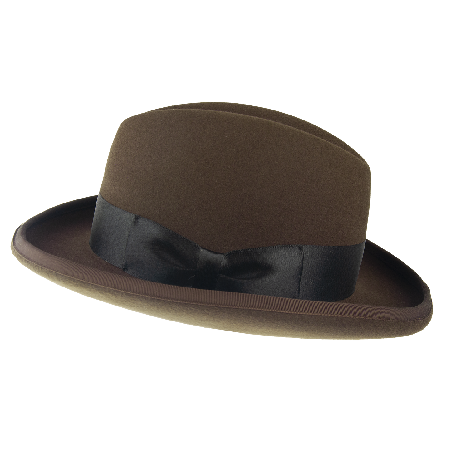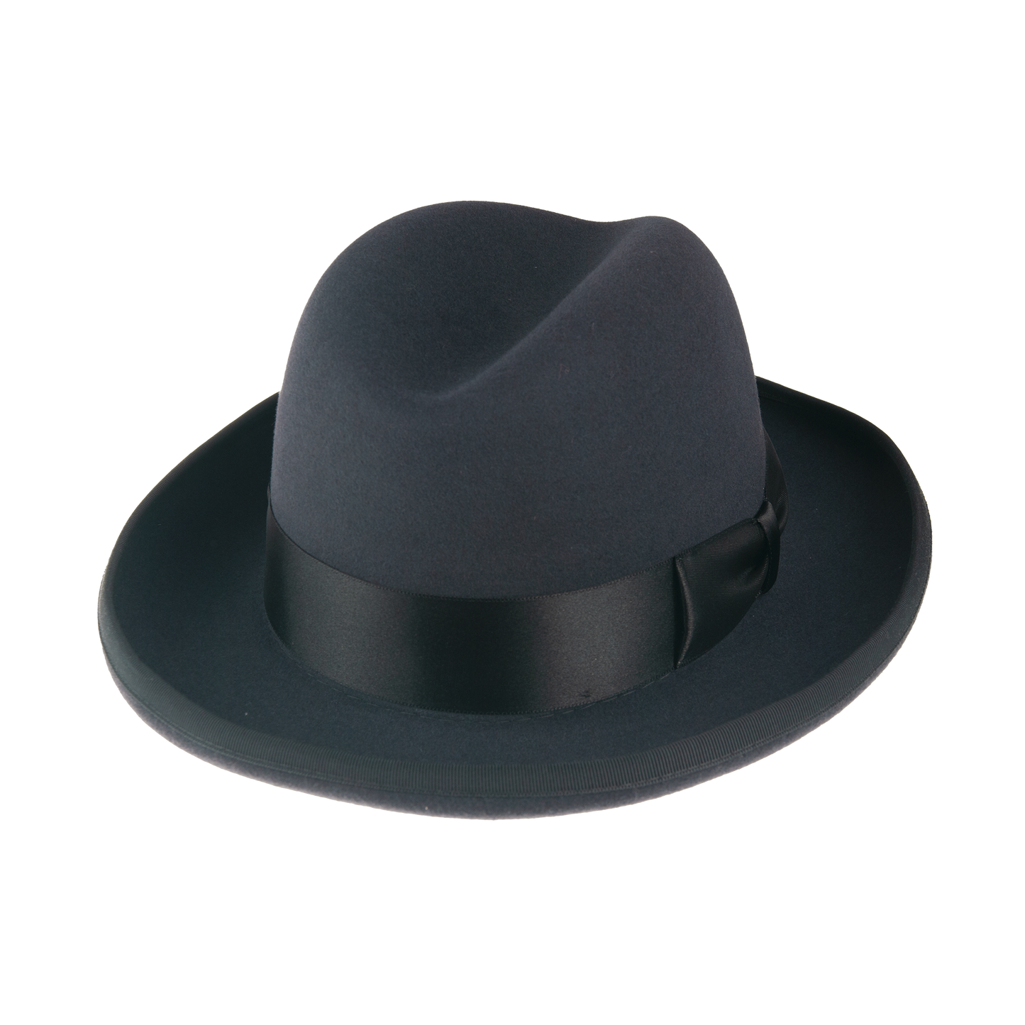 Luxury suede homburg hat with a leather sweatband and lining. The hat is adorned with a satin ribbon.