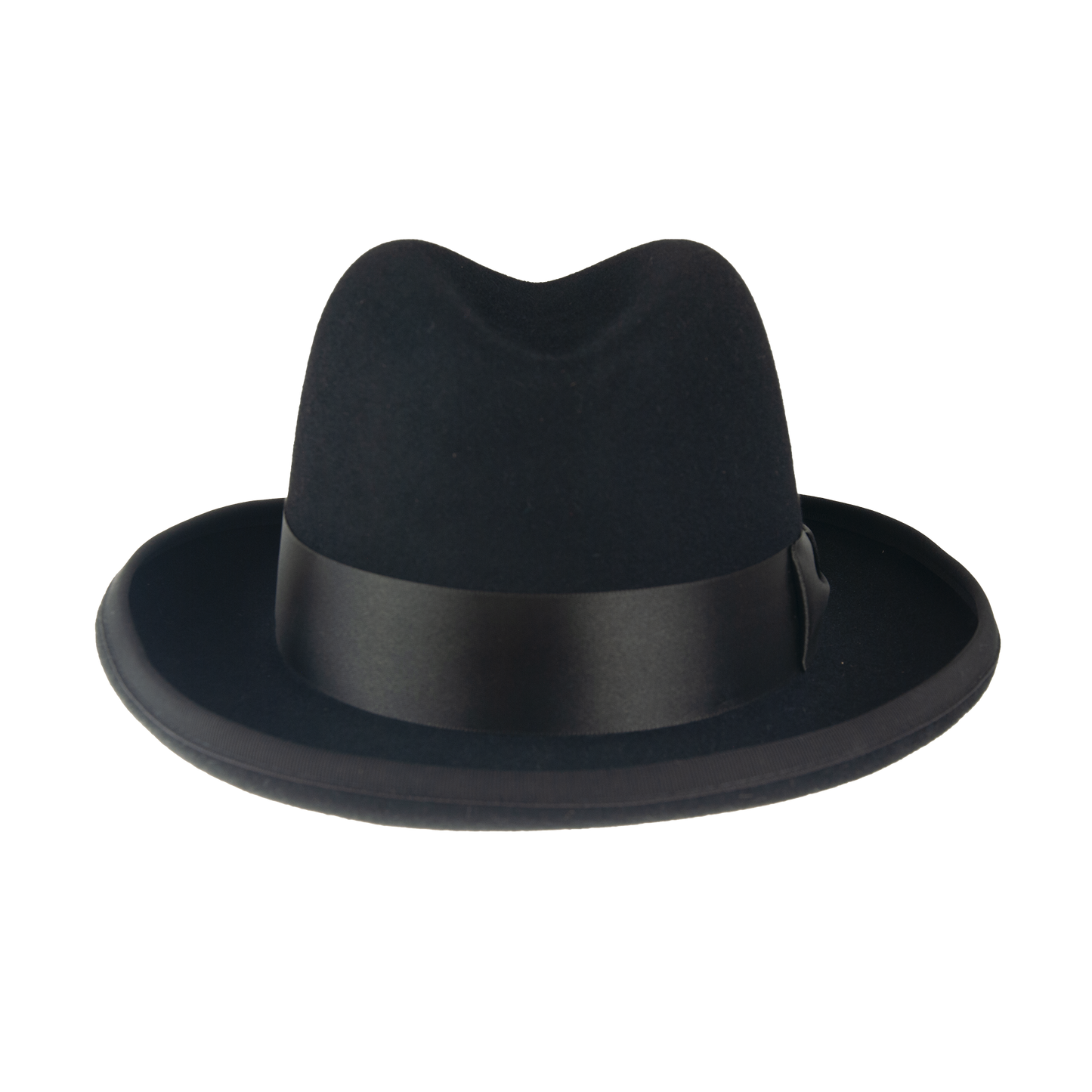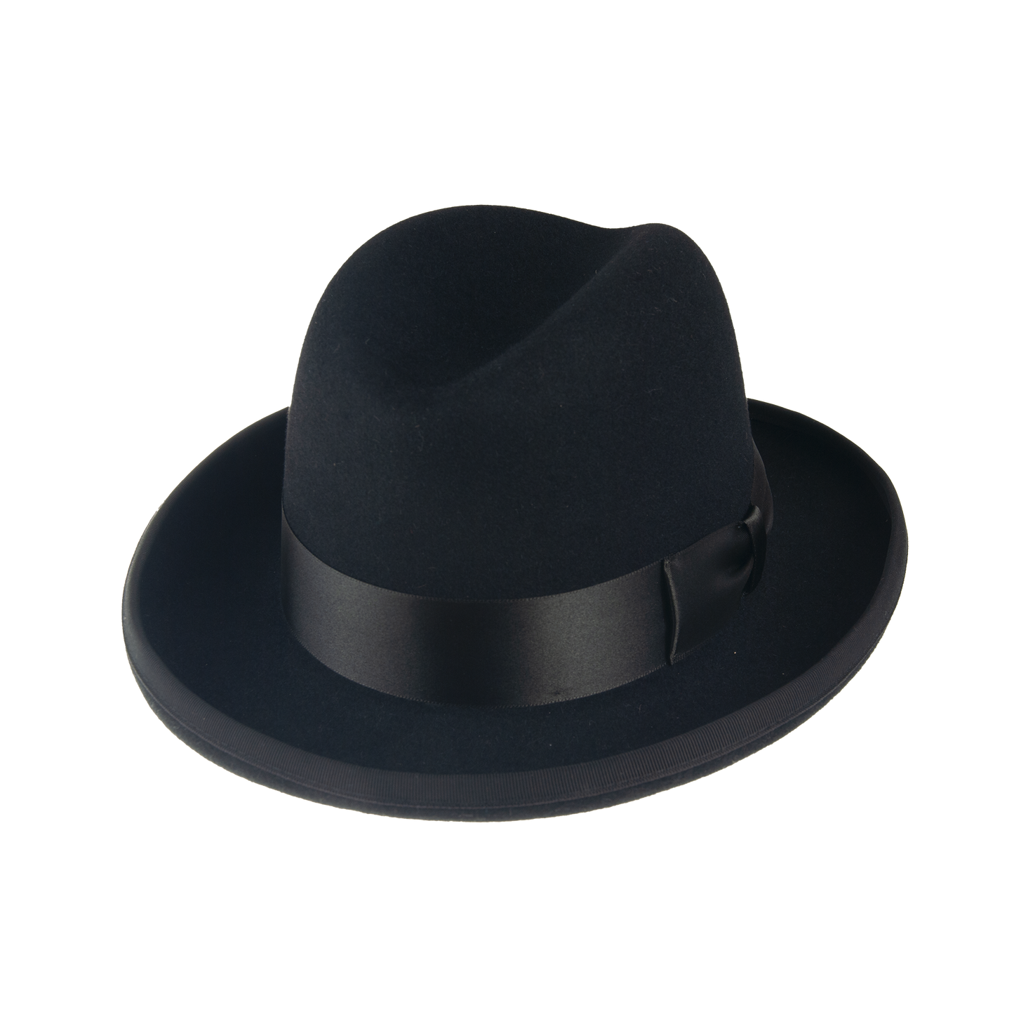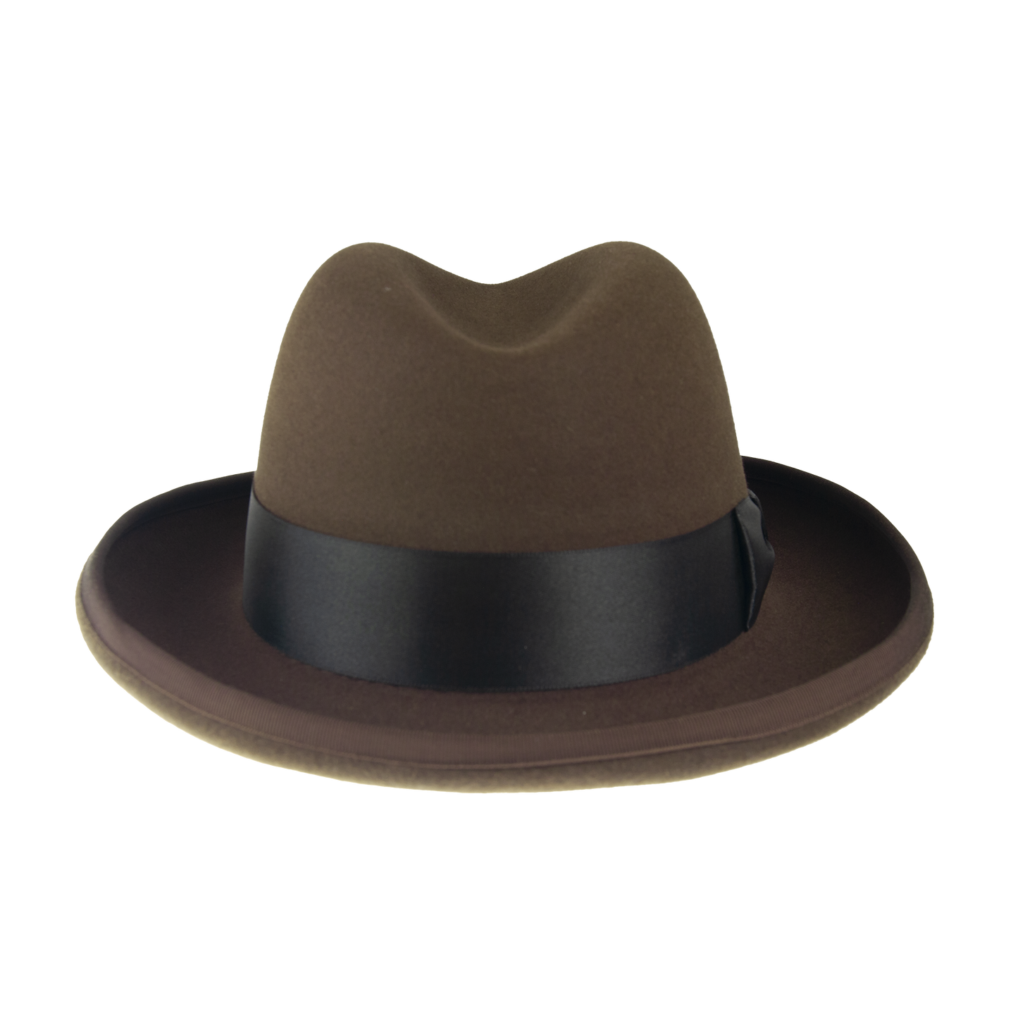 Luxury suede homburg hat with a leather sweatband and lining. The hat is adorned with a satin ribbon.