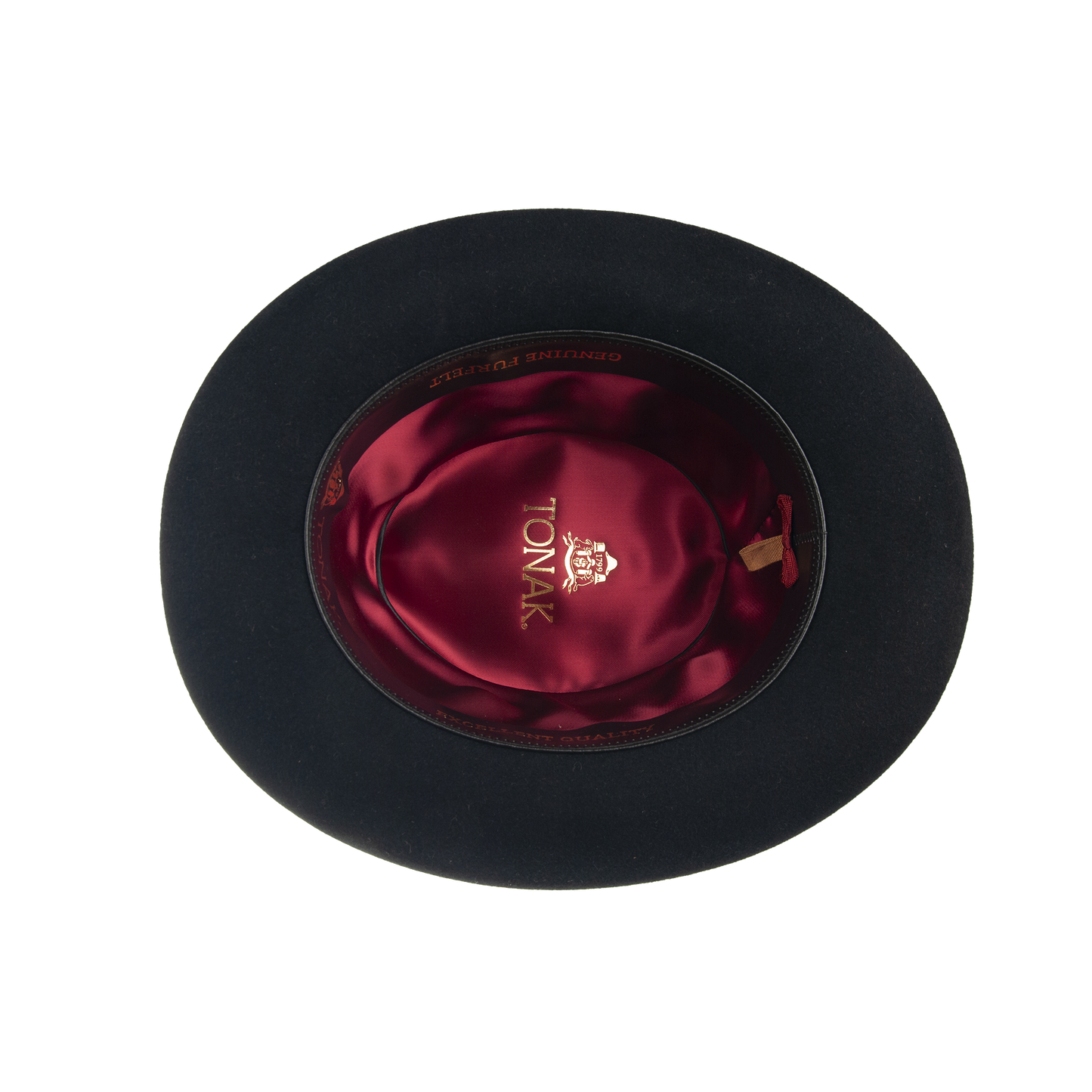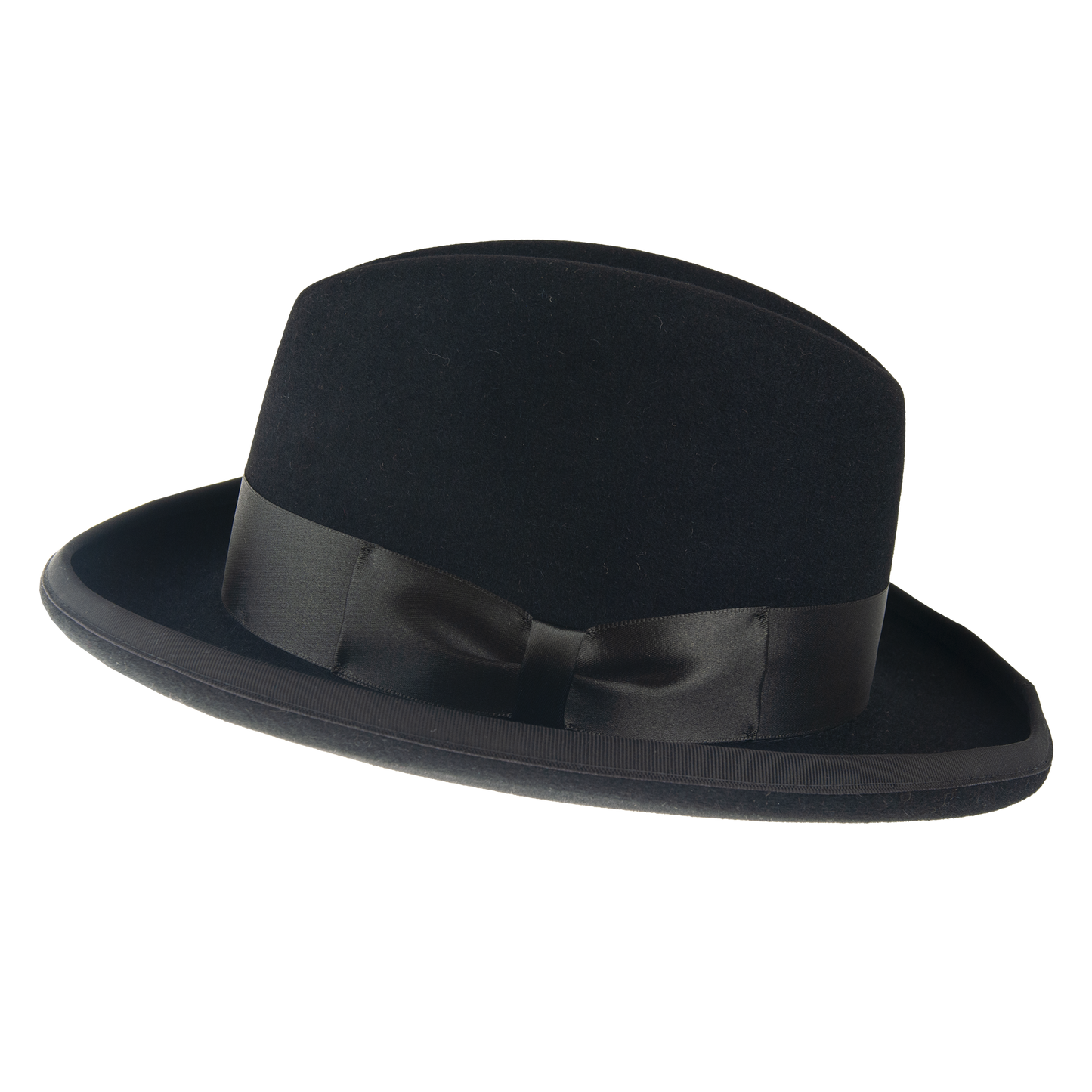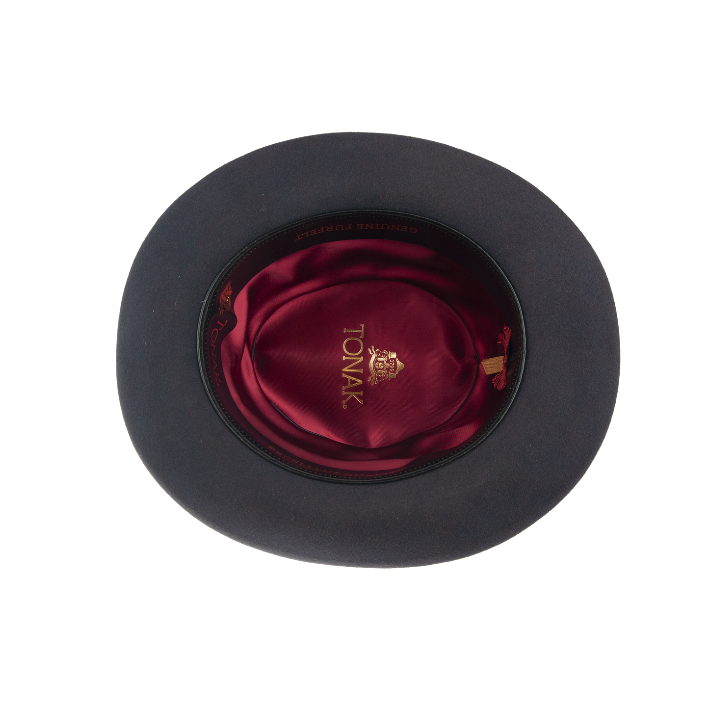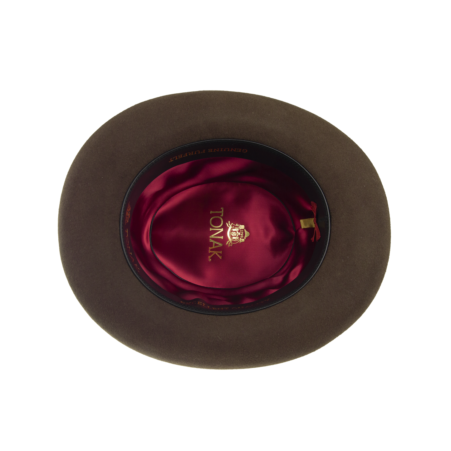 Luxury suede homburg hat with a leather sweatband and lining. The hat is adorned with a satin ribbon.
