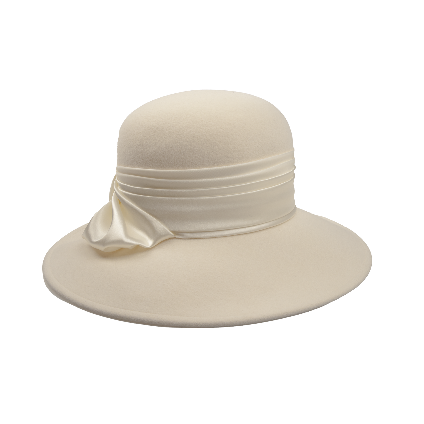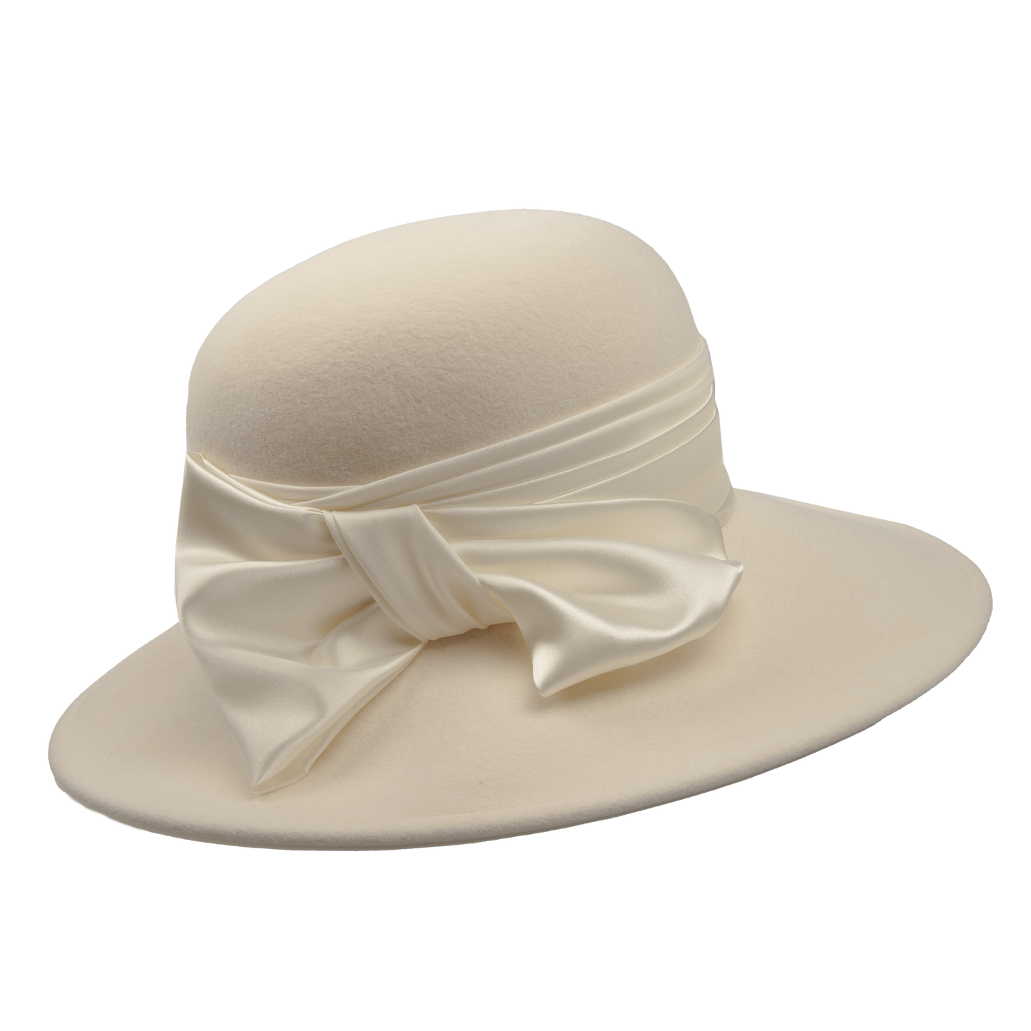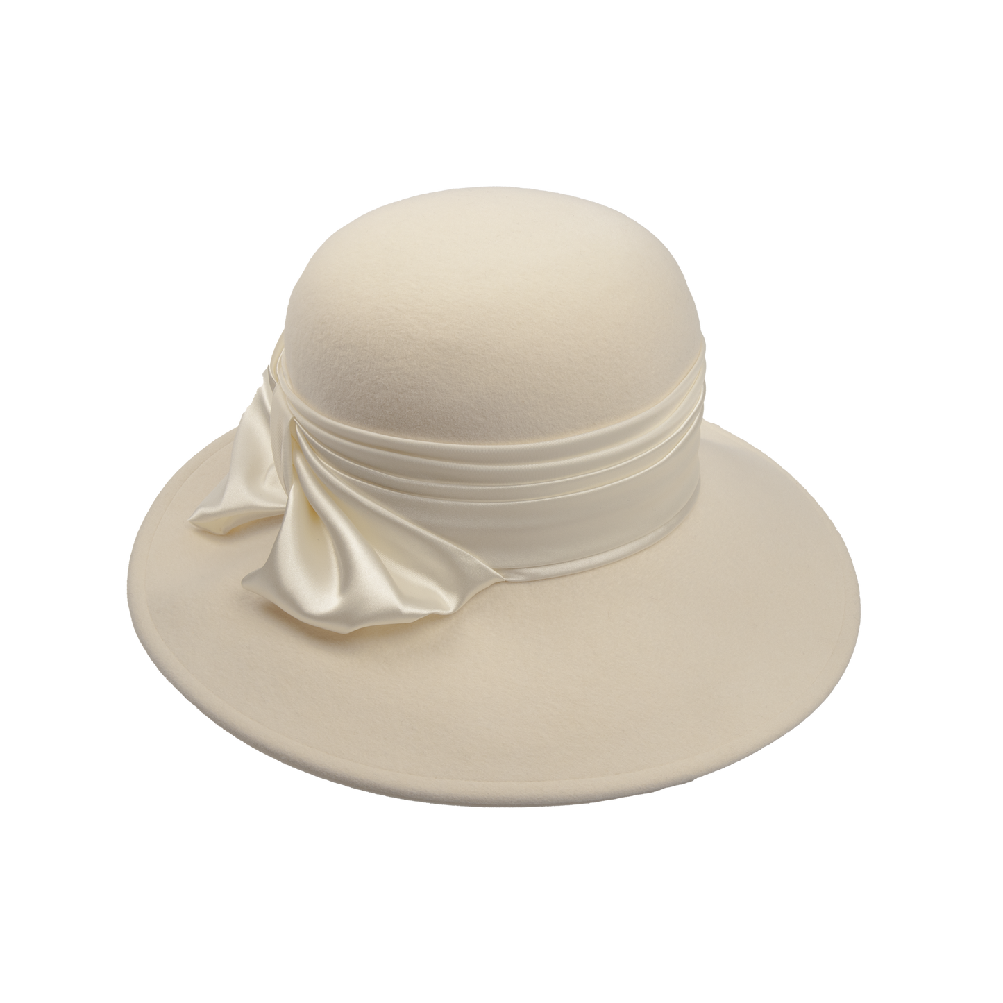 Luxury suede hat with the stretch sweat band trimmed with the satin ribbon and the bow. The width of the brim 9 - 9,5 cm.