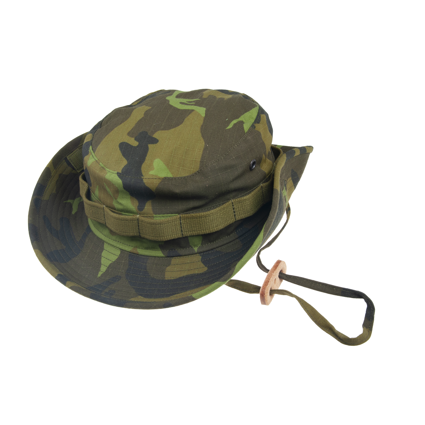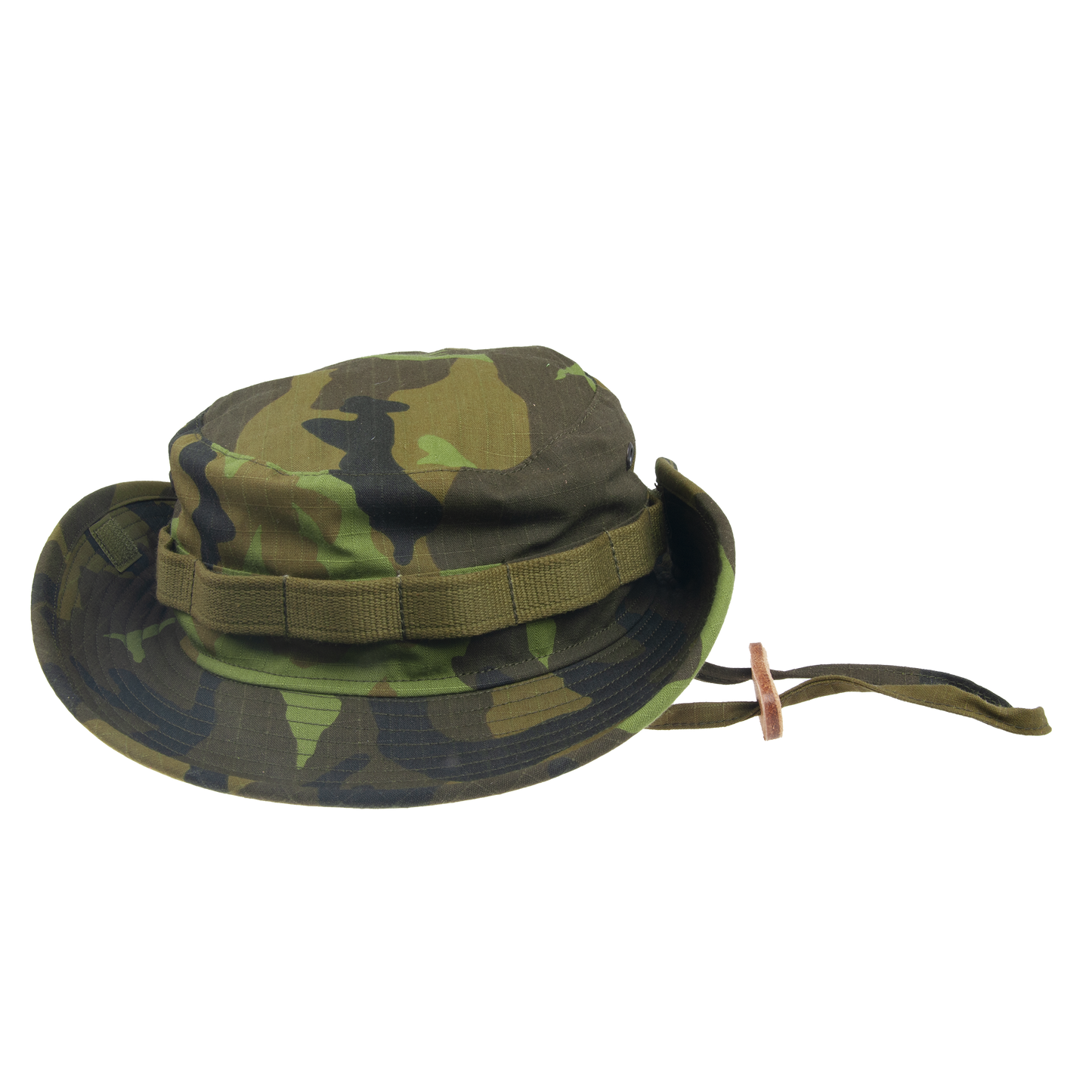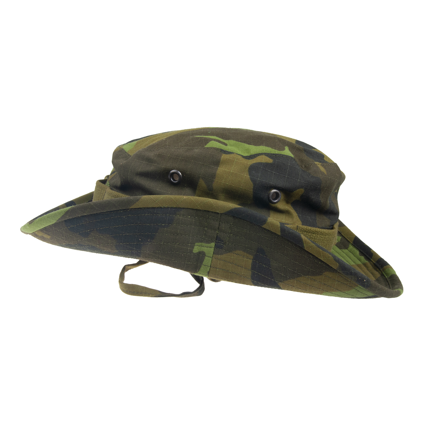 Unlined camouflage hat with two air pockets on the sides. The brim is raised on the sides and fastened with Velcro.
