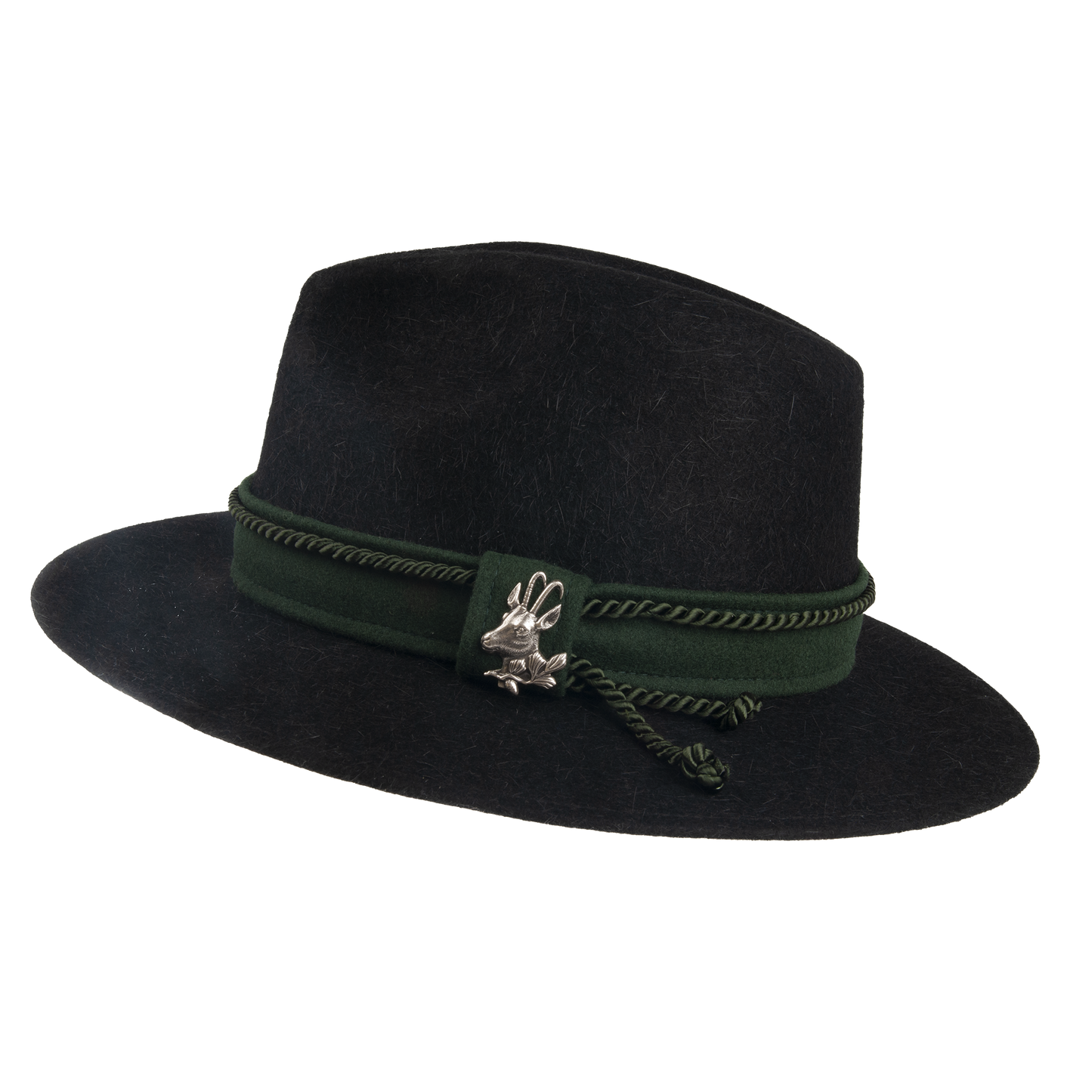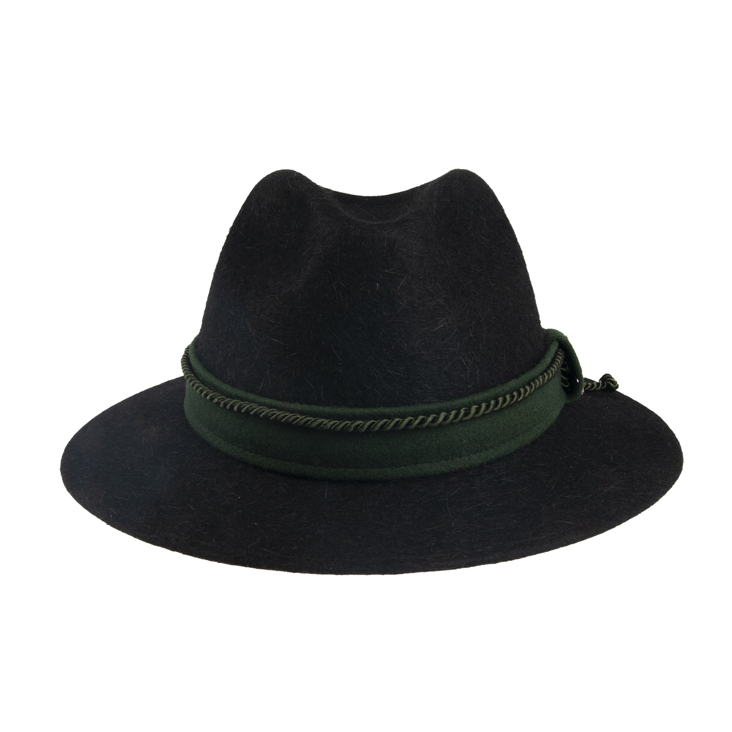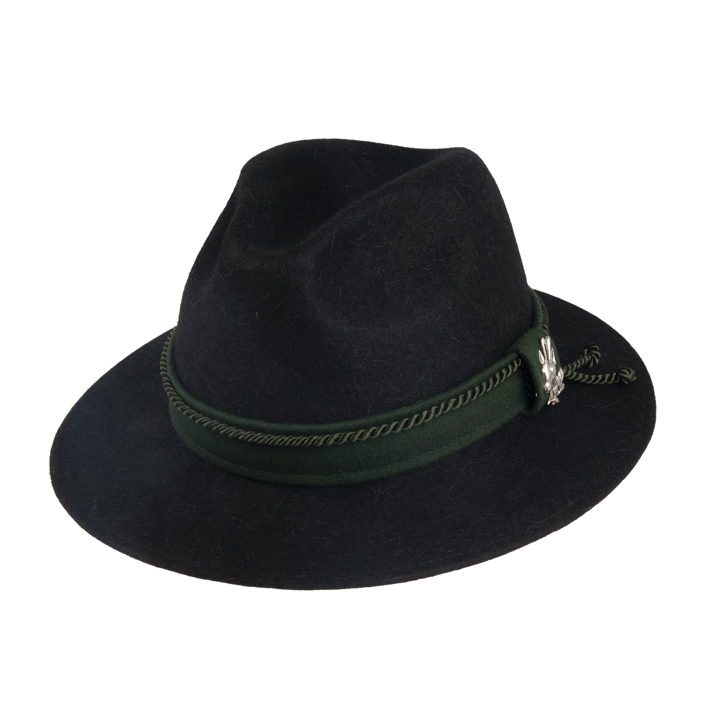 Hunting hat trimmed with the felt belt, twisted cord and the brooch. It has lining and the fabric sweat band, the width of the brim 6,5 cm.