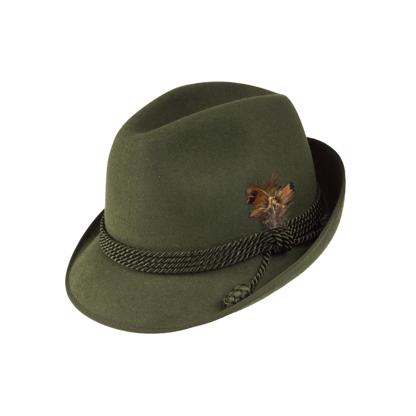 Hunting hat with the stretch sweatband trimmed with the feather and twisted cord with the cones. It contains non-textile parts of animal origin.