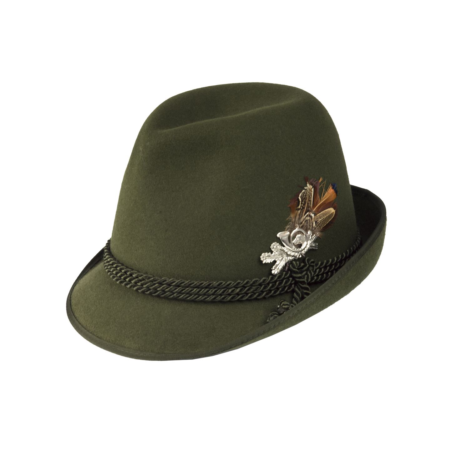Hunting hat with the leather sweatband trimmed with the twisted cord bijouterie and feather. It contains non-textile parts of animal origin.
