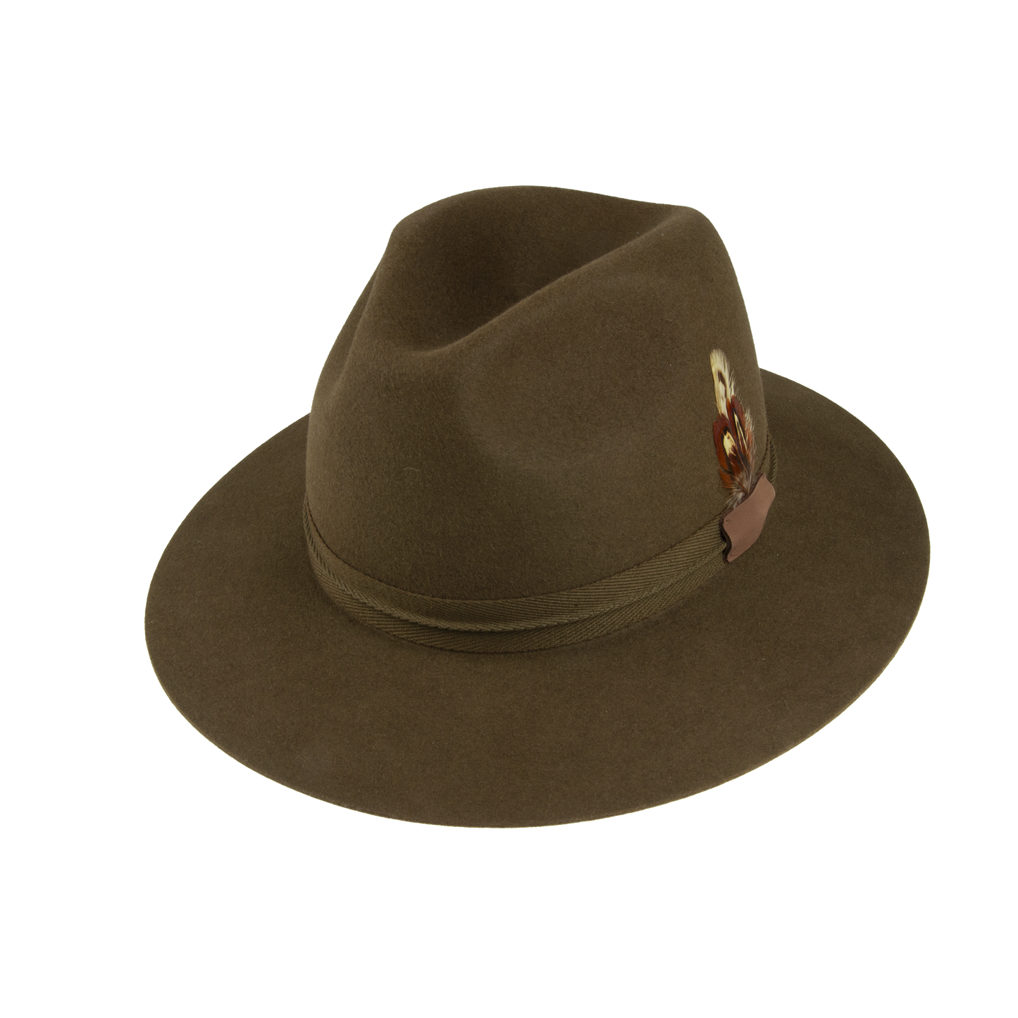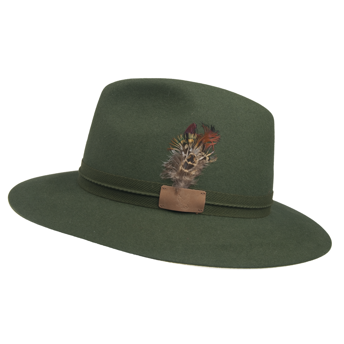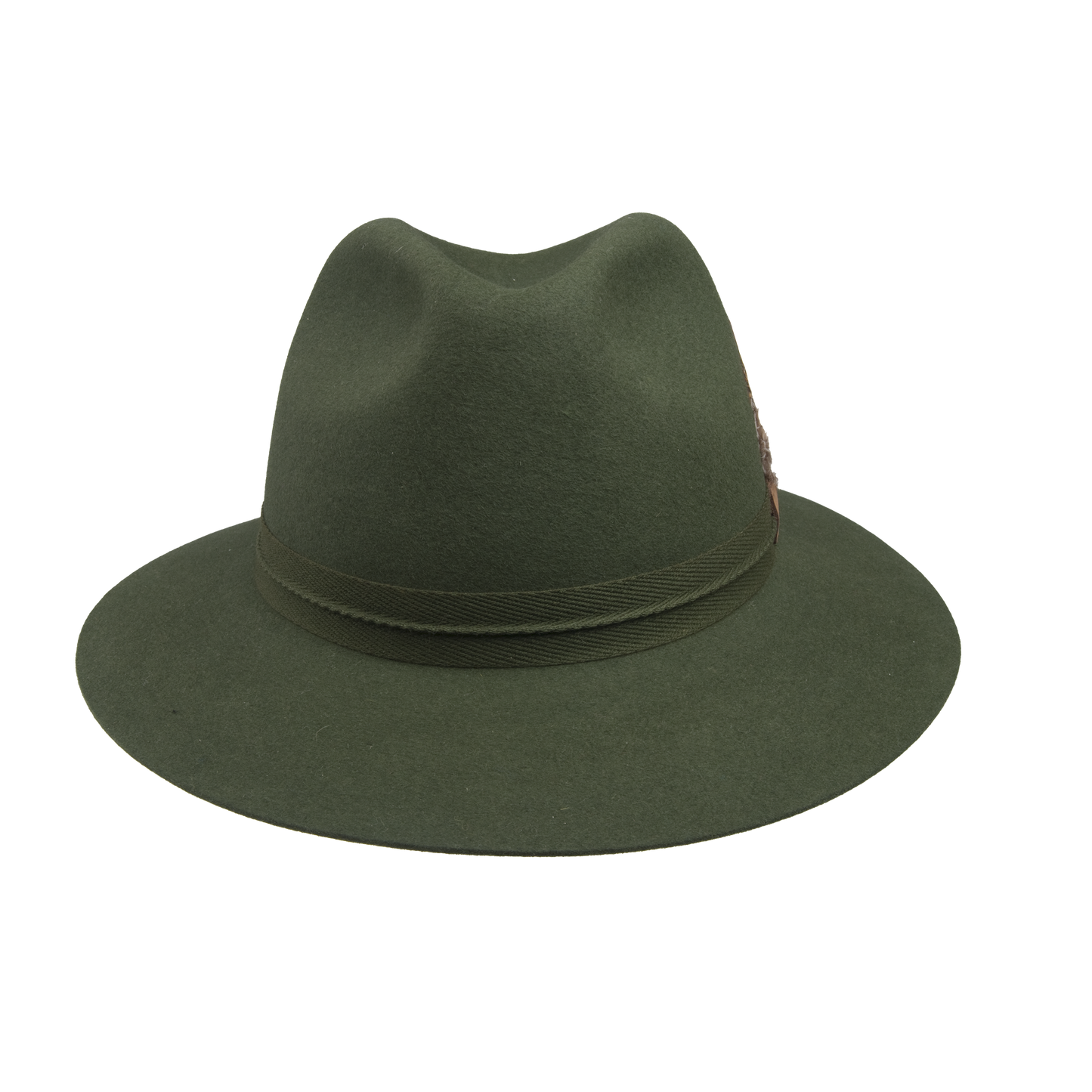 Hunting hat with the leather sweatband trimmed with the woven ribbon leather and feather. It contains non-textile parts of animal origin.