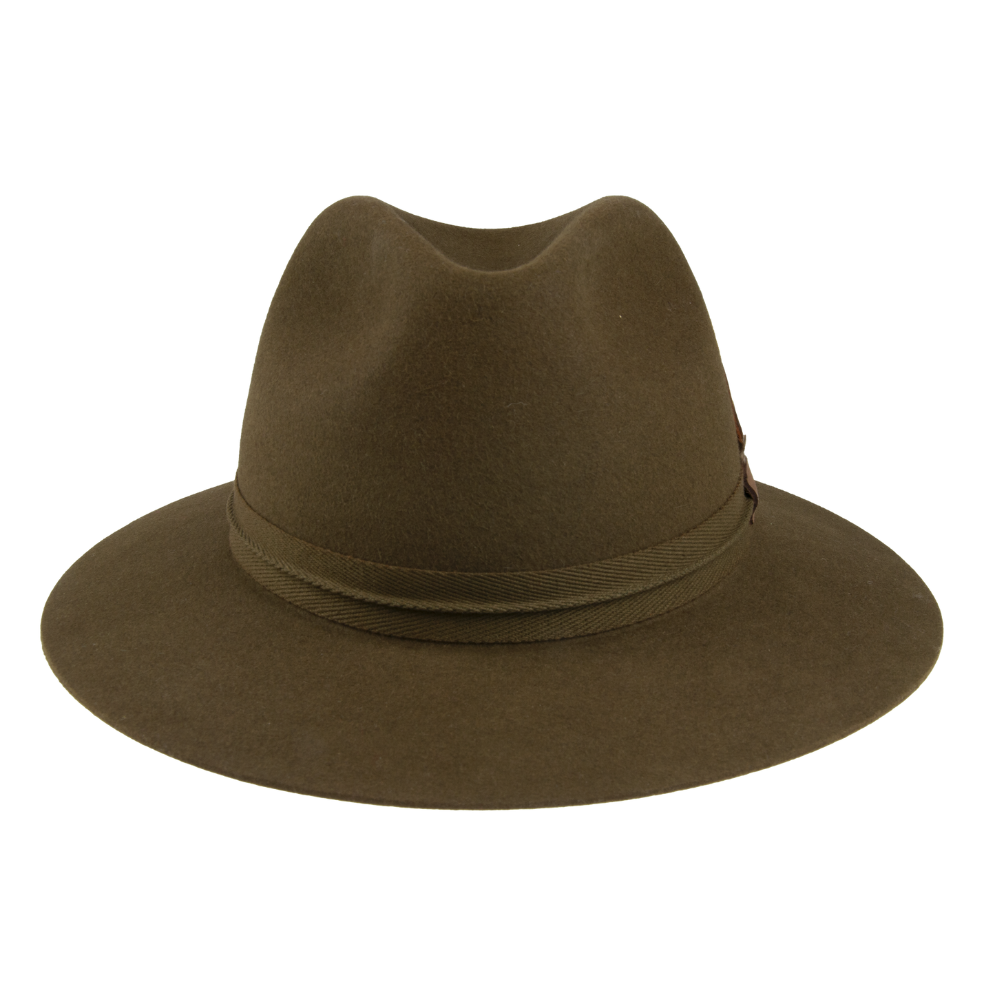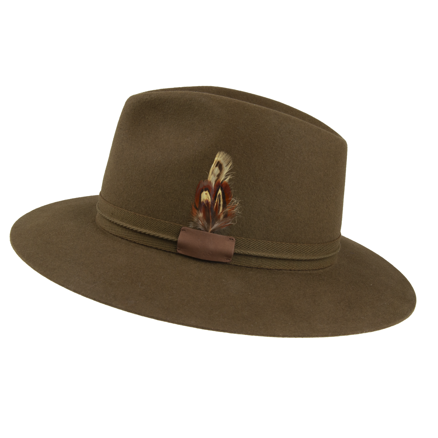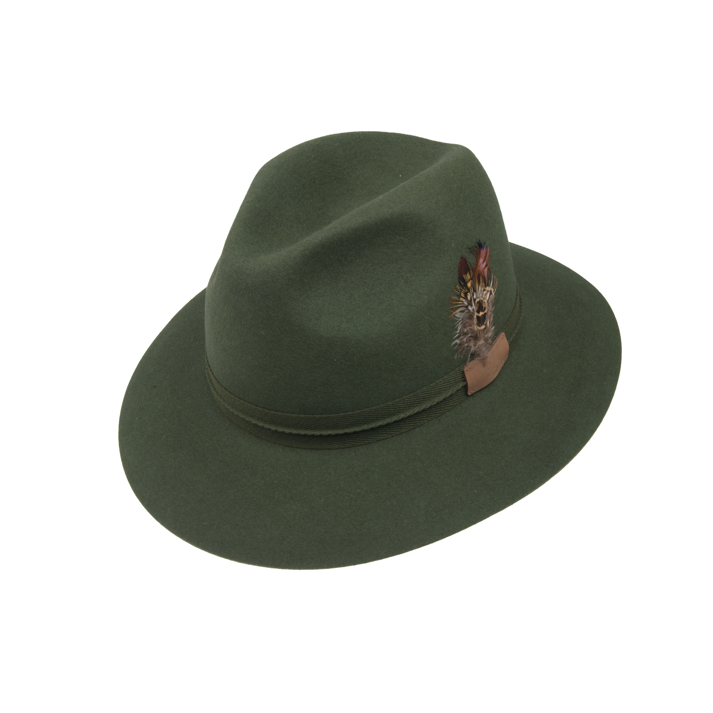 Hunting hat with the leather sweatband trimmed with the woven ribbon leather and feather. It contains non-textile parts of animal origin.