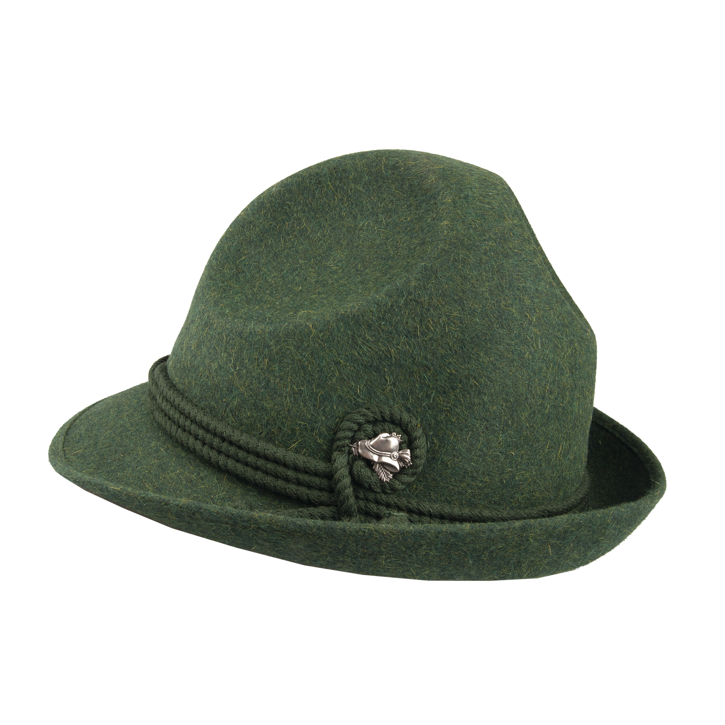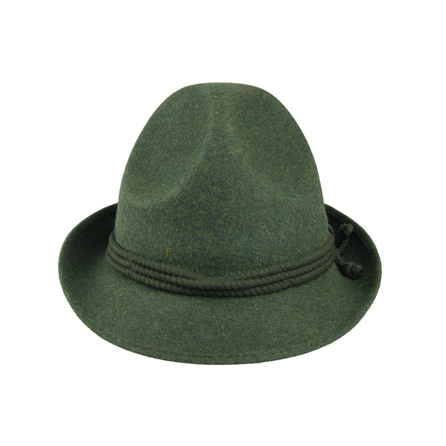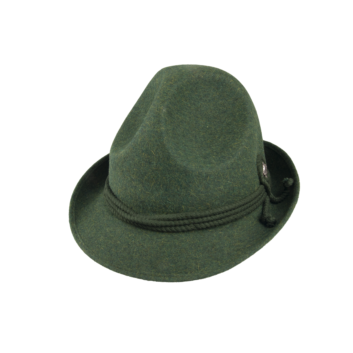 A men's hunting hat with three indentations decorated with a twisted cord and jewelry. The leather sweatband ensures comfort during wear.