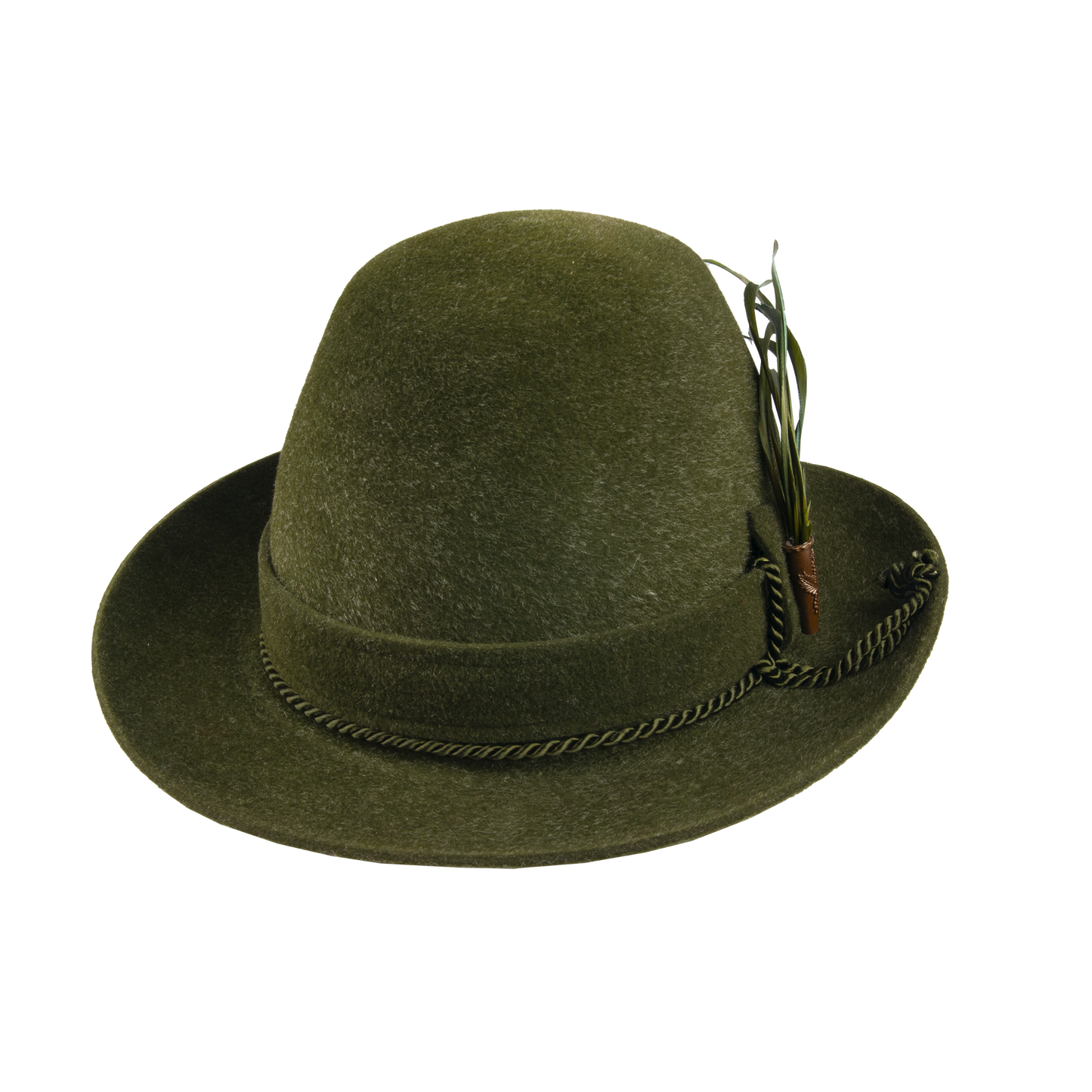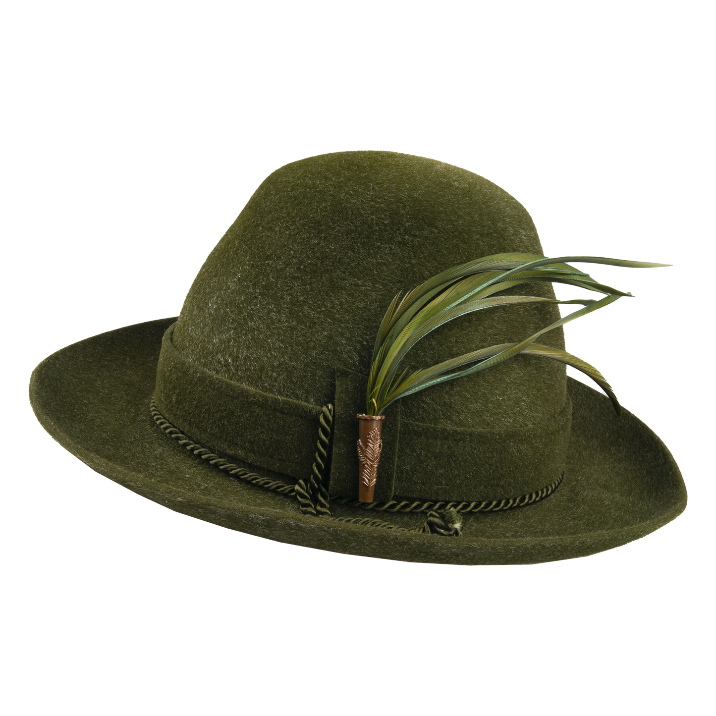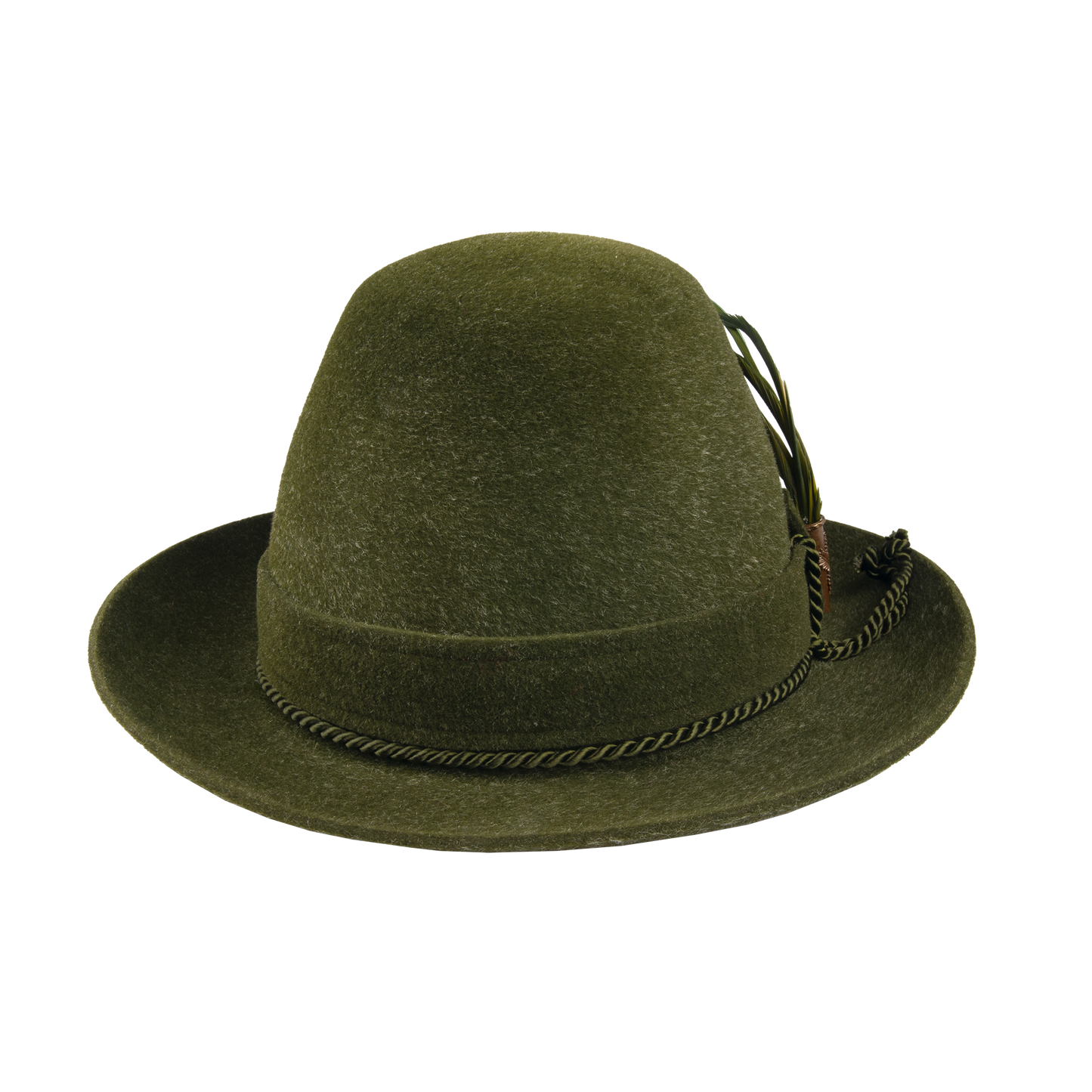 A hunting hat without indentations adorned with a felt band twisted cord jewelry and feathers. For maximum comfort it is equipped with a stretch sweatband.