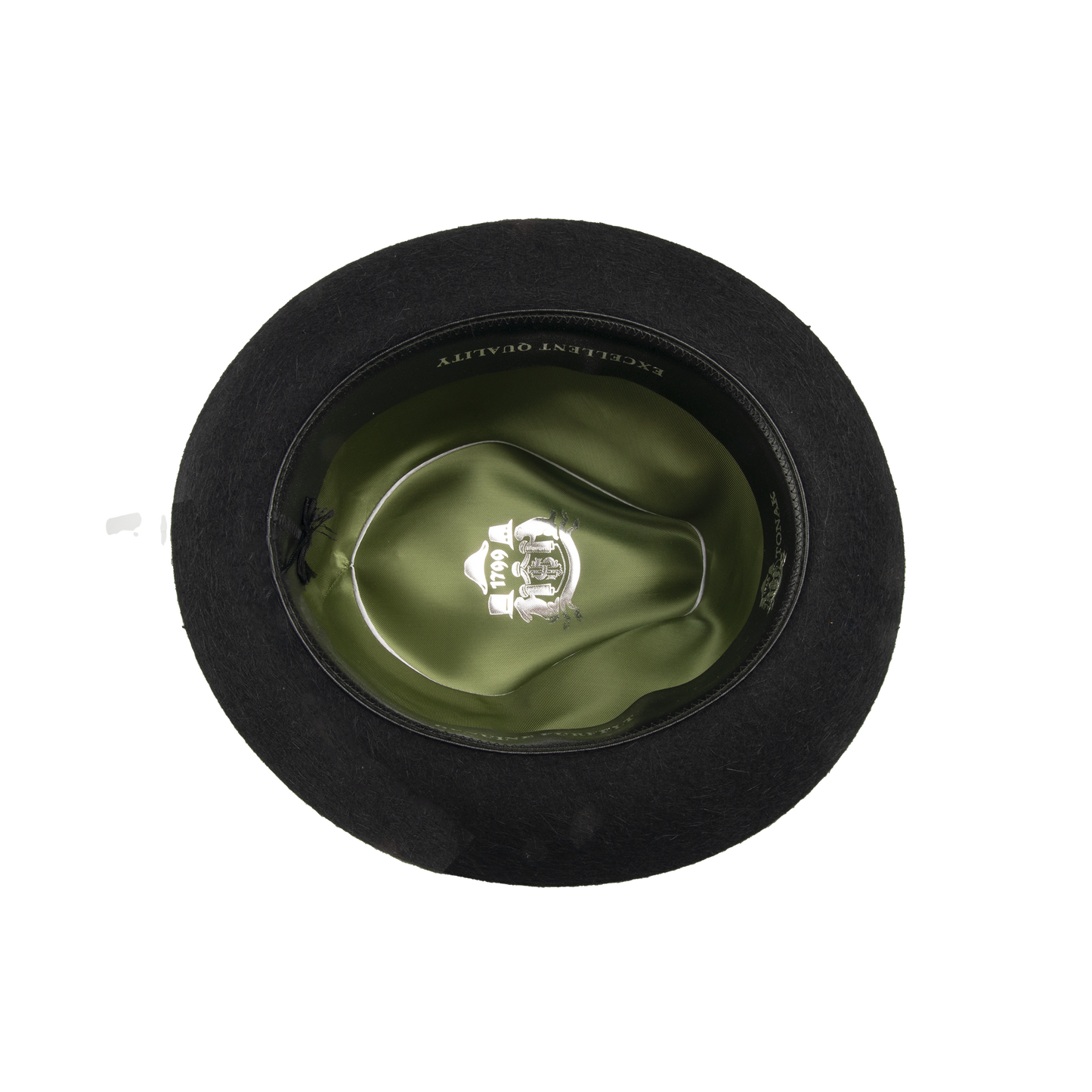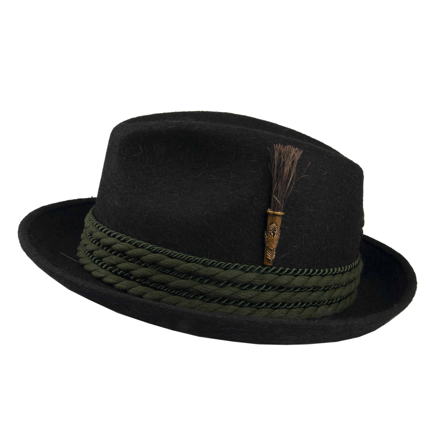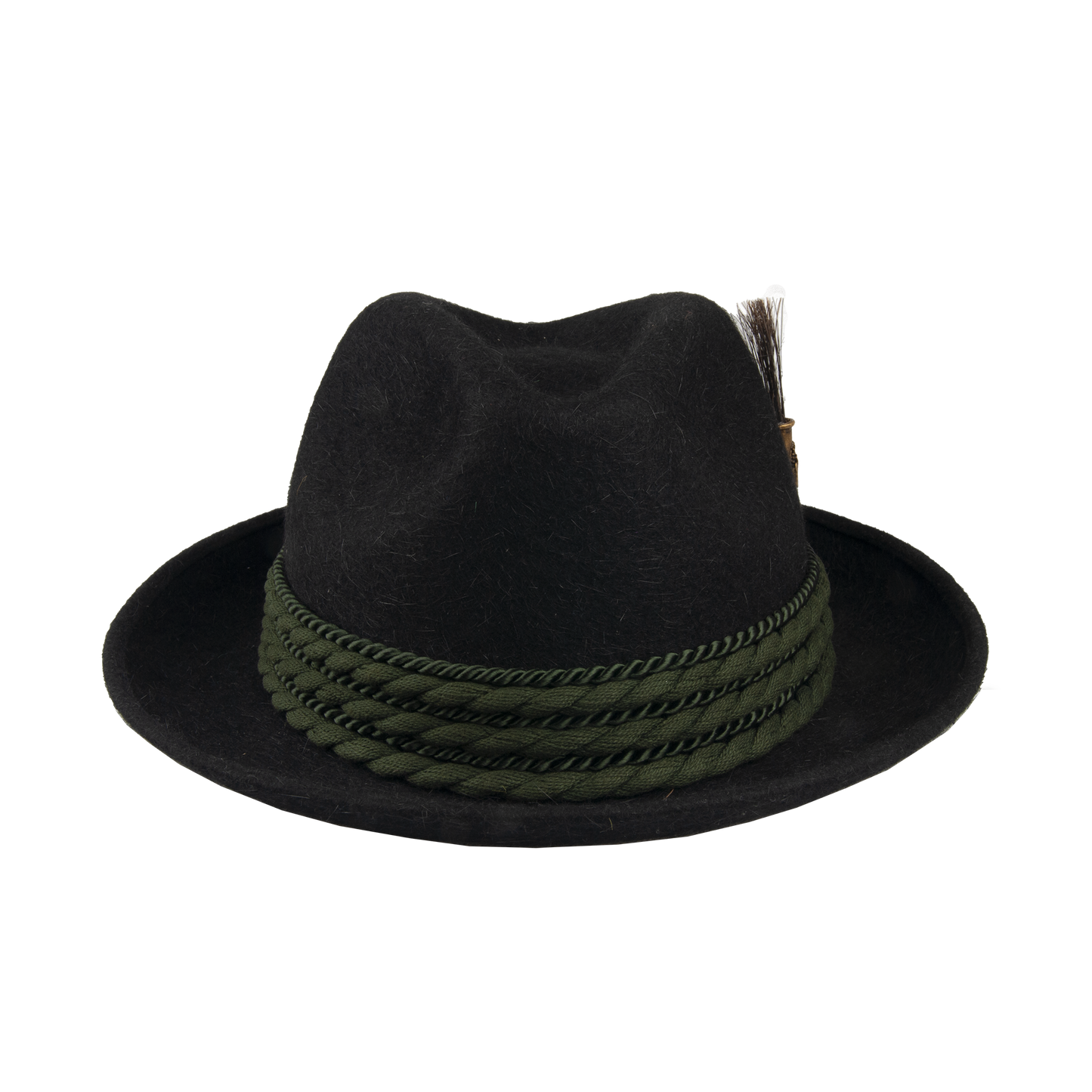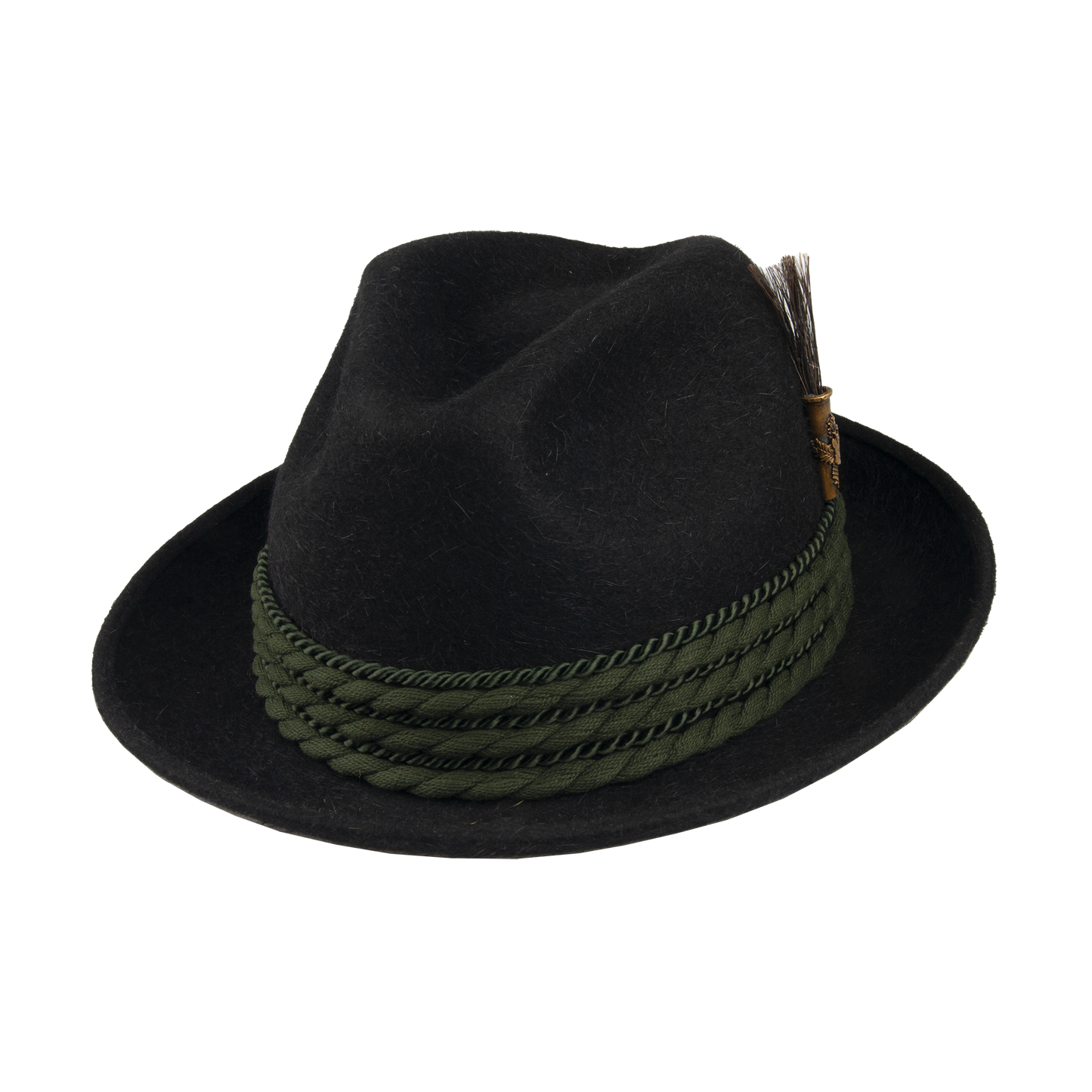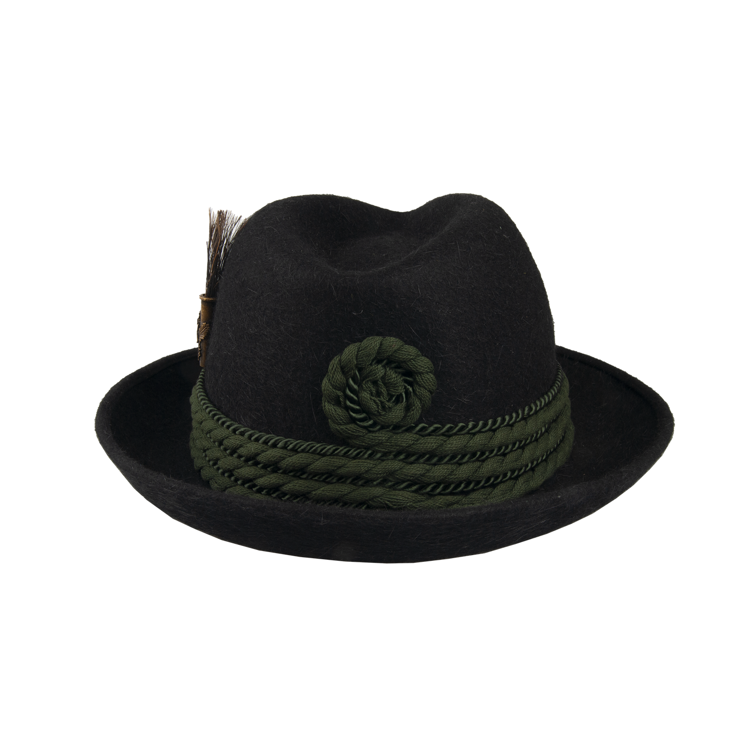 A traditional hunting hat with elegant embellishments including a thicker and thinner twisted cord jewelry and a bristle ornament that gives it a distinctive look. The leather sweatband and lining ensure comfort and durability during wear.