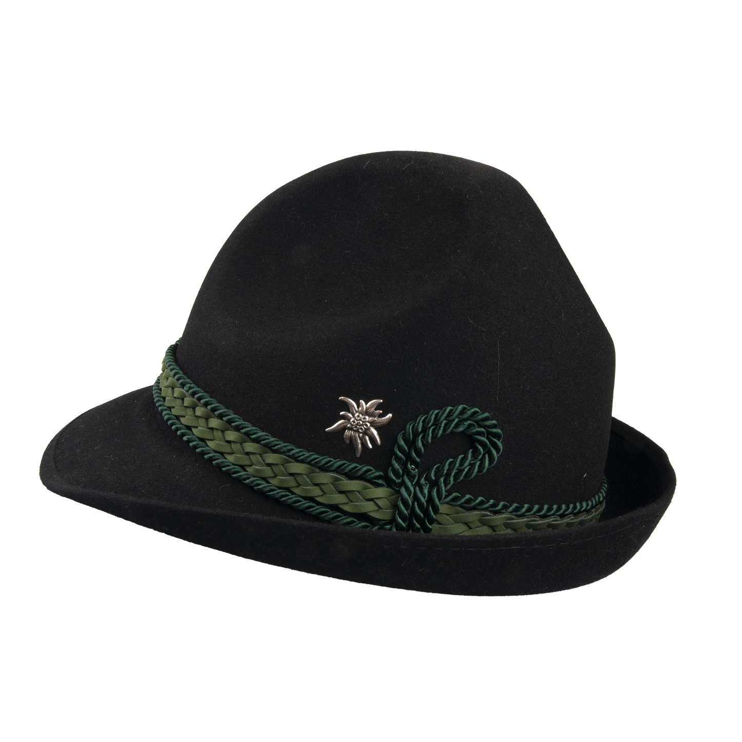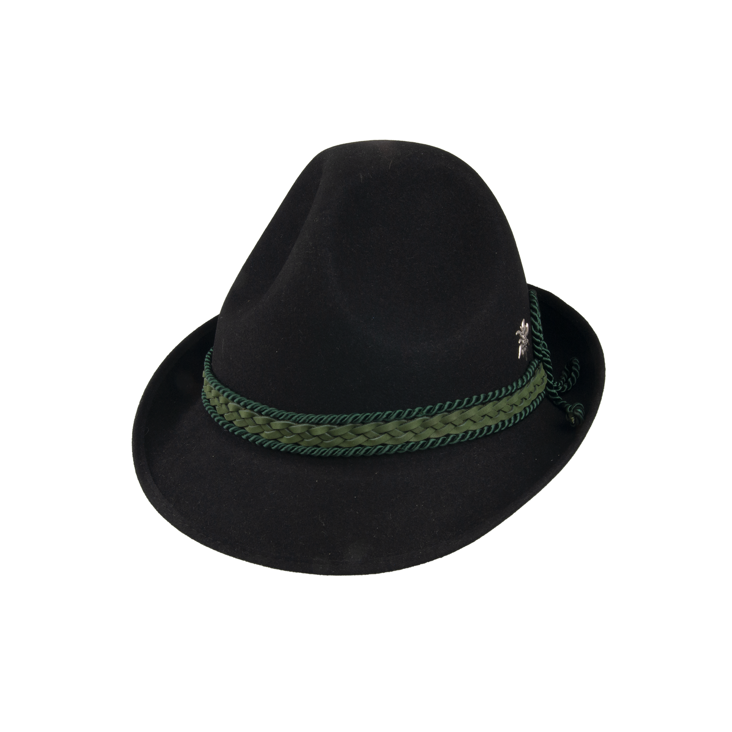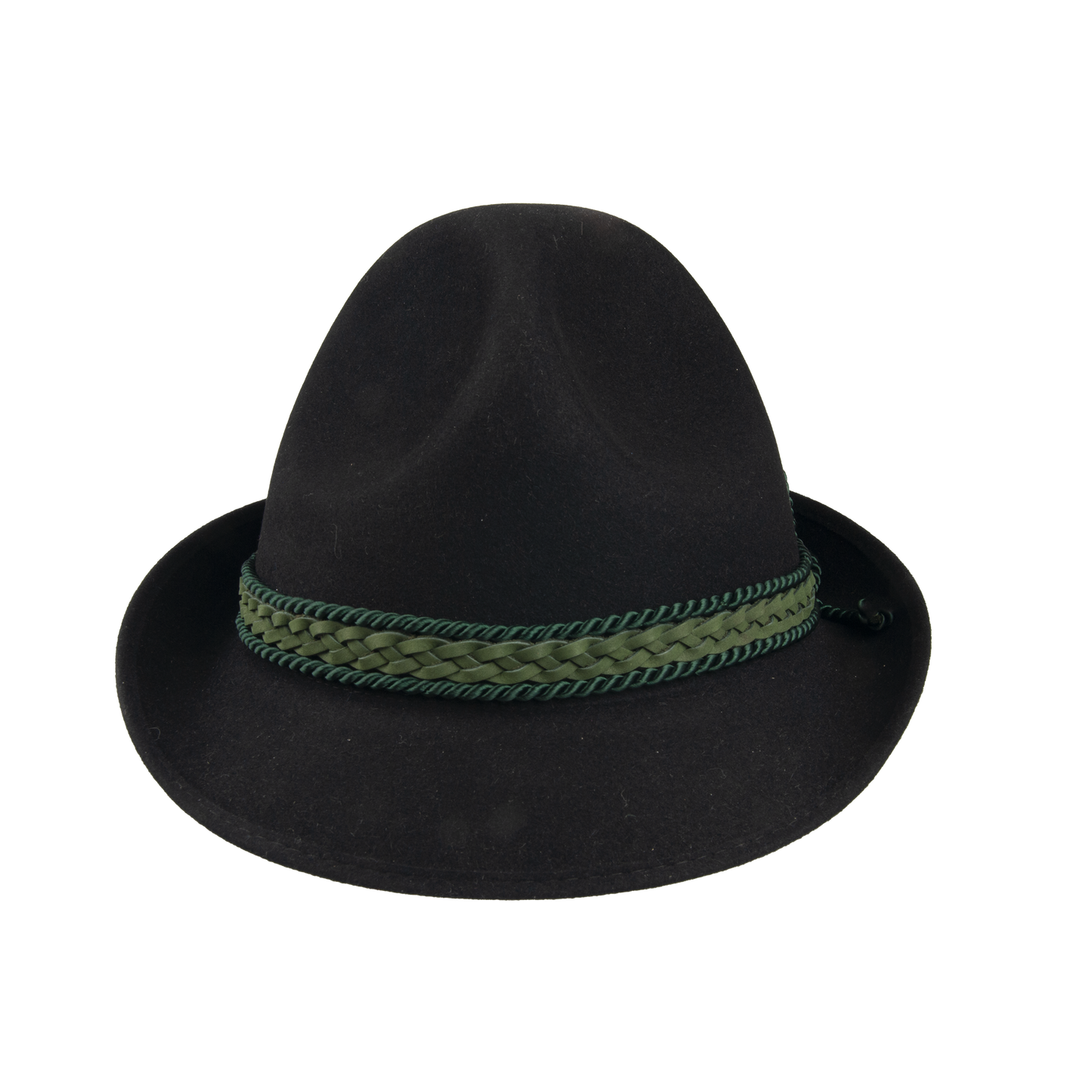 A hunting hat with three indentations a braided band and a twisted cord adorned with jewelry. The sweatband ensures a secure fit throughout the day.