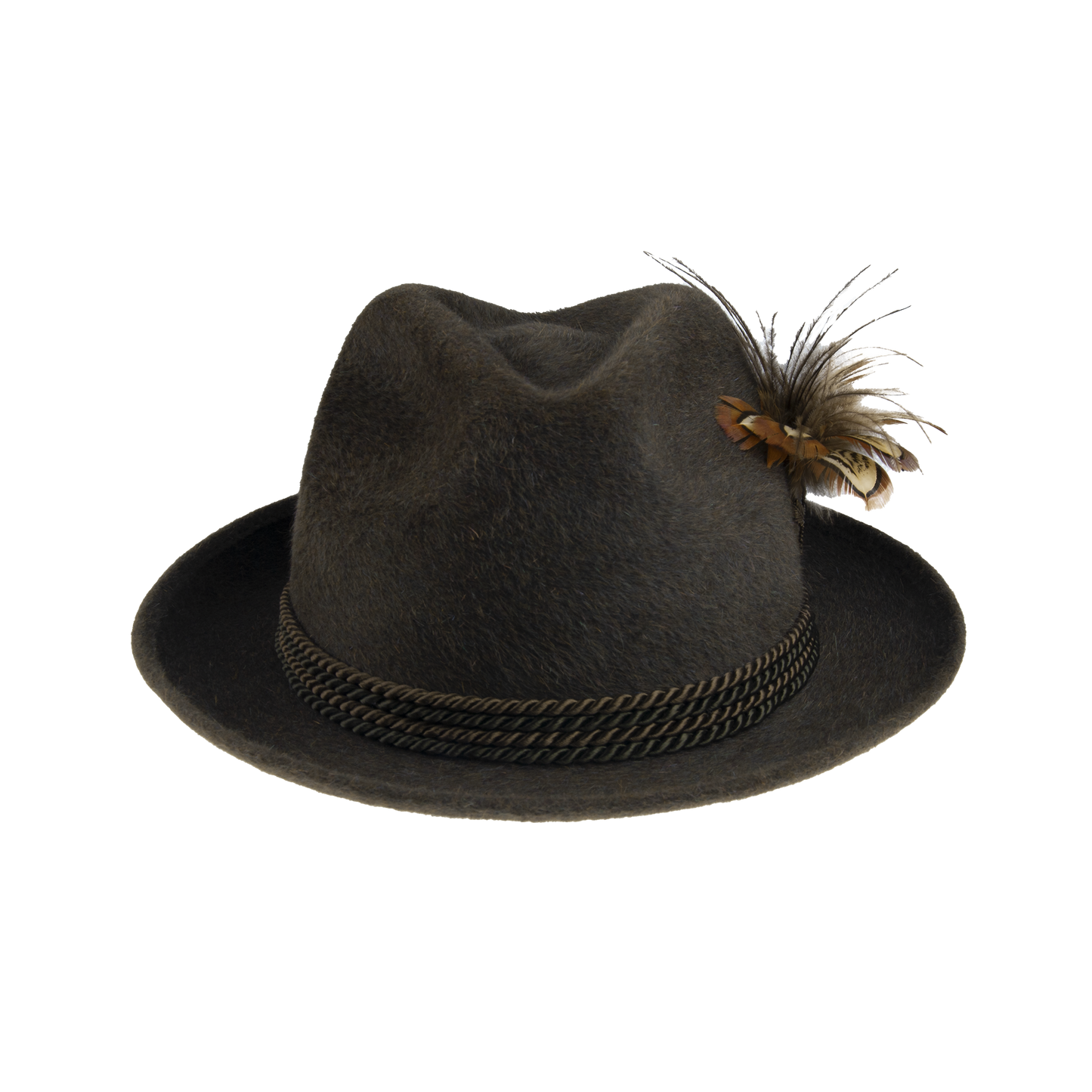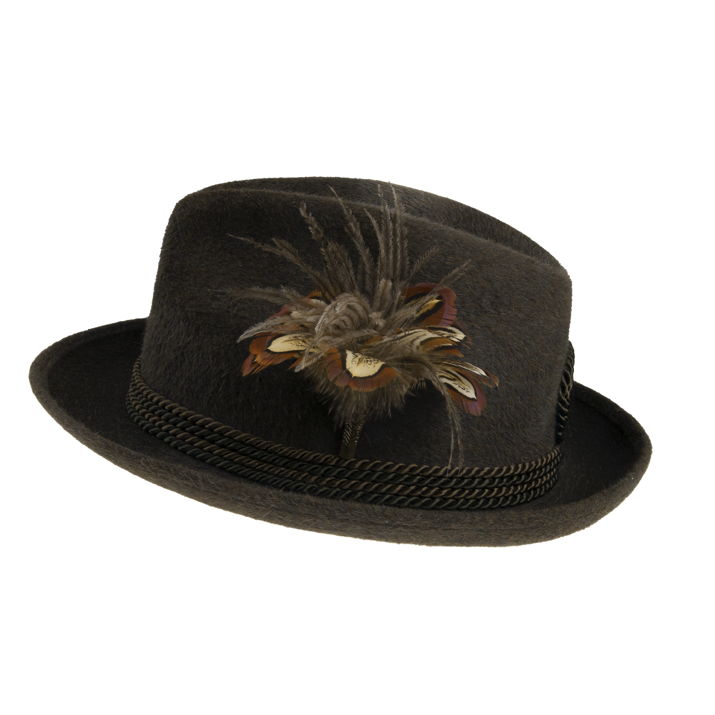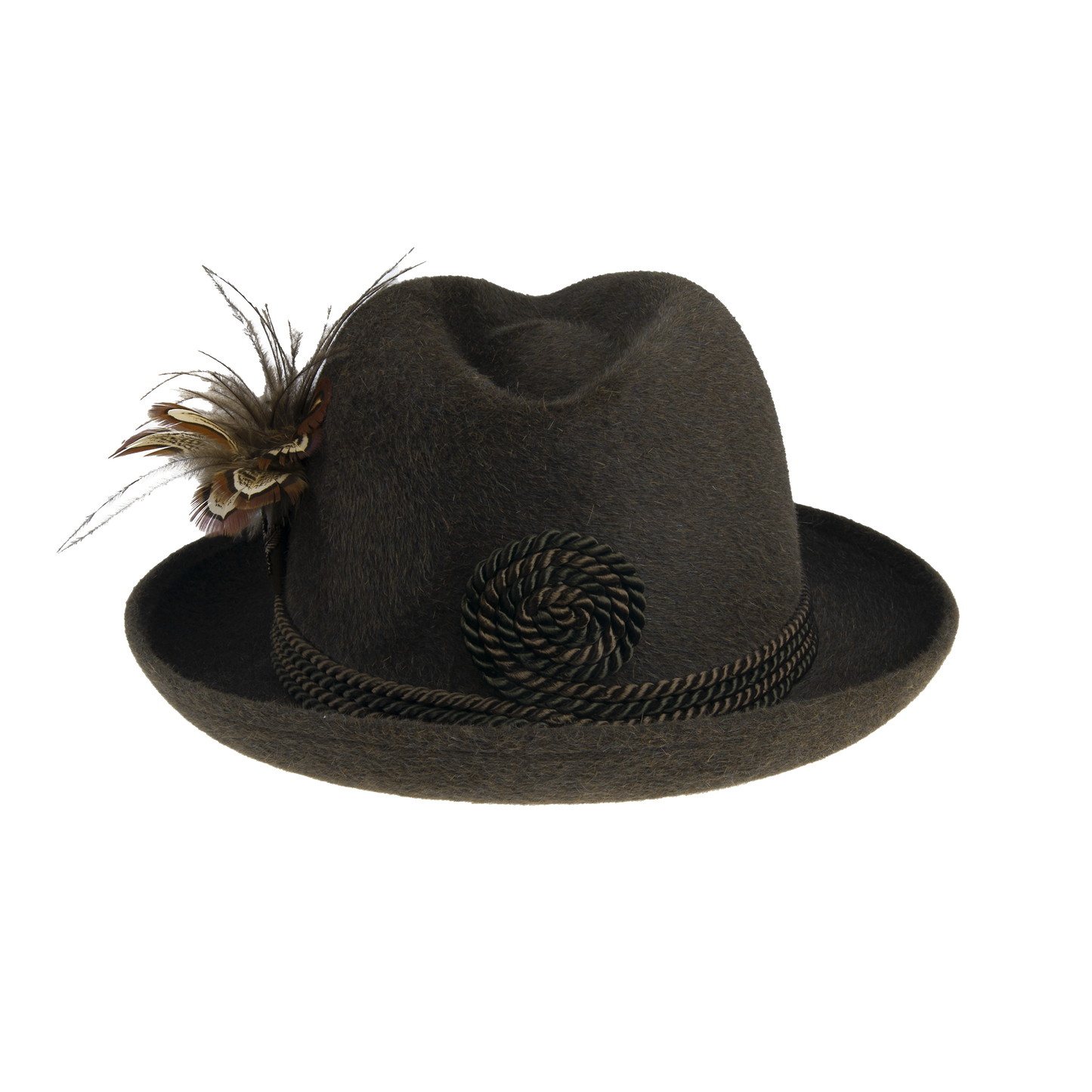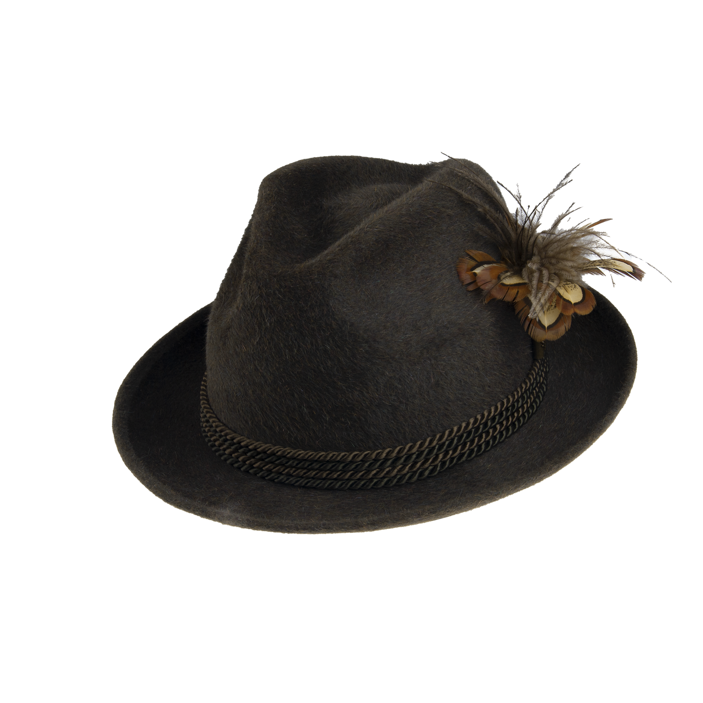 A hunting hat with twisted cords jewelry and feathers. This model stands out with its original appearance attracting attention at any event. It is also equipped with a sweatband.