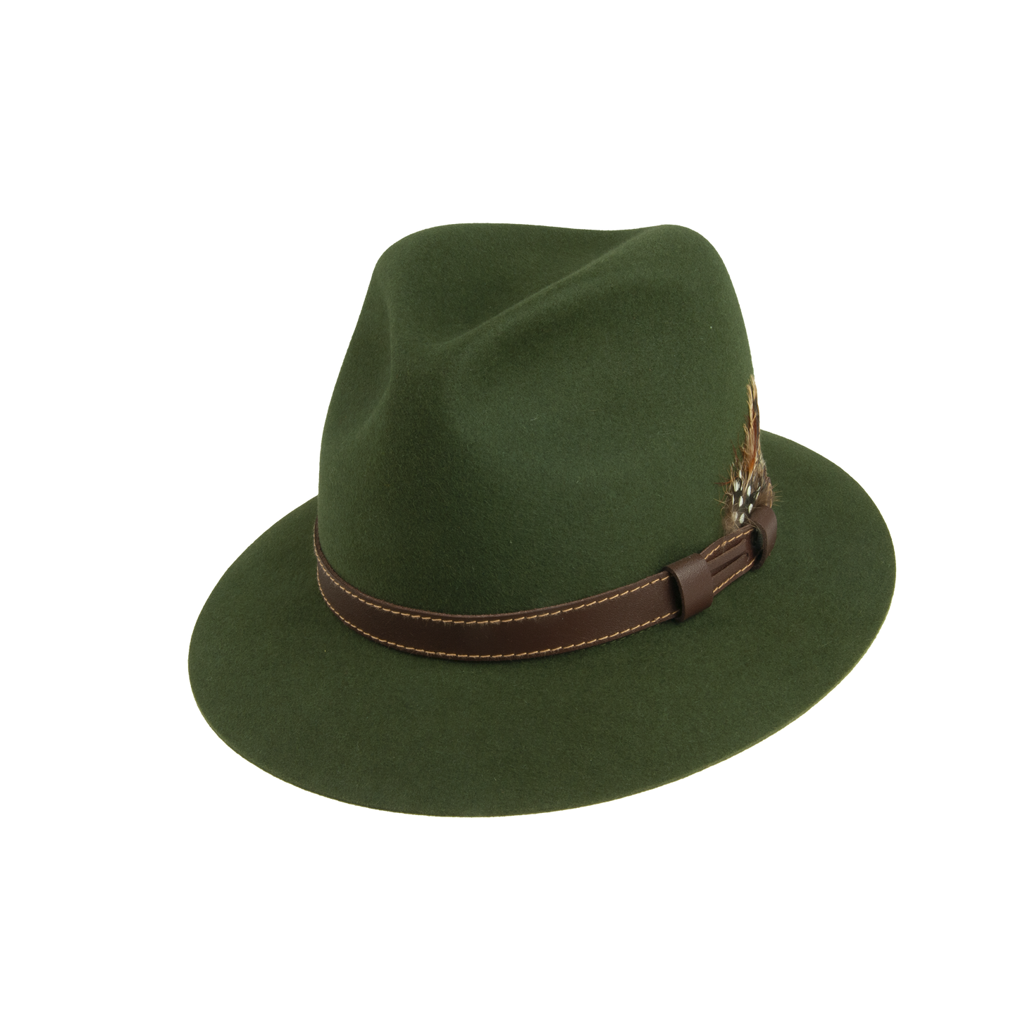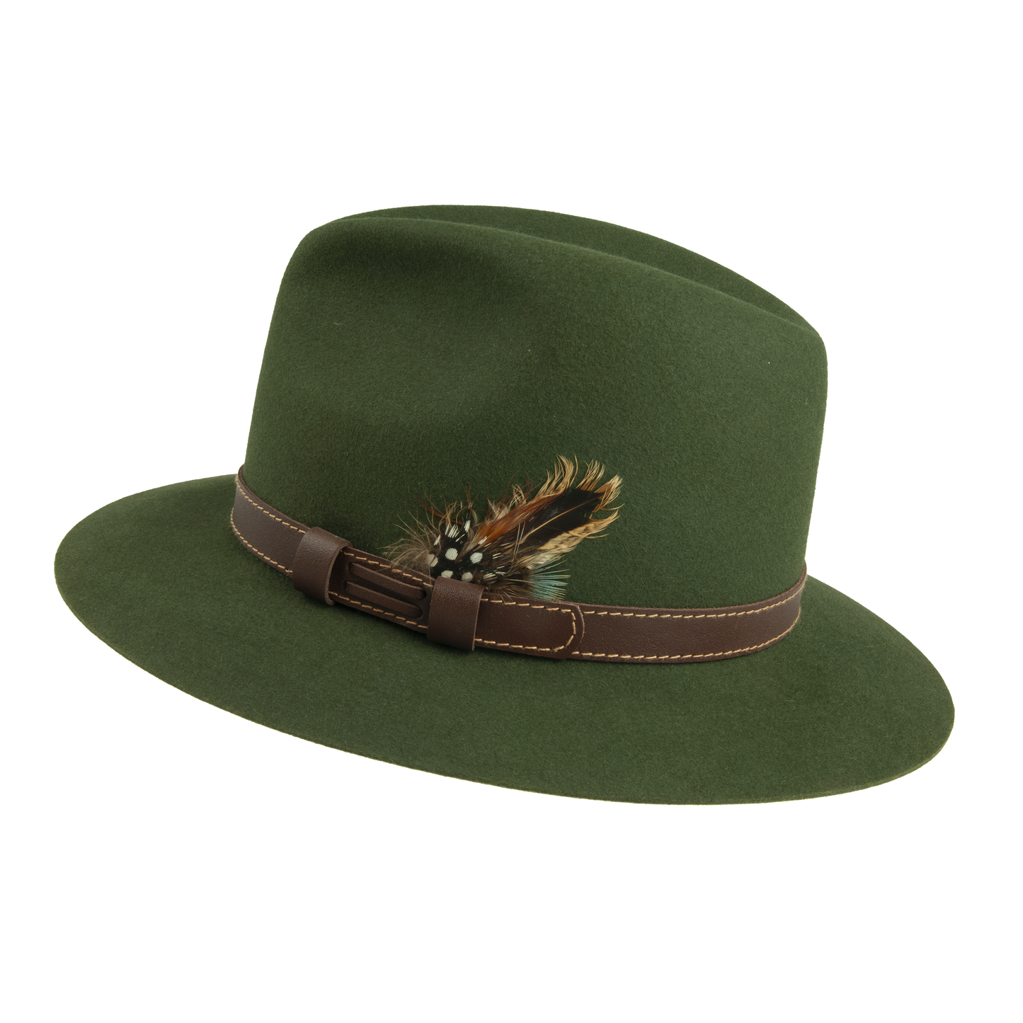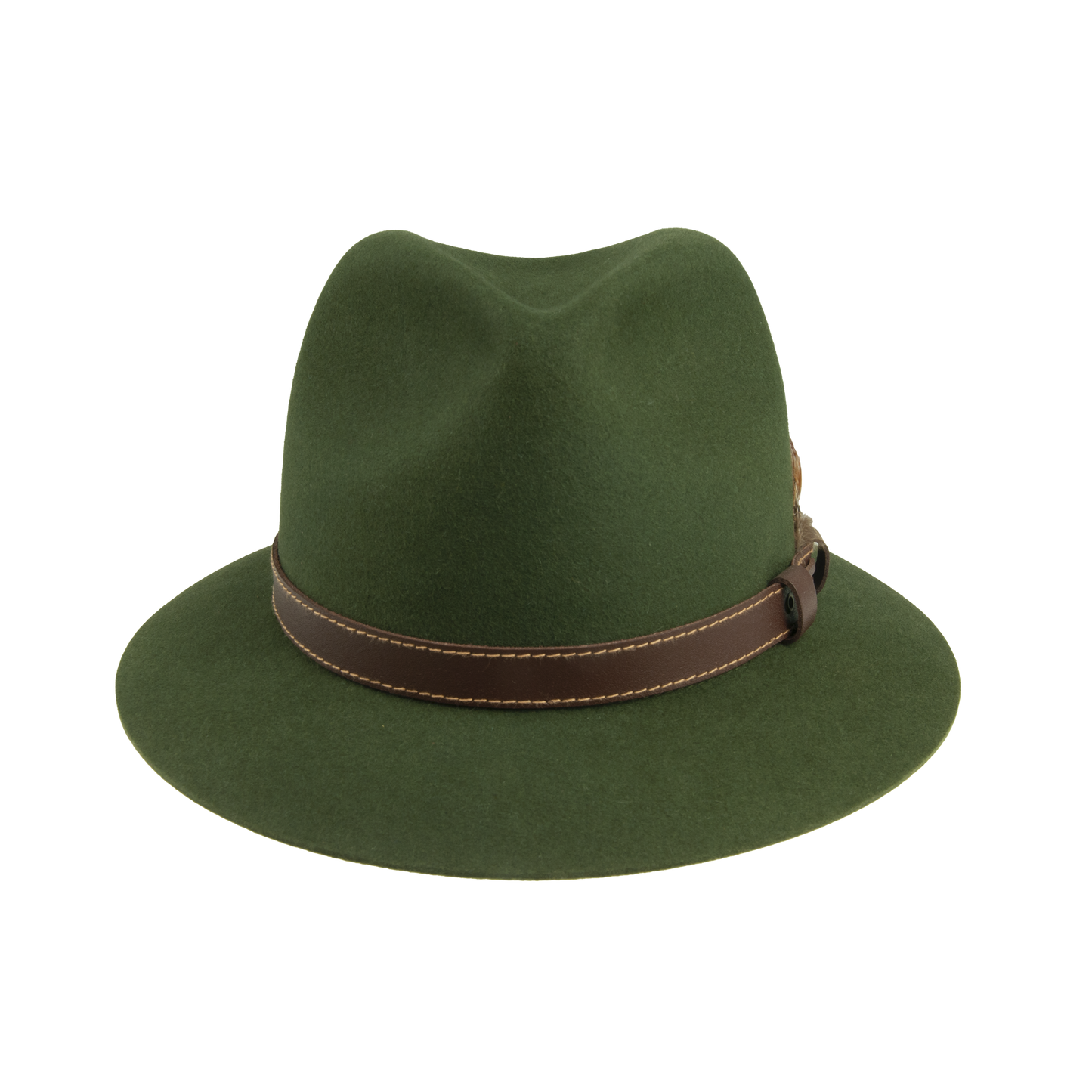 A traditional hunting hat adorned with a leather band that adds an elegant touch. The sweatband ensures comfort even during long wear making it an ideal companion for outdoor activities.