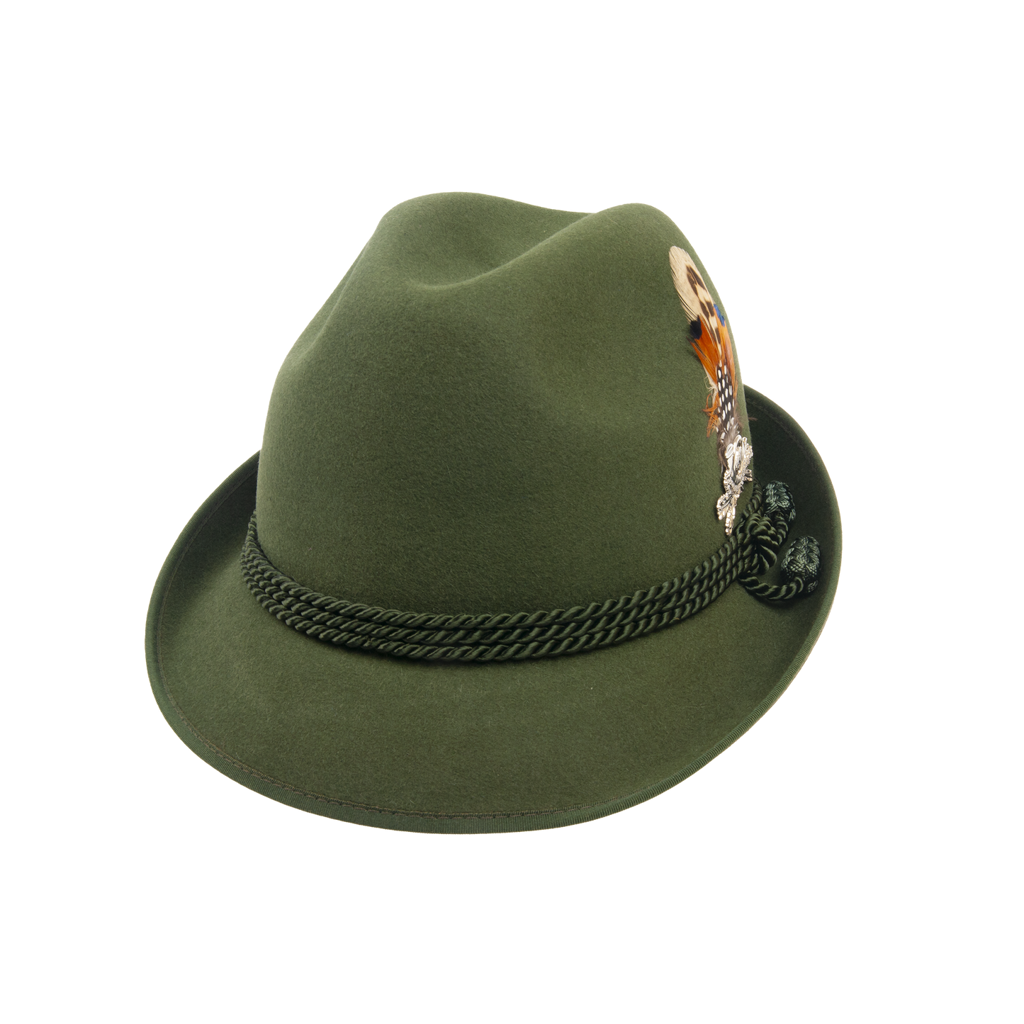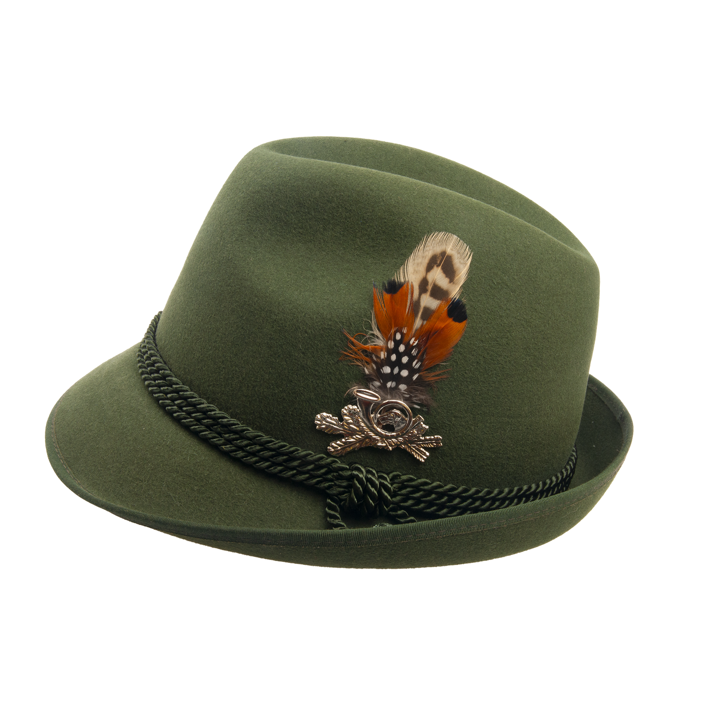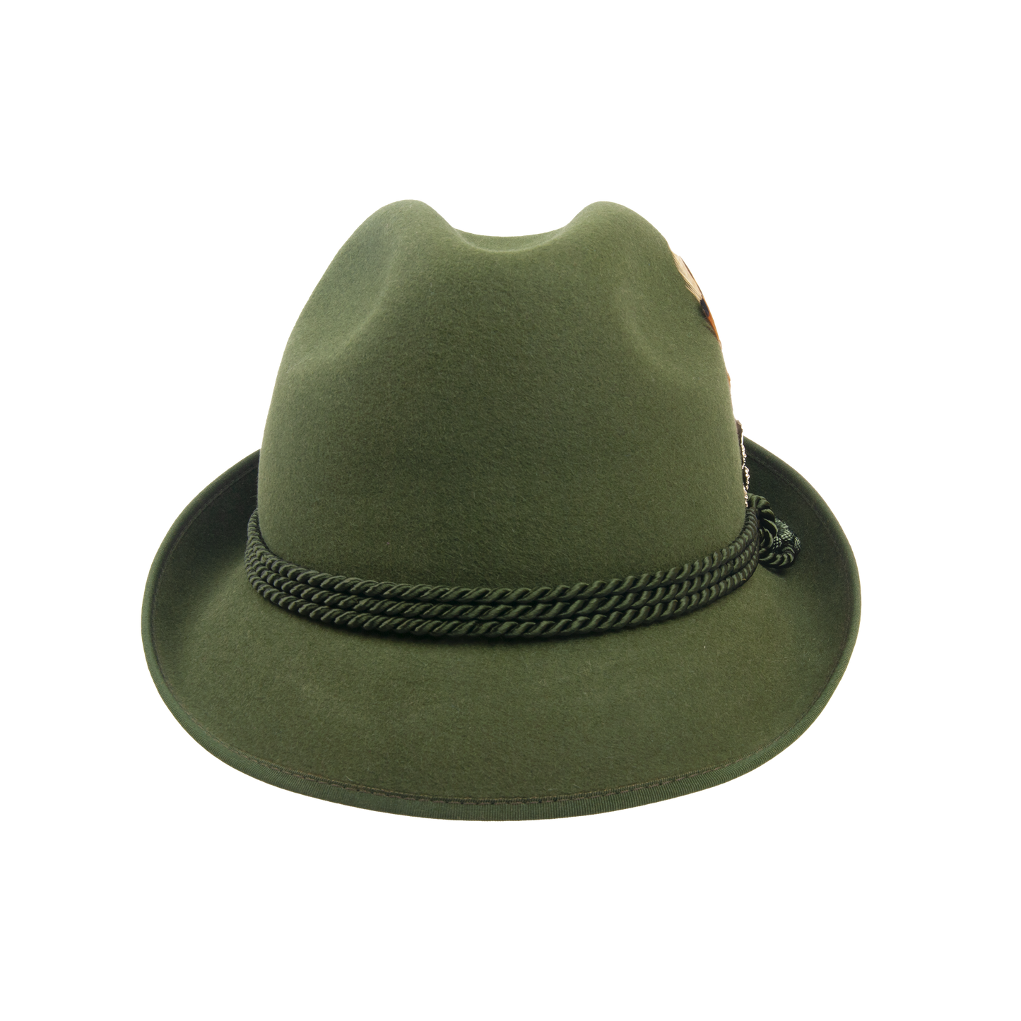 Hunting hat with the stretch sweatband trimmed with the twisted cord with the cones bijouterie feather flanked edge. It contains non-textile parts of animal origin.