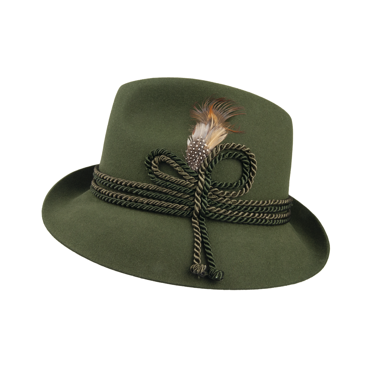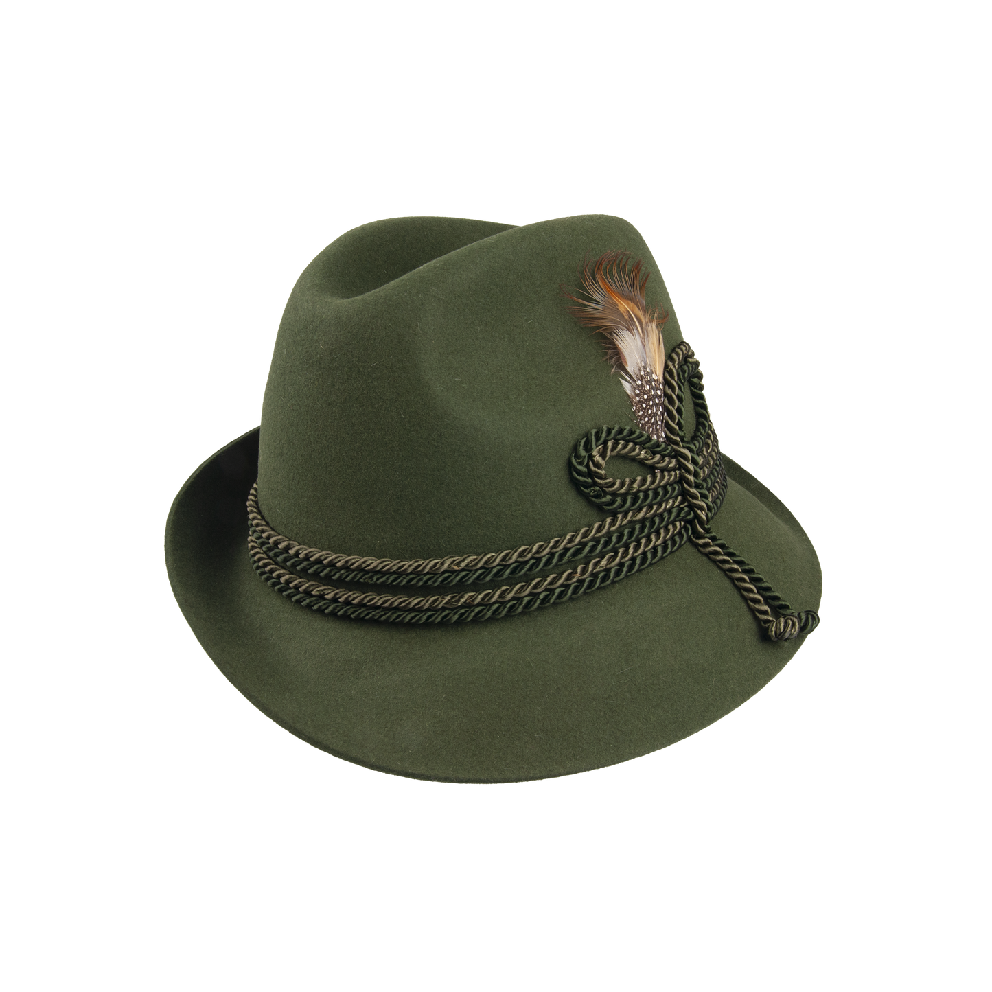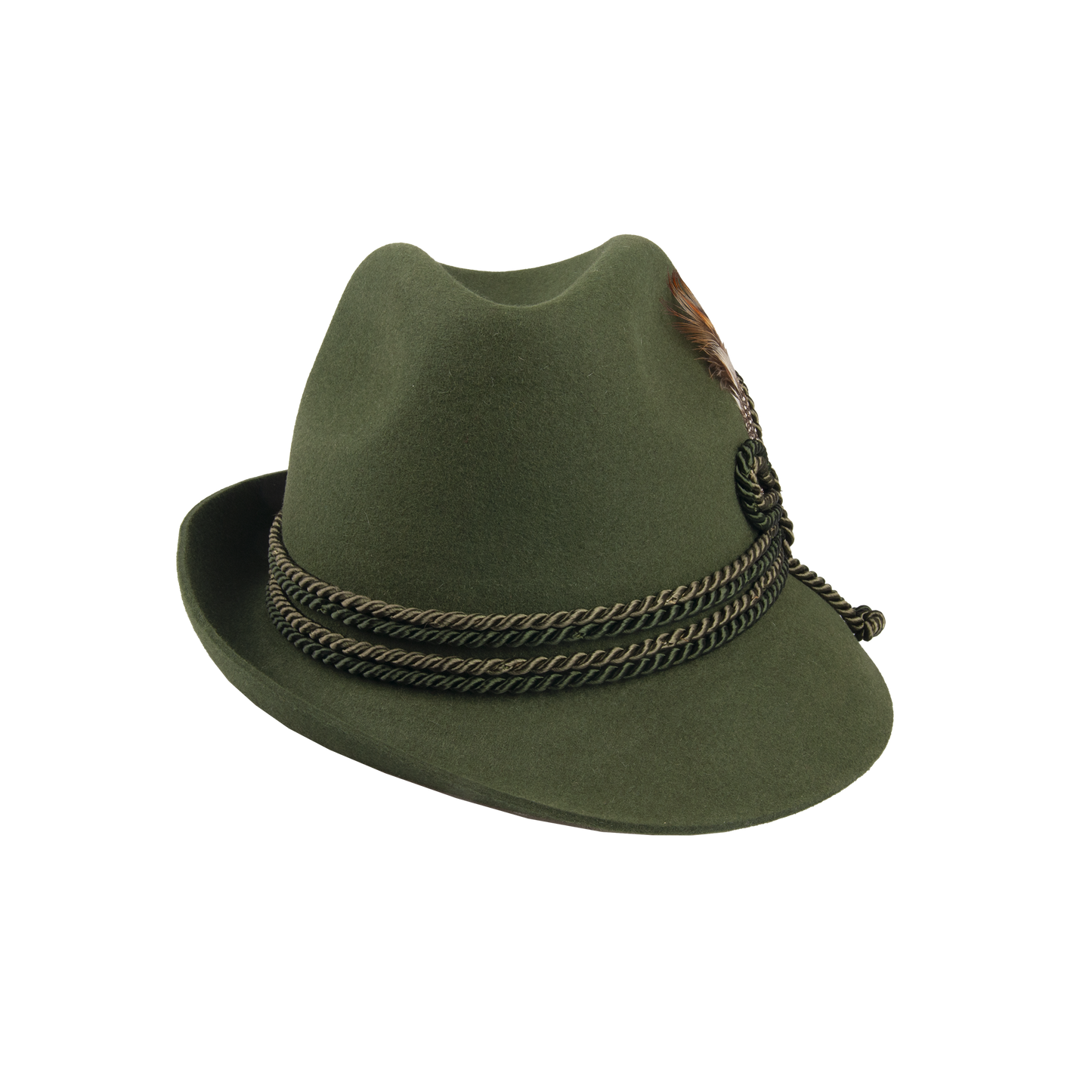 A hunting hat with a glossy twisted cord and feathers standing out with its distinctive aesthetics. It combines a traditional look with functionality and thanks to the sweatband it is perfectly adapted for long outdoor expeditions.