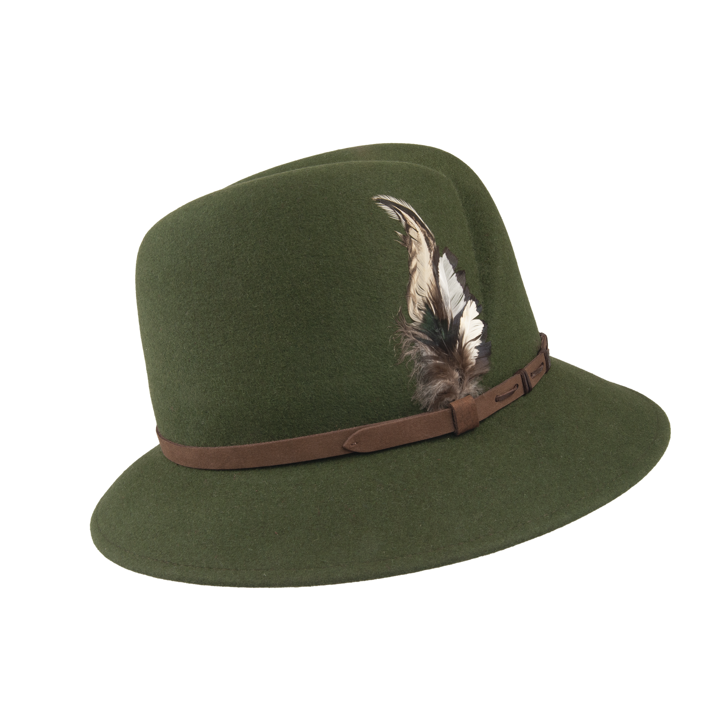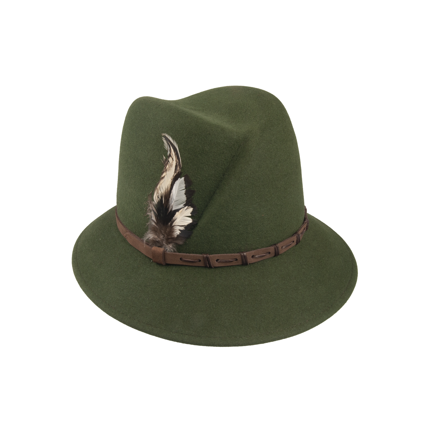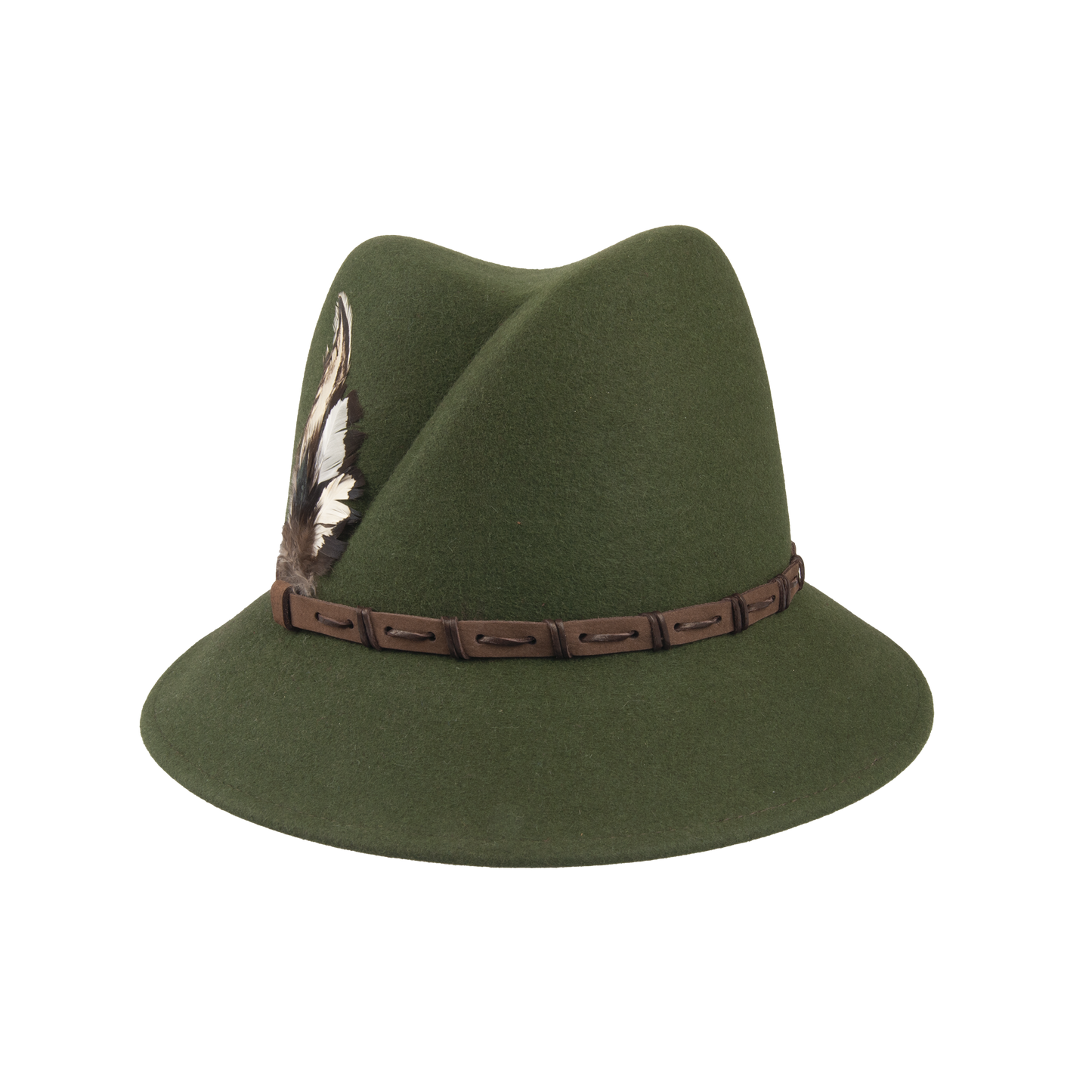 A hunting hat with a characteristic crown indentation adding uniqueness to its traditional appearance. The decorative leather band with feathers highlights its hunting style while the sweatband helps maintain comfort during extended wear