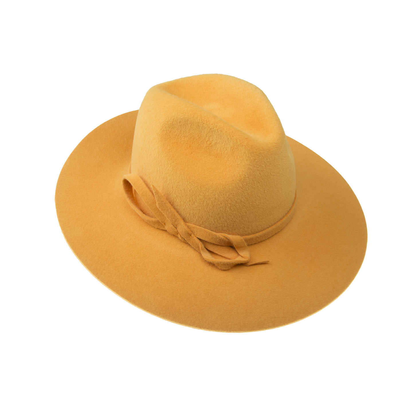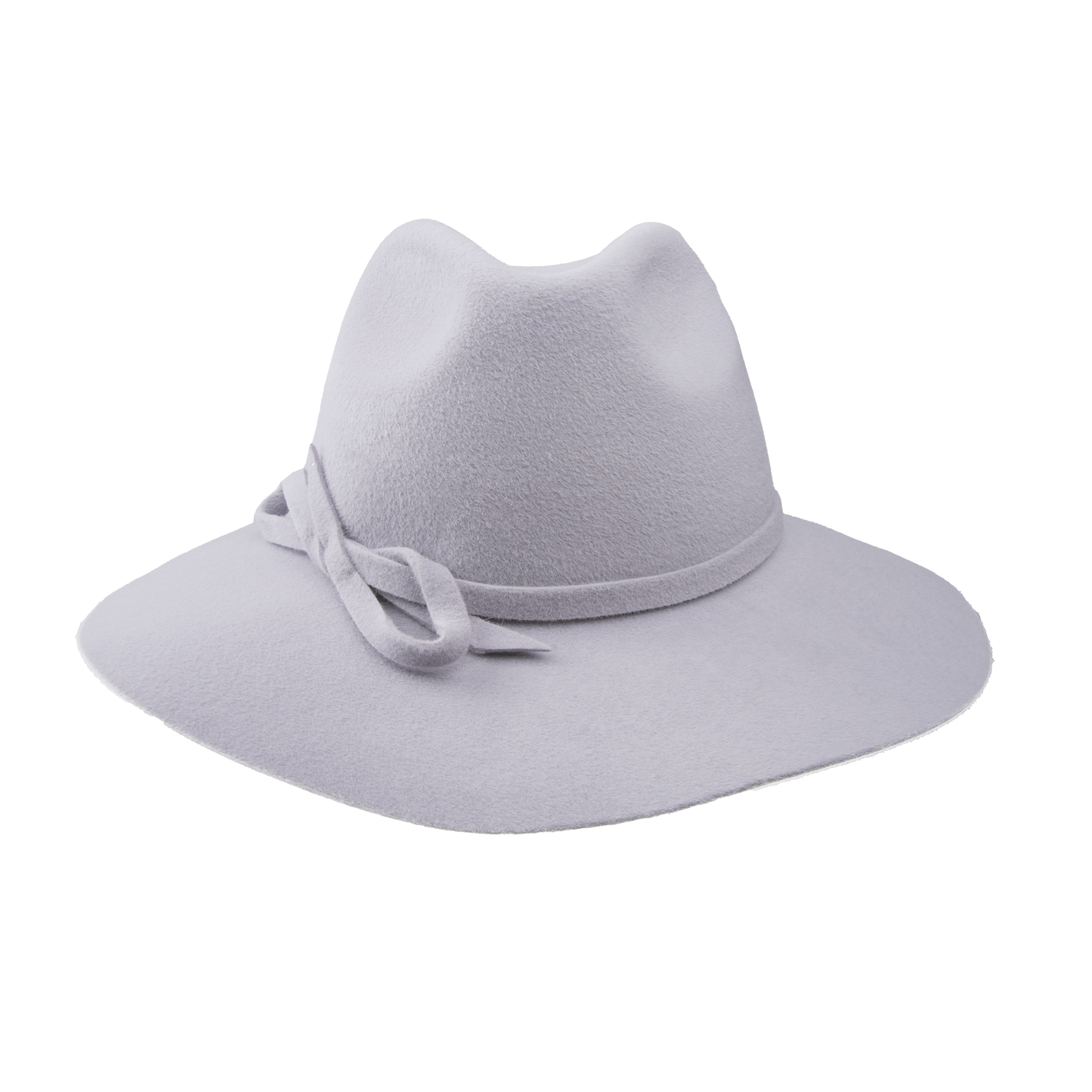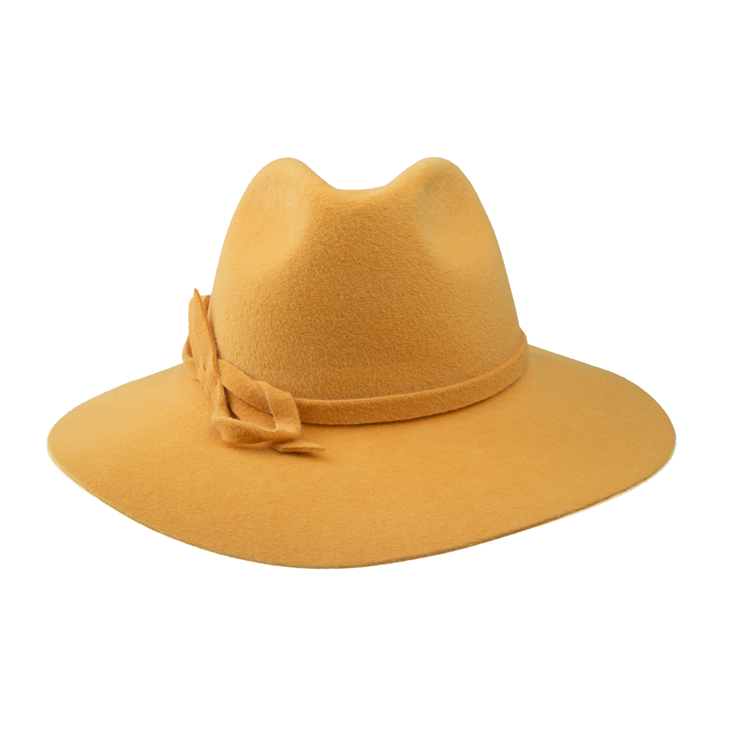 Velour hat with the stretch sweat band trimmed with the felt belt and the bow. Width of the brim 8,5 cm.