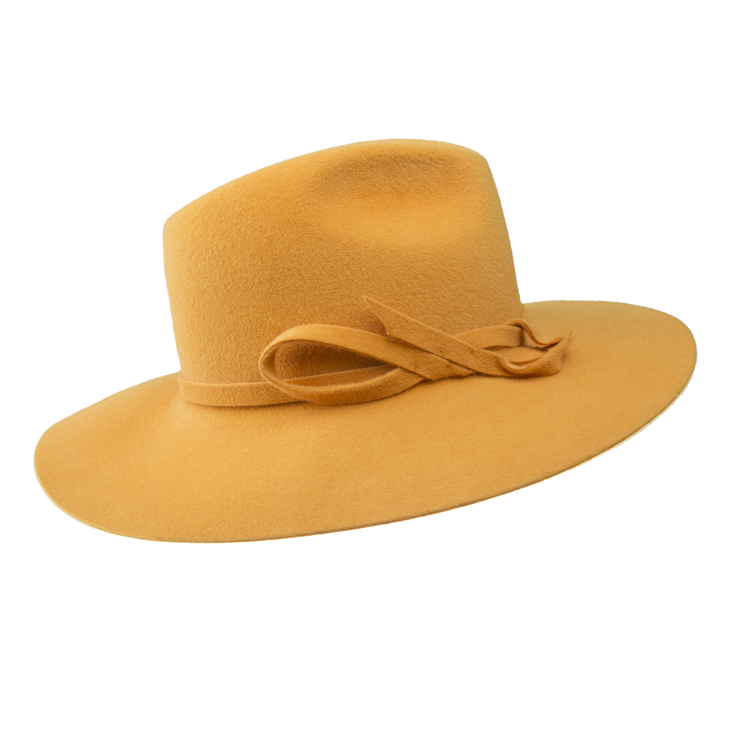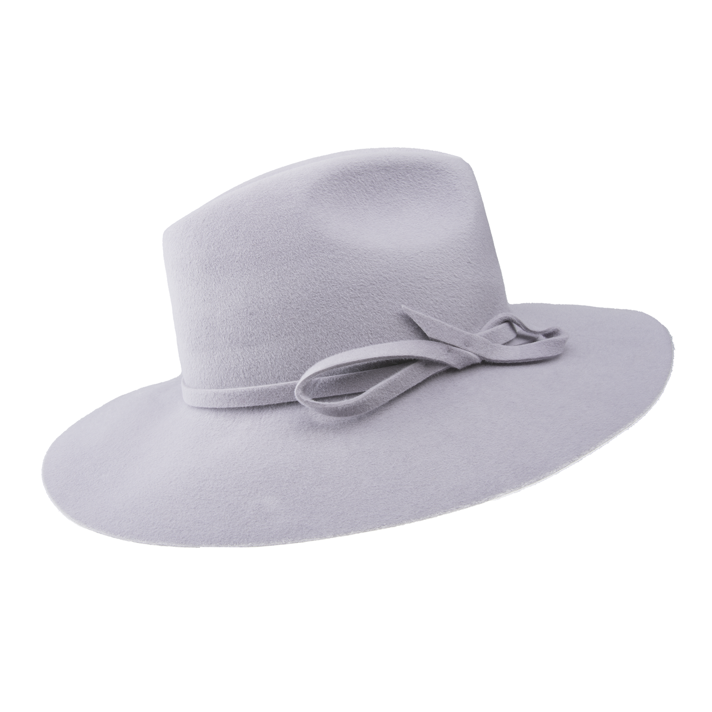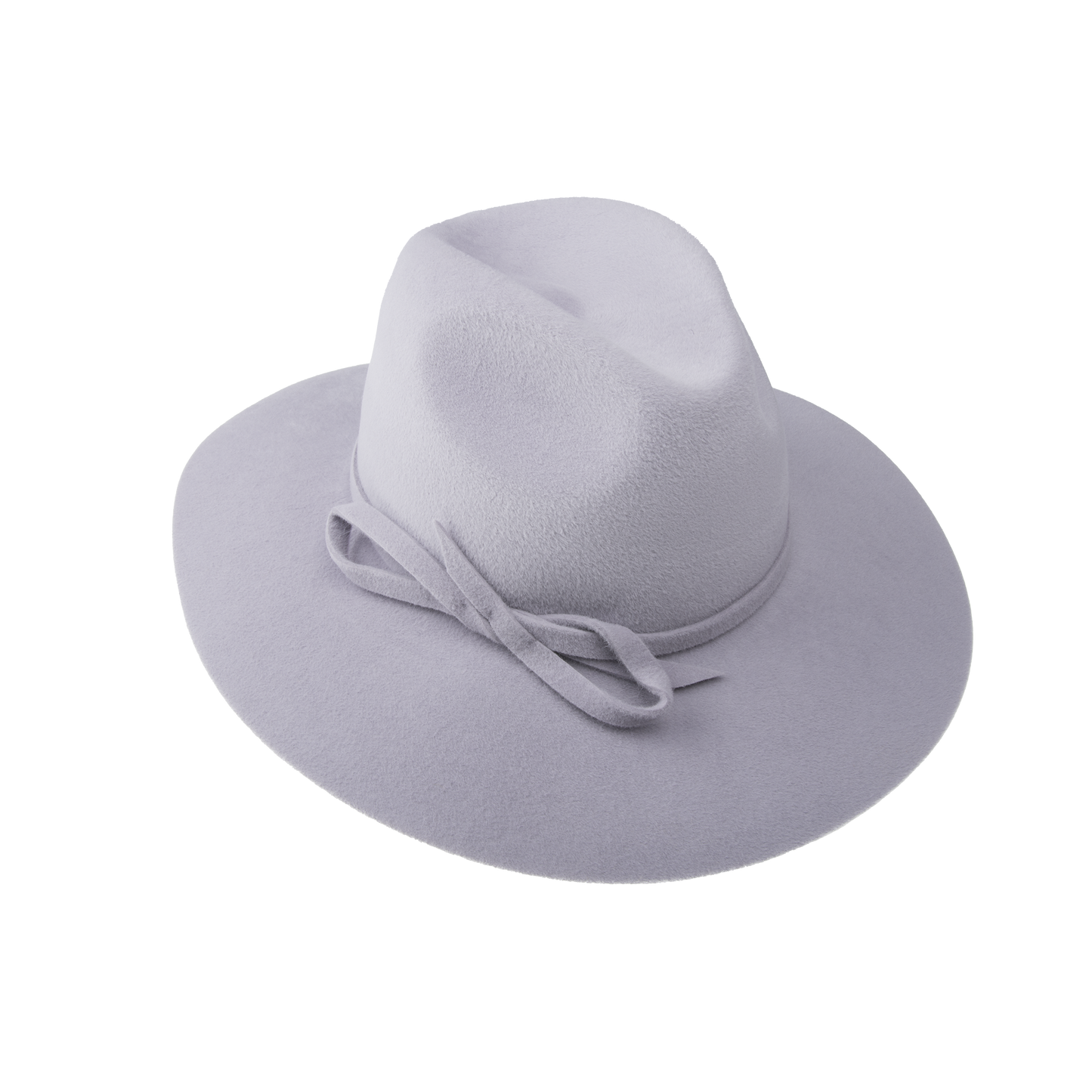 Velour hat with the stretch sweat band trimmed with the felt belt and the bow. Width of the brim 8,5 cm.
