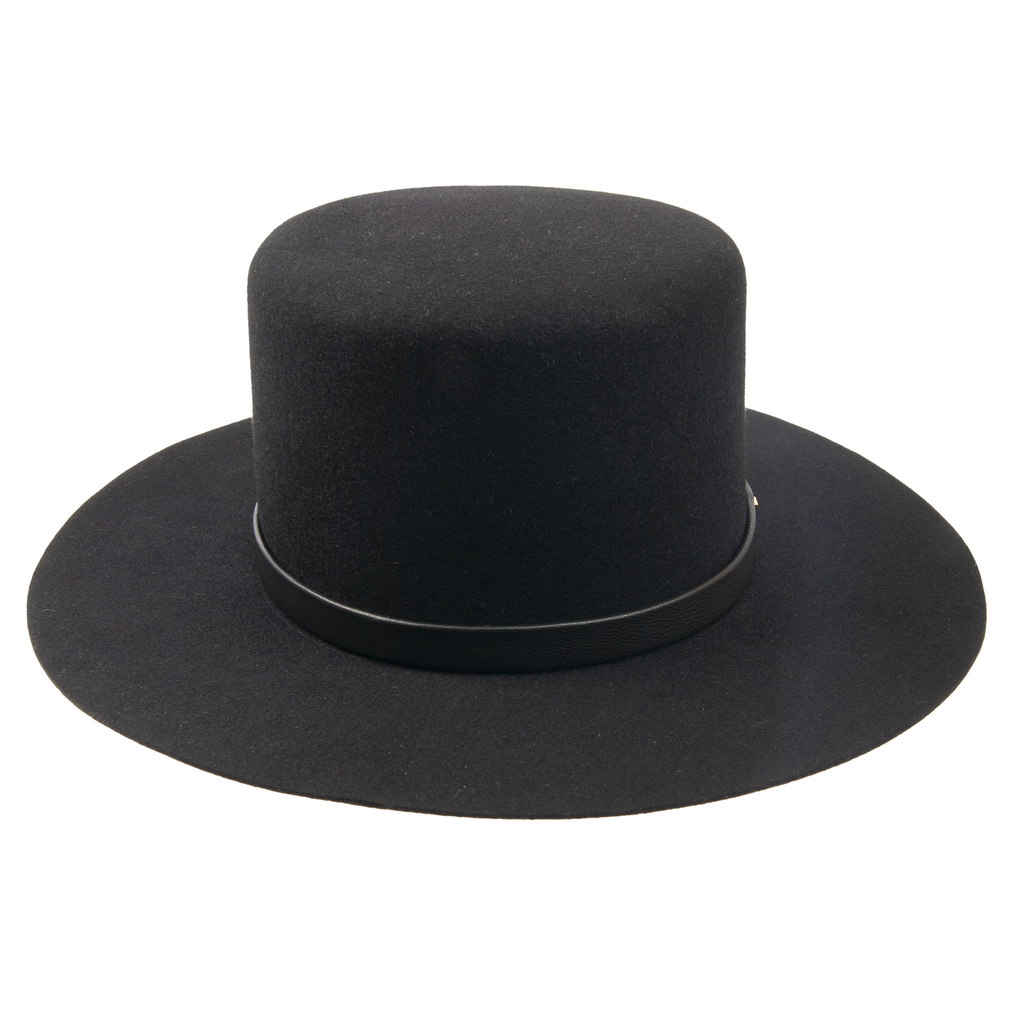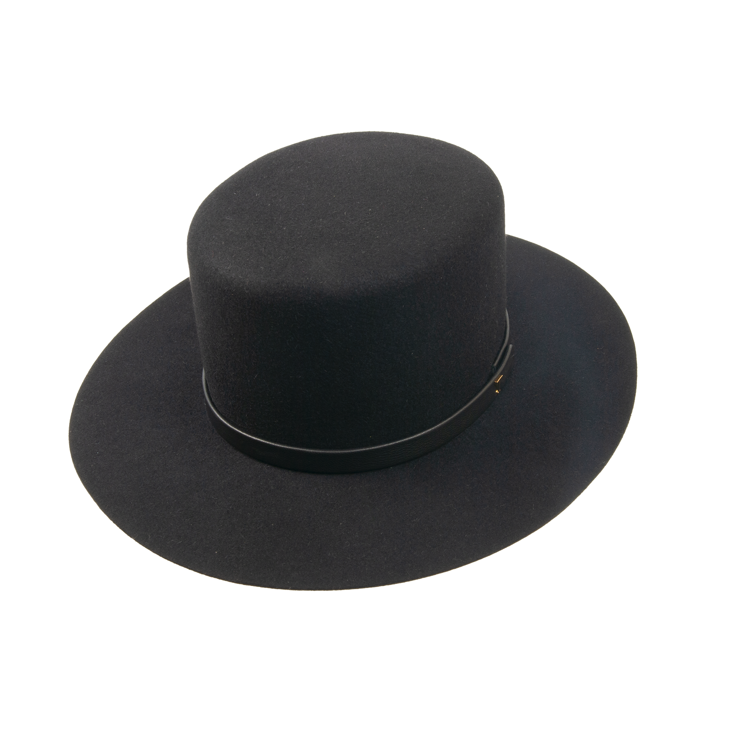 Felt hat with the flat brim trimmed with the leather strap. It has fabric sweat band, the width of the brim 8-8,5 cm. It contains non-textile parts of animal origin.