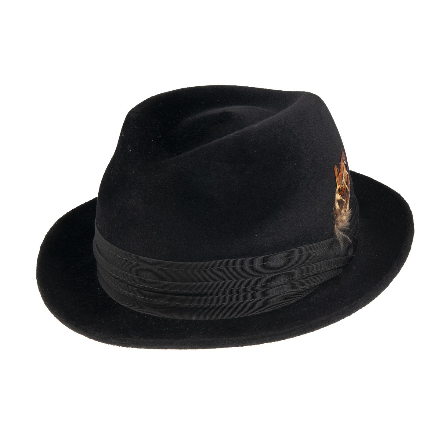 Luxury velour hat with the lining and leather sweat band. It is trimmed with the ribbon and the feater. Hat contains non-textile parts of animal origin.
