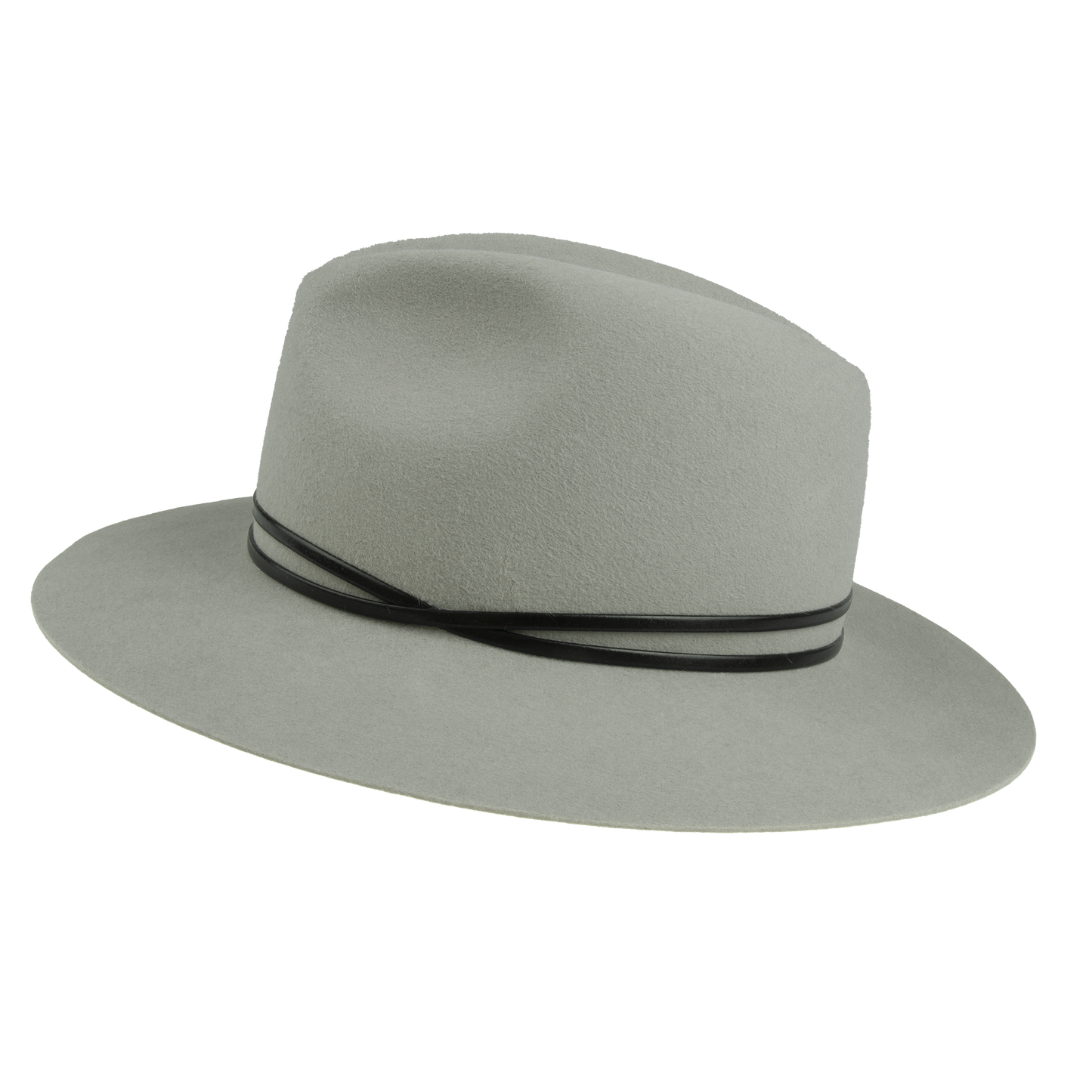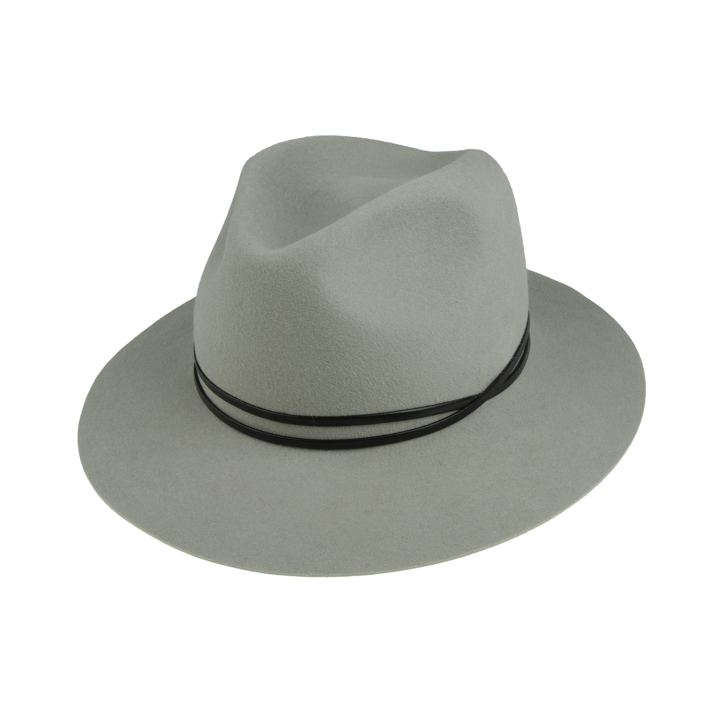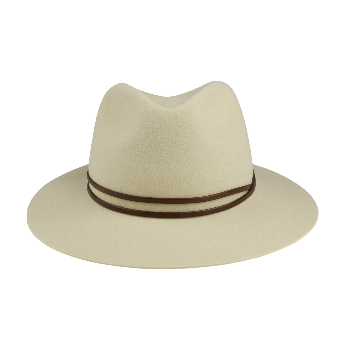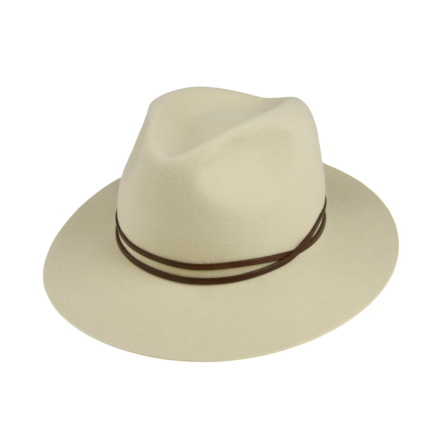 Felt hat trimmed with the leather strap. It has fabric sweat band, the width of the brim 6,5-7 cm. It contains non-textile parts of animal origin.