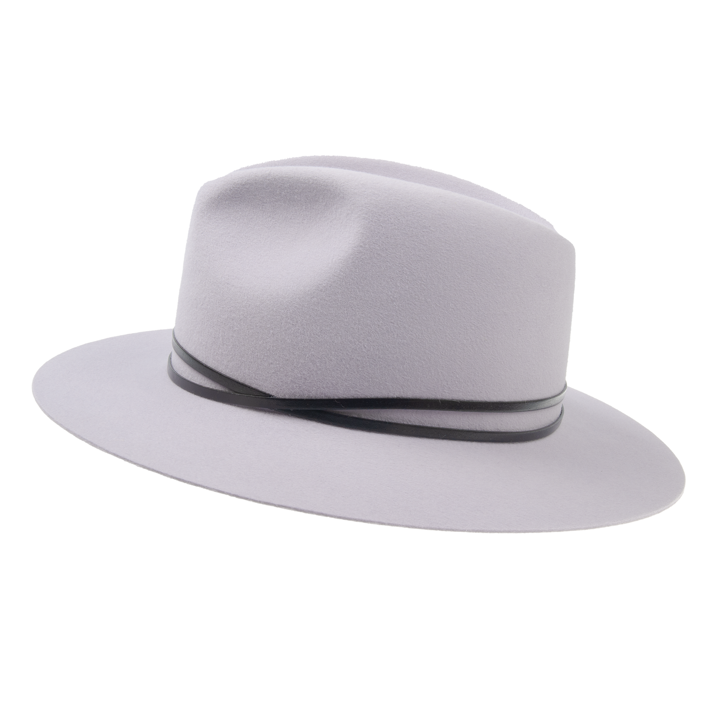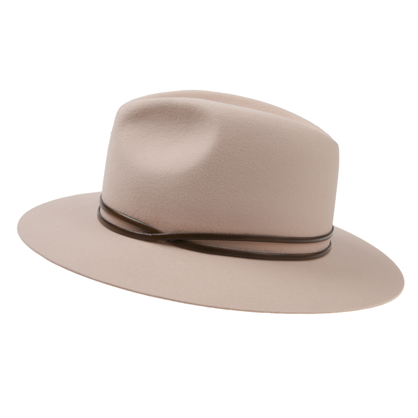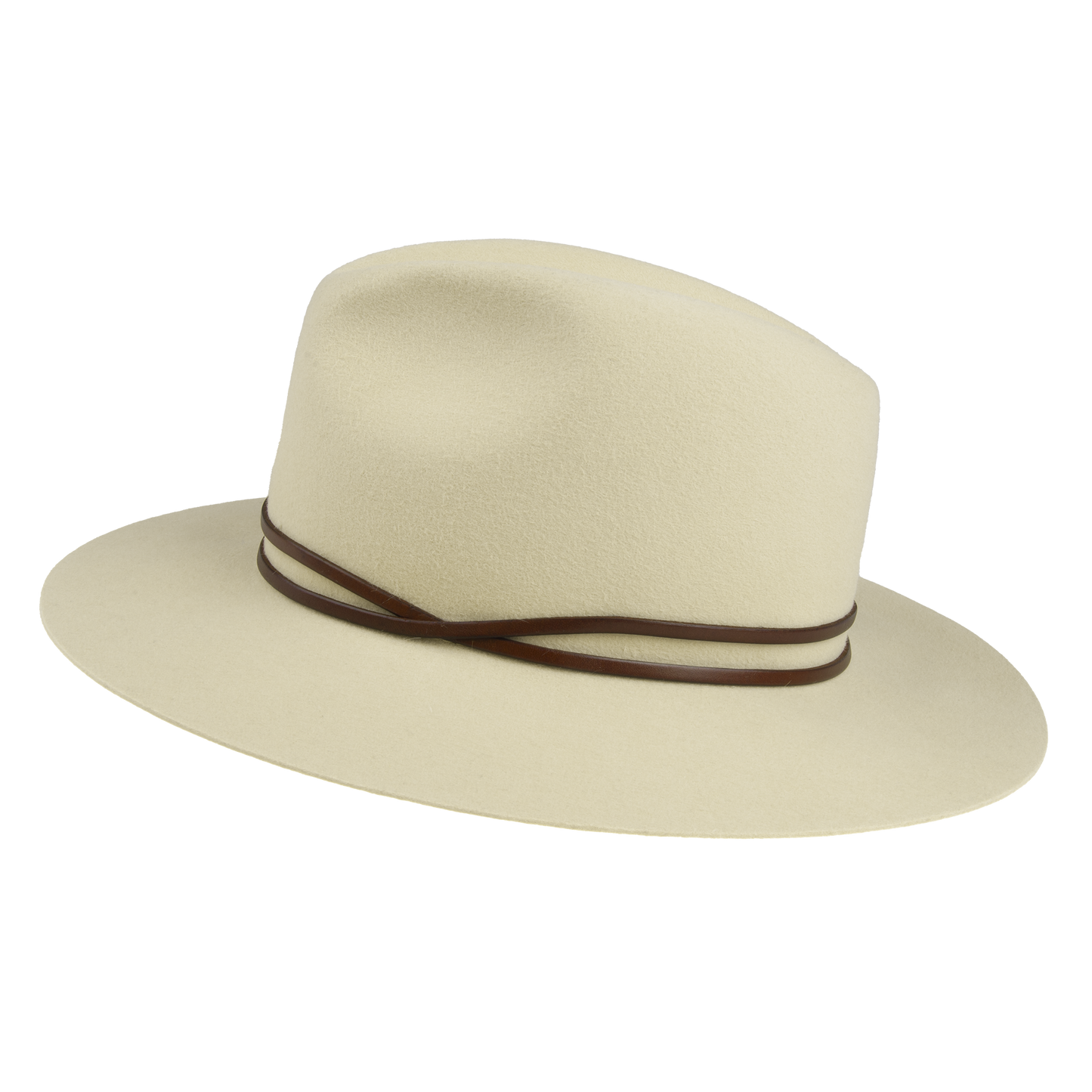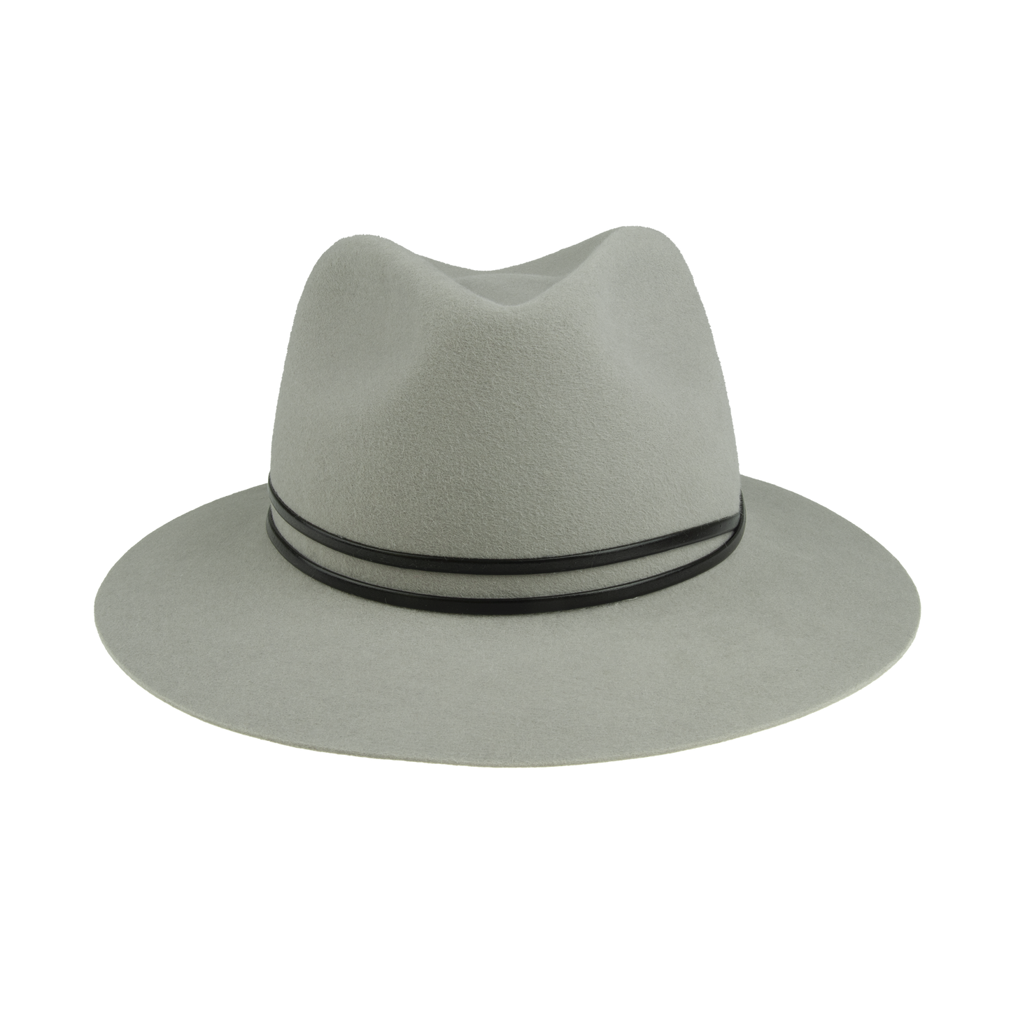 Felt hat trimmed with the leather strap. It has fabric sweat band, the width of the brim 6,5-7 cm. It contains non-textile parts of animal origin.