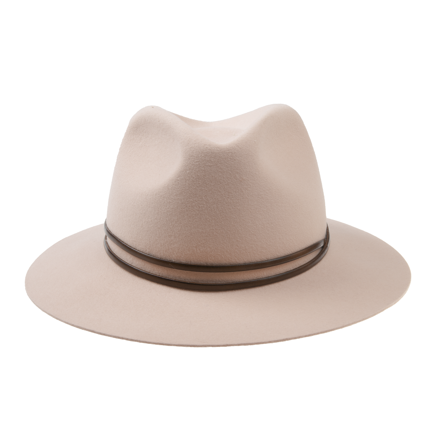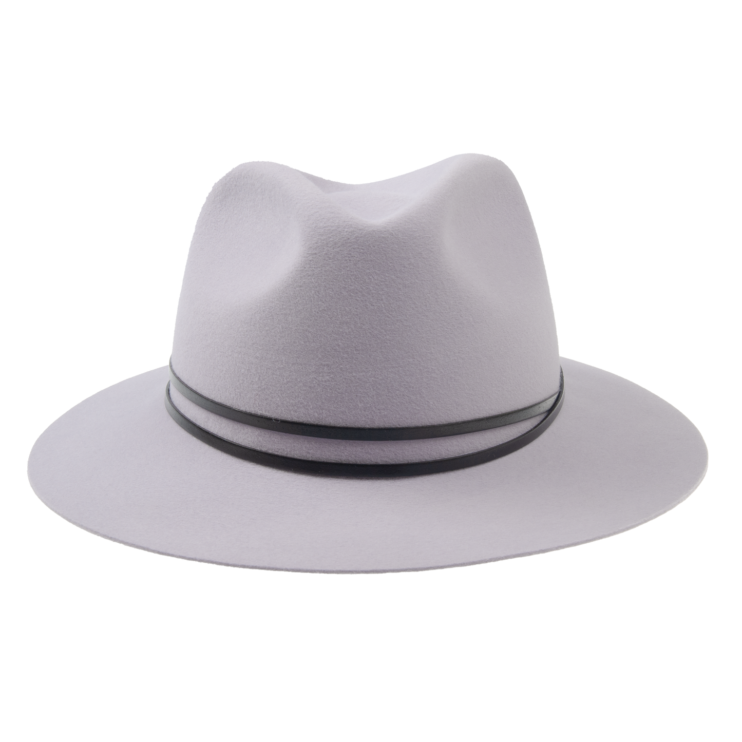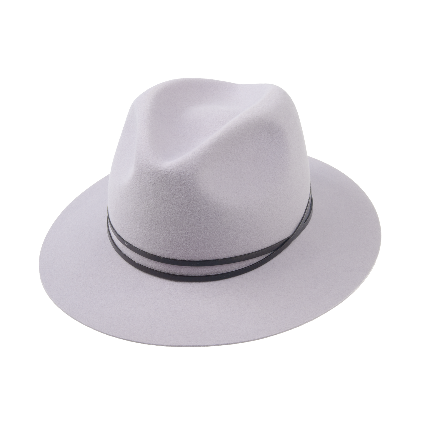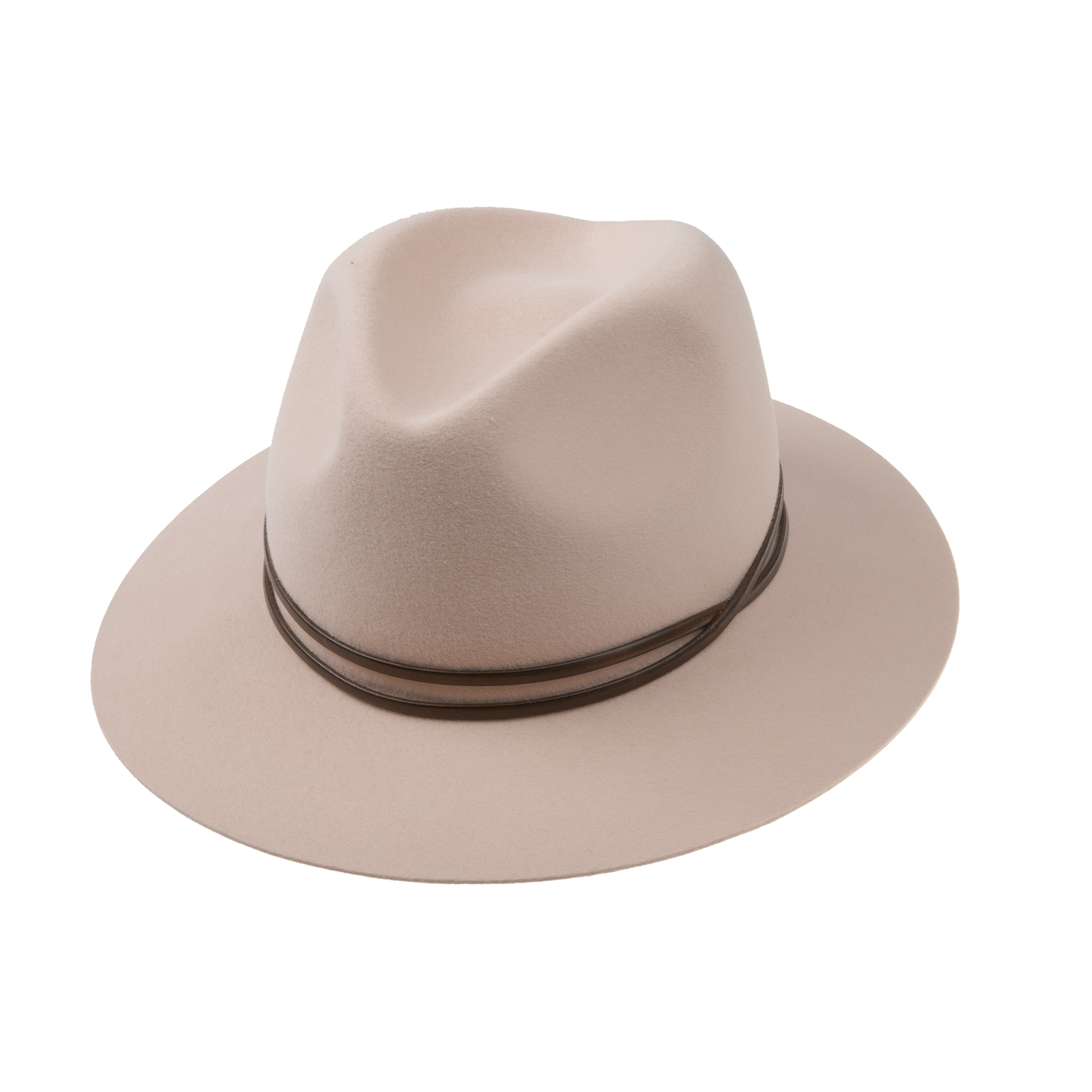 Felt hat trimmed with the leather strap. It has fabric sweat band, the width of the brim 6,5-7 cm. It contains non-textile parts of animal origin.