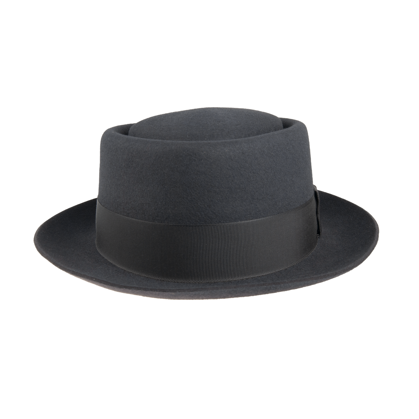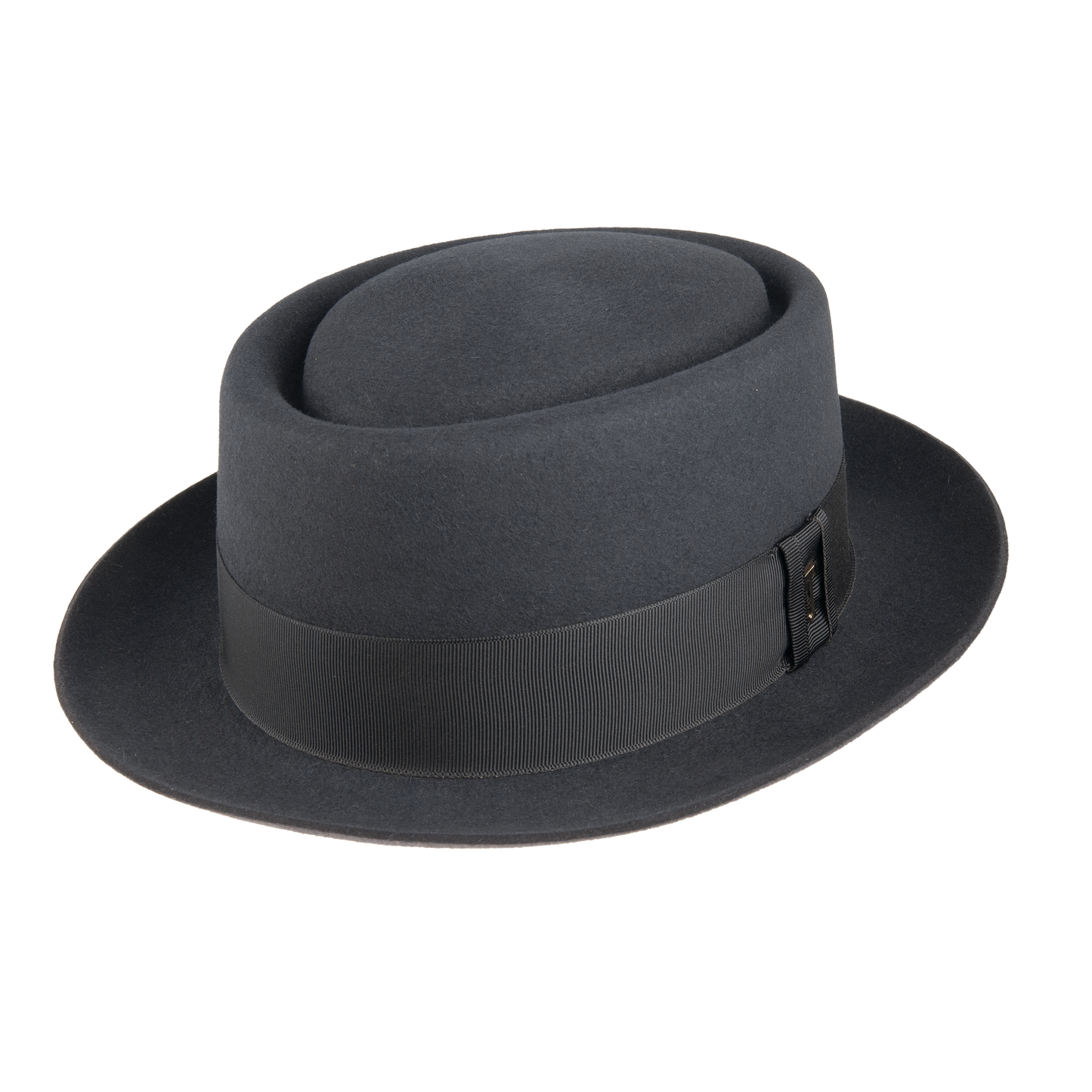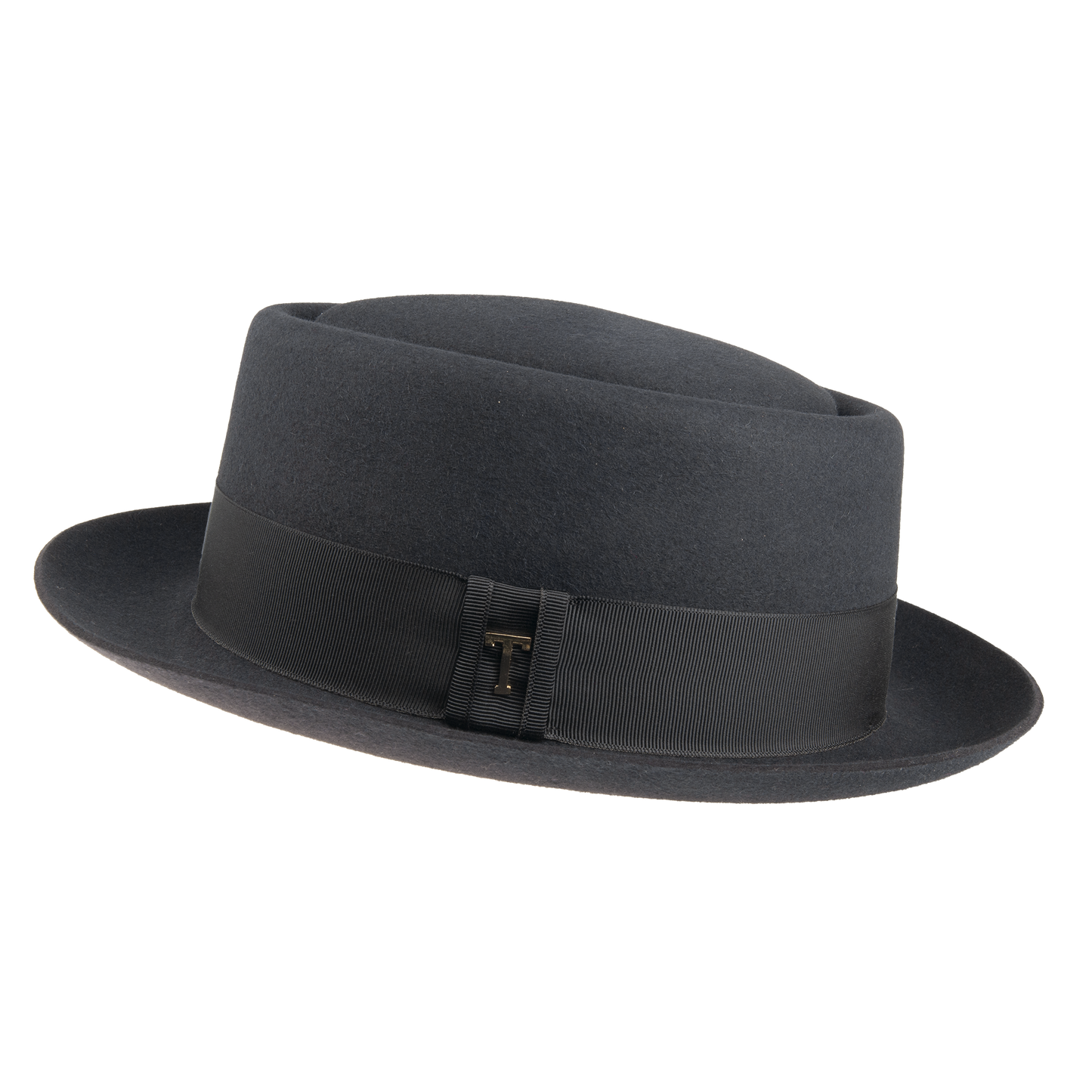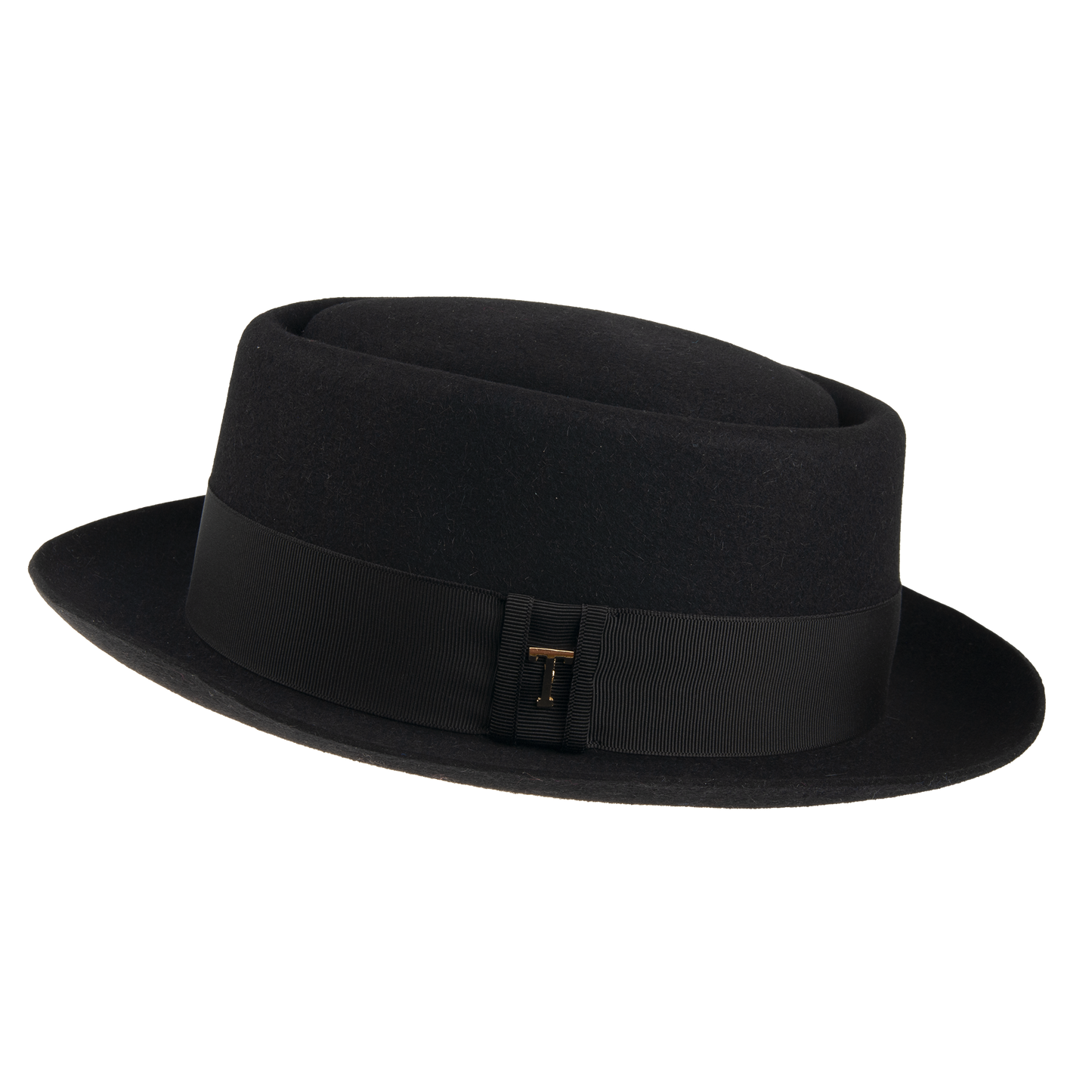 Classic black hat in the popular pork pie shape never going out of fashion. It combines like a dream, it may be worn on low the forehead or just on the top. It has simple tone-on-tone decoration and a gold T-pin. Waterproof finish is just the icing on the cake.