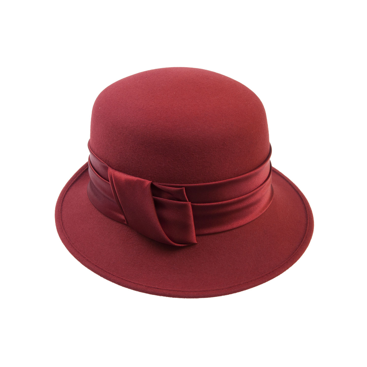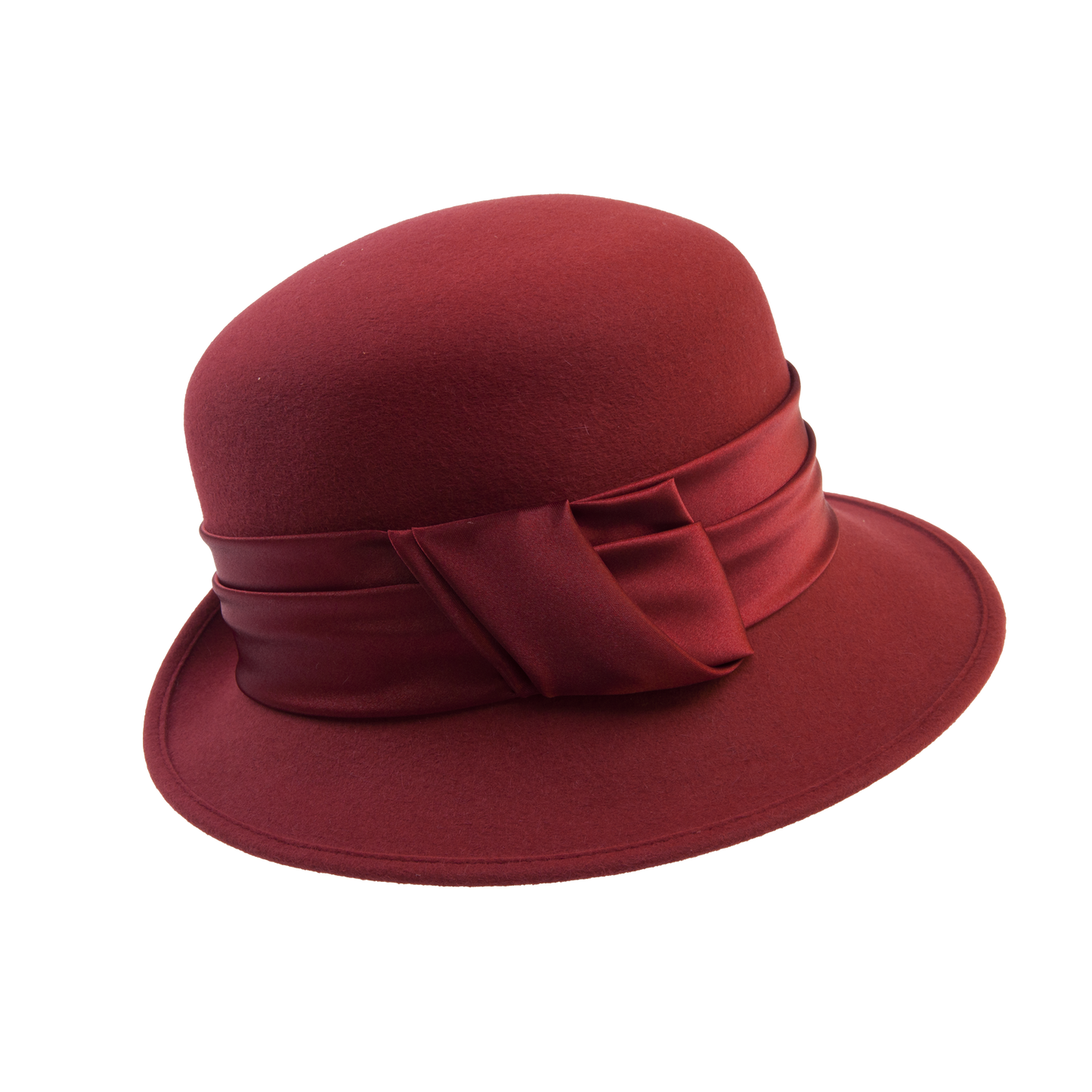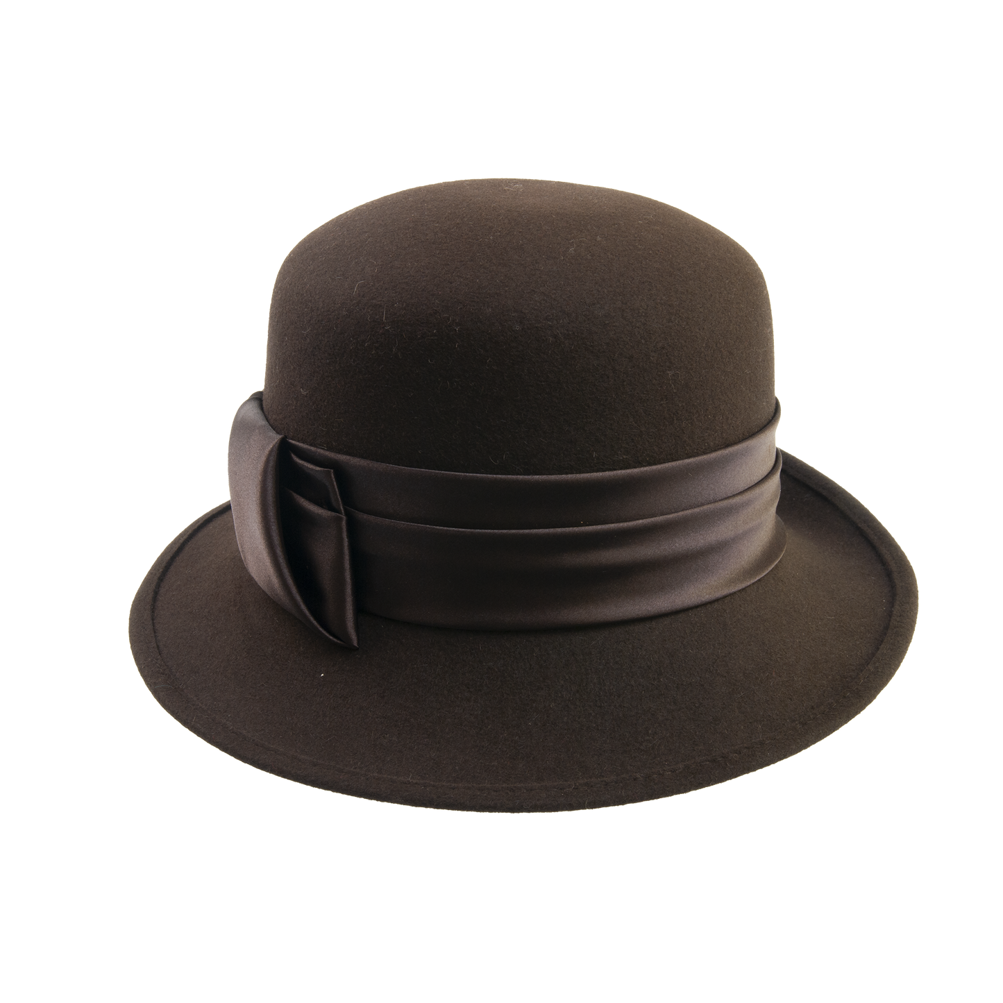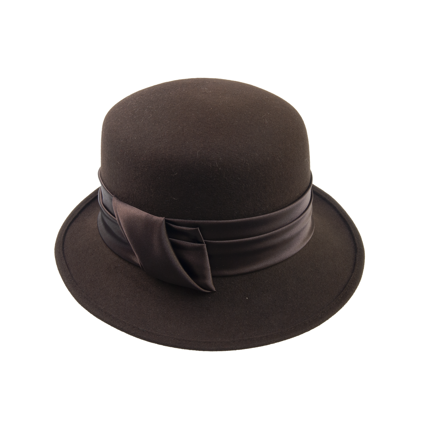 Ladies felt hat with stretch sweatband. The hat is decorated with satin ribbon.