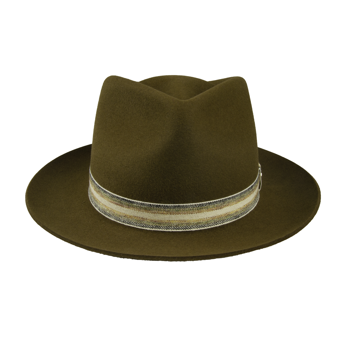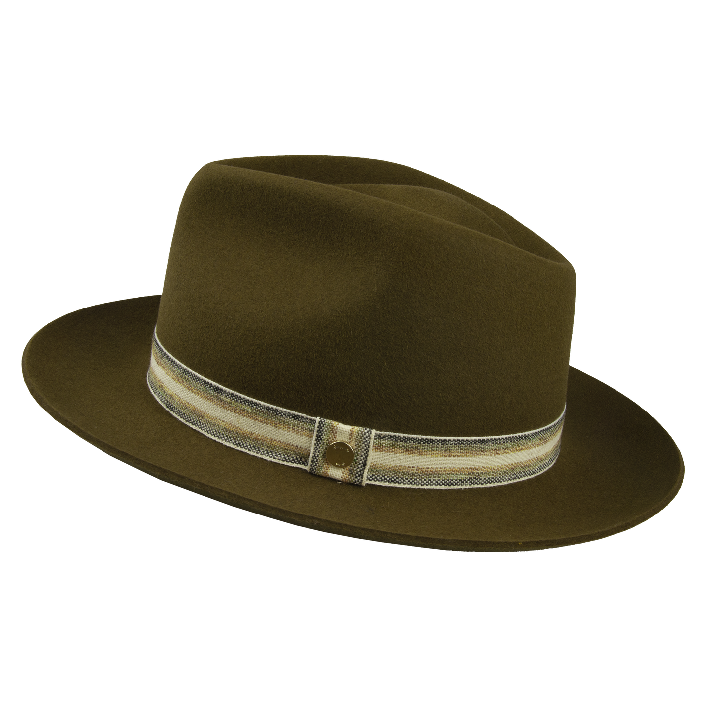 Fedora Mark hat is an accessory with inimitable flair and playful elegance. The hat comes with a partially adjustable brim, which may be worn turned up or down. The hat is decorated with a ribbon in soft tones and a T-pin. The width of the brim is 6,5 cm.